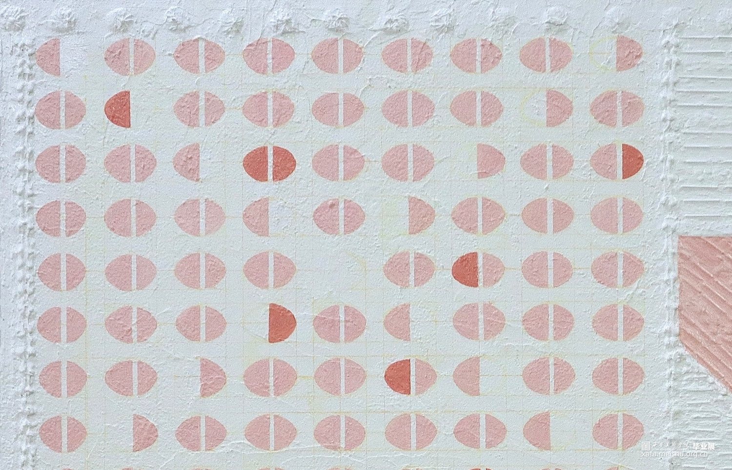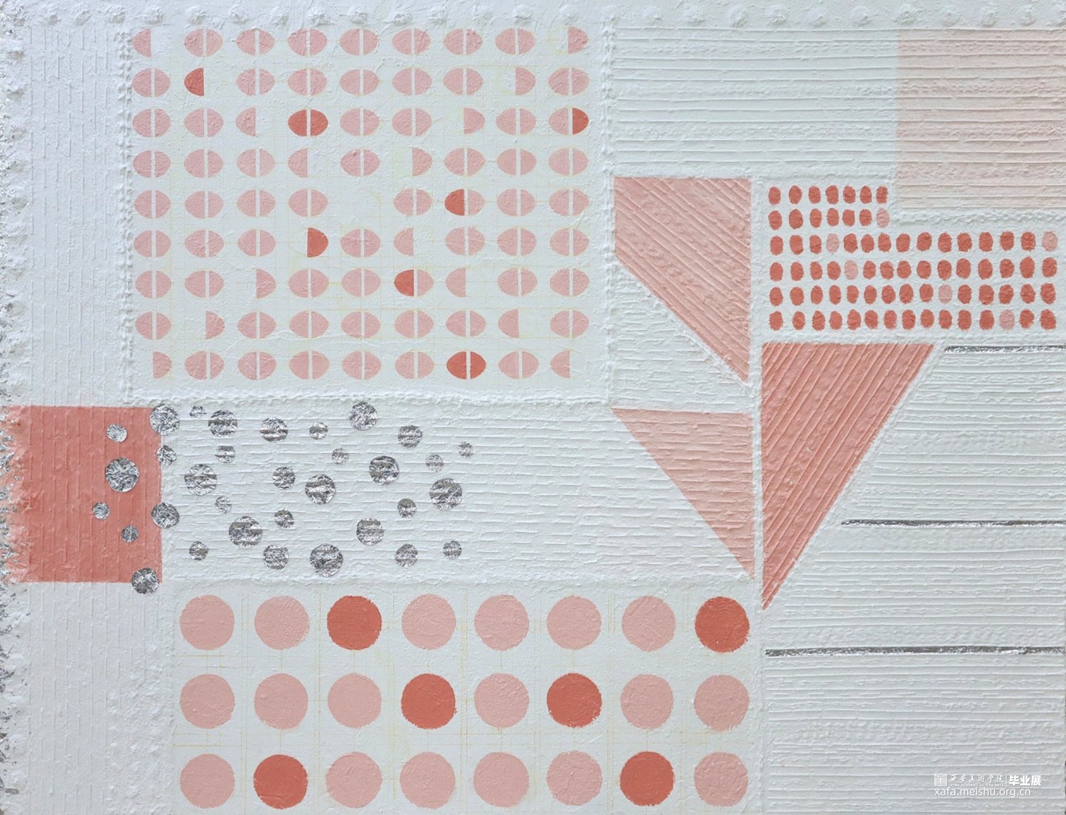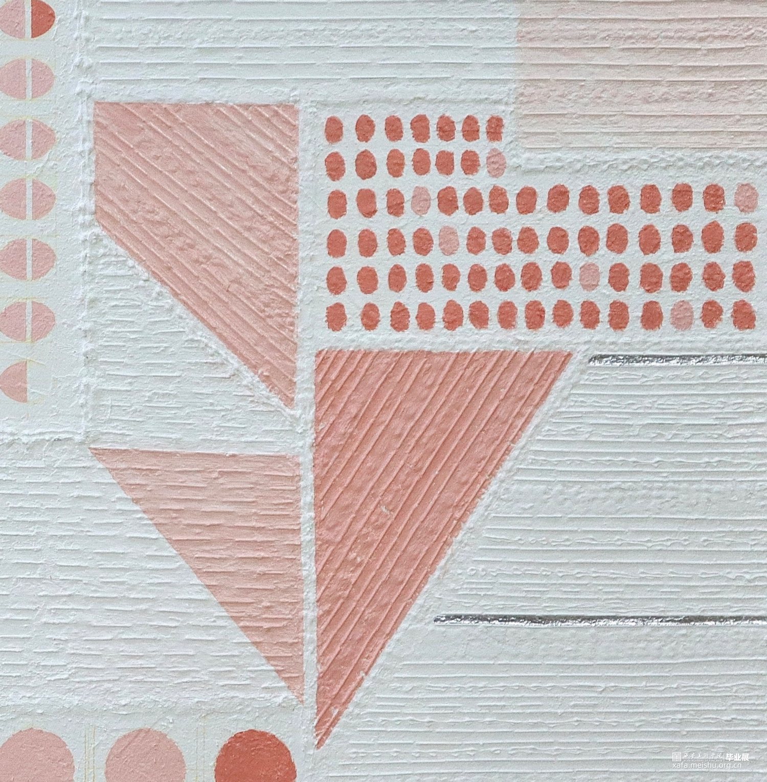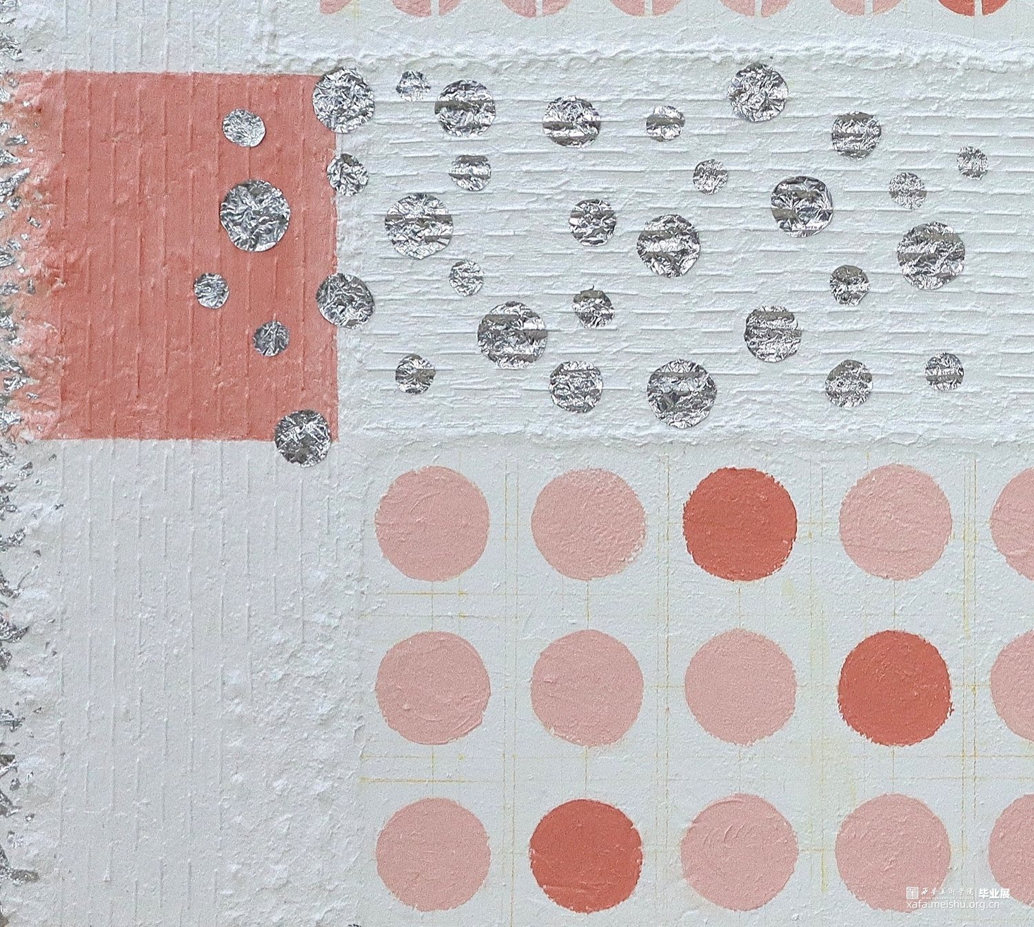 作品以白色为主色调,在画面上研究不同的绘画材料:丙烯,金属铝,塑料棒等等…利用白色丙烯不同的薄厚肌理在画面上进行偶发性的简单涂抹和笔触,再将其他材料层层叠加,或规律或随性,使作品呈现多种面貌。