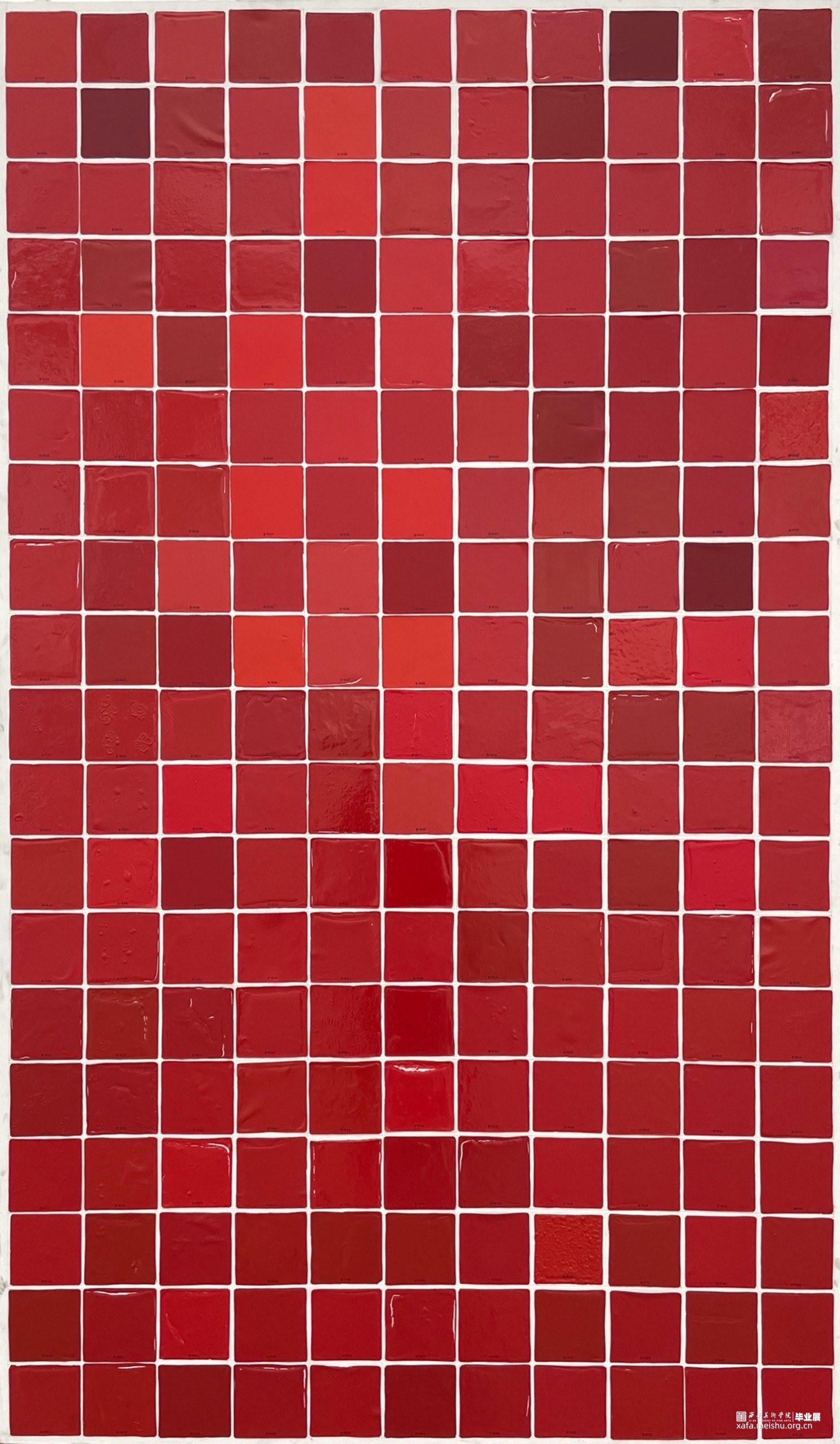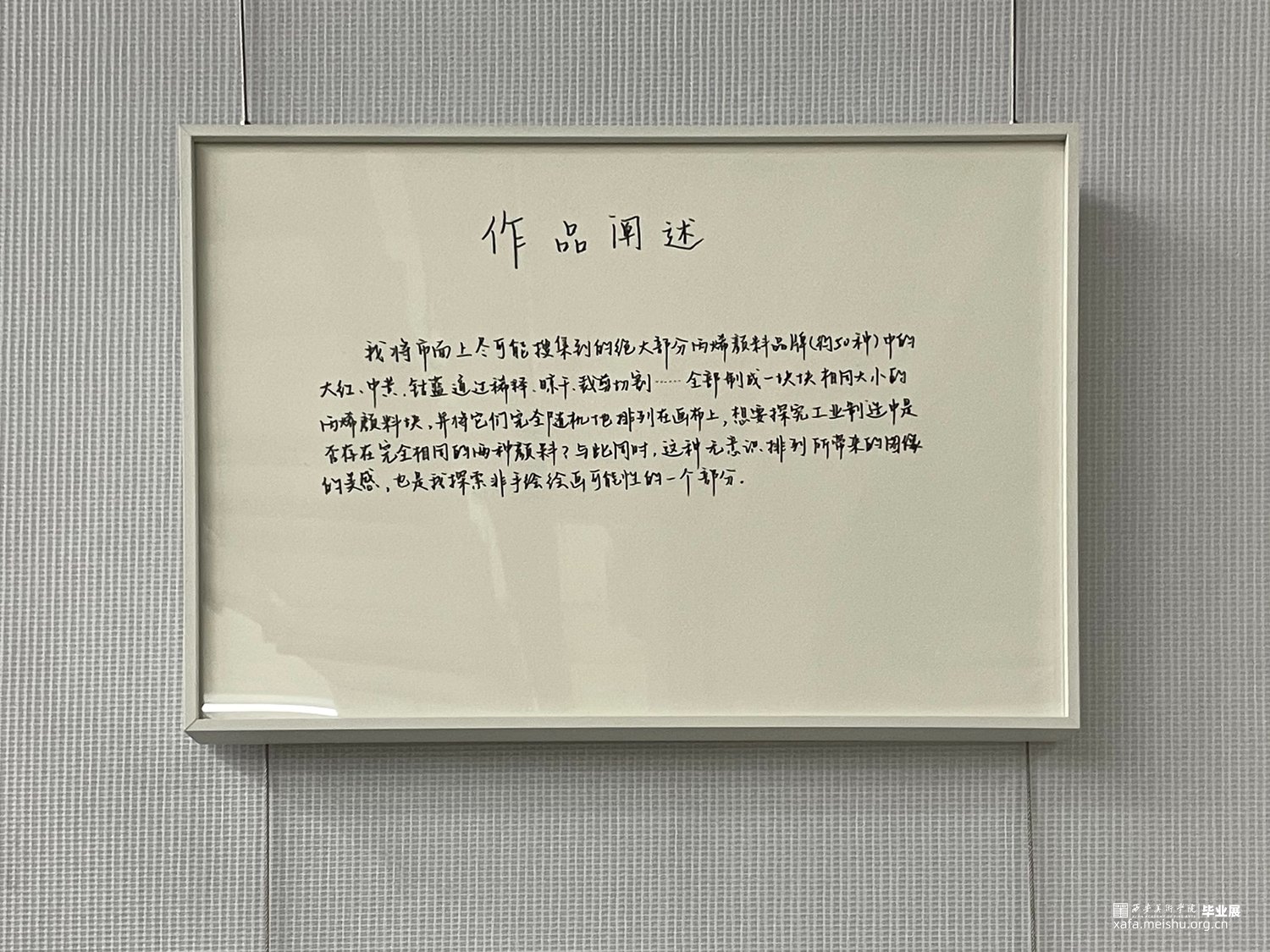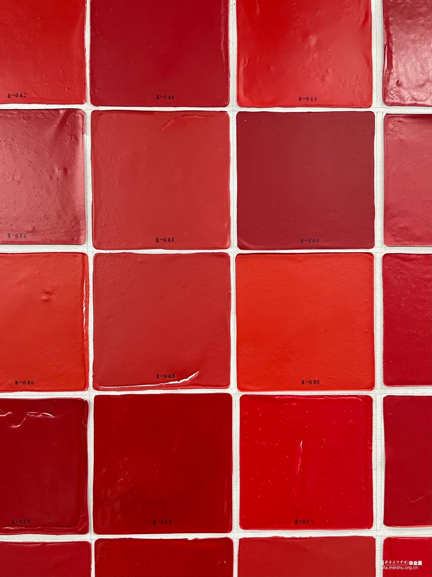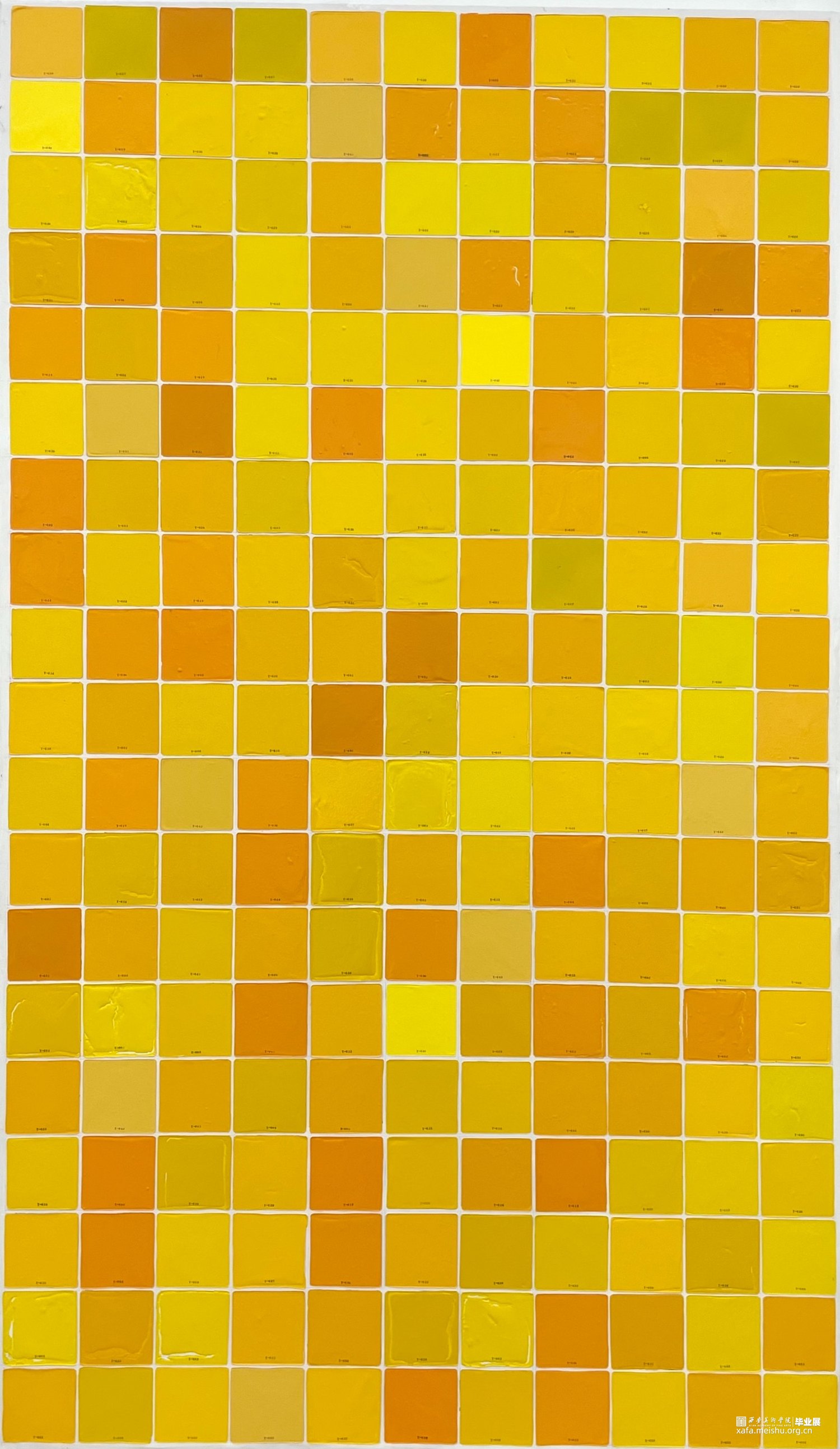 我将市面上尽可能搜集到的绝大部分丙烯颜料品牌(约50种)中的大红、中黄、钴蓝通过稀释、晾干、裁剪切割……全部制成一块块相同大小的丙烯颜料块,并将它们完全随机地排列在画布上,想要探究工业制造中是否存在完全相同的两种颜料?与此同时这种无意识排列所带来的图像的美感,也是我探索非手绘绘画可能性的一个部分。