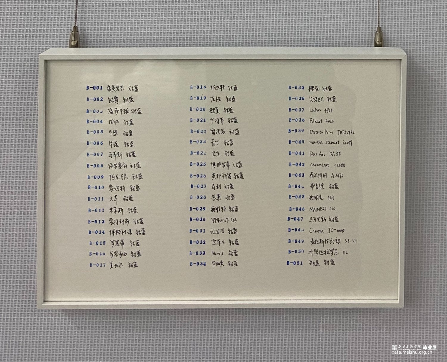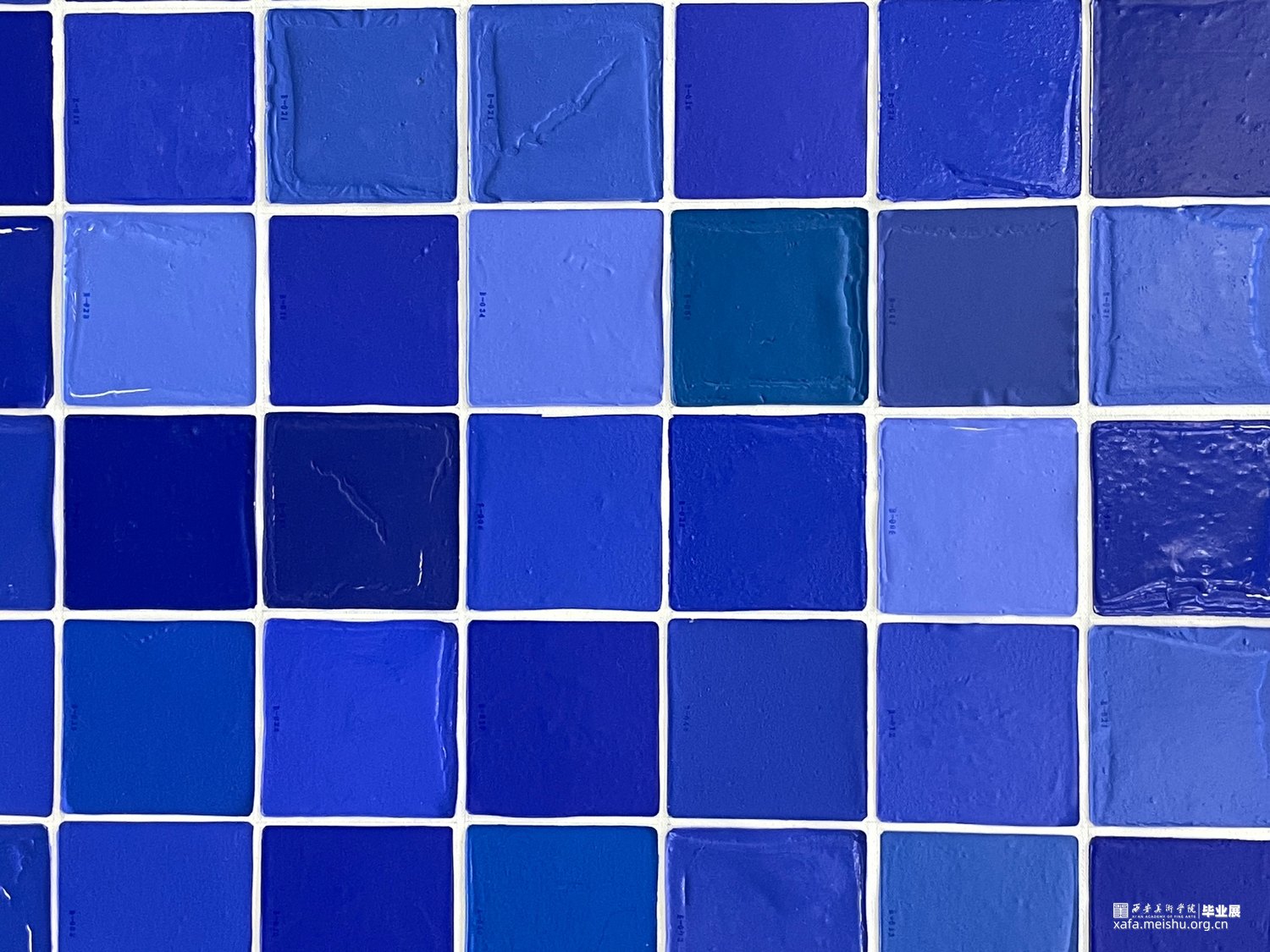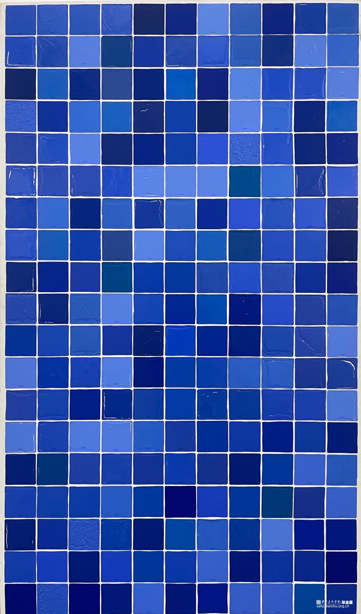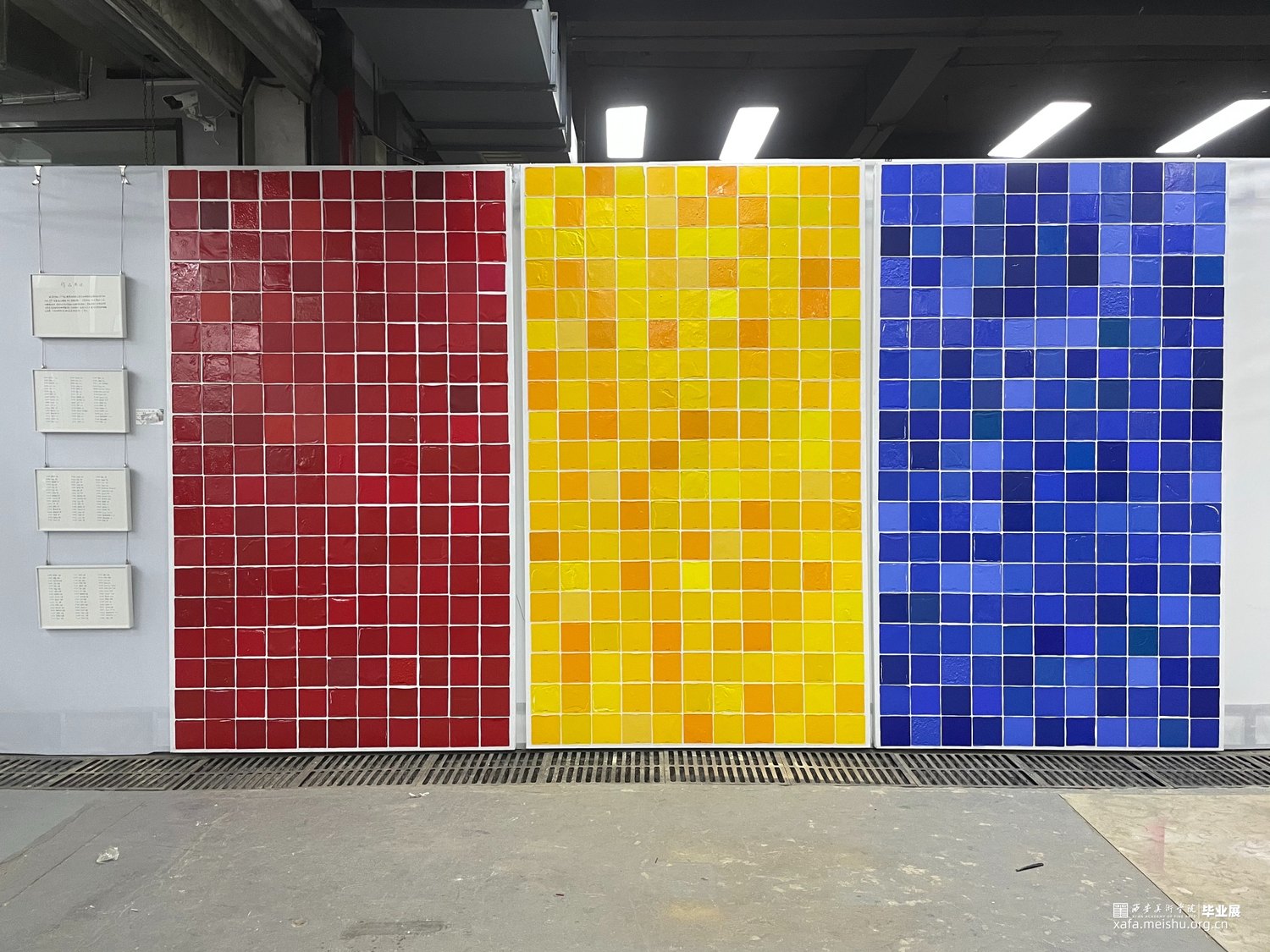我将市面上尽可能搜集到的绝大部分丙烯颜料品牌(约50种)中的大红、中黄、钴蓝通过稀释、晾干、裁剪切割……全部制成一块块相同大小的丙烯颜料块,并将它们完全随机地排列在画布上,想要探究工业制造中是否存在完全相同的两种颜料?与此同时这种无意识排列所带来的图像的美感,也是我探索非手绘绘画可能性的一个部分。