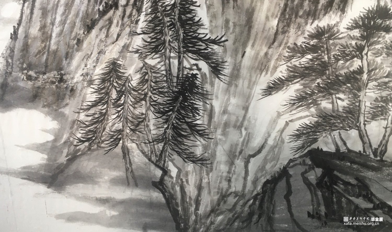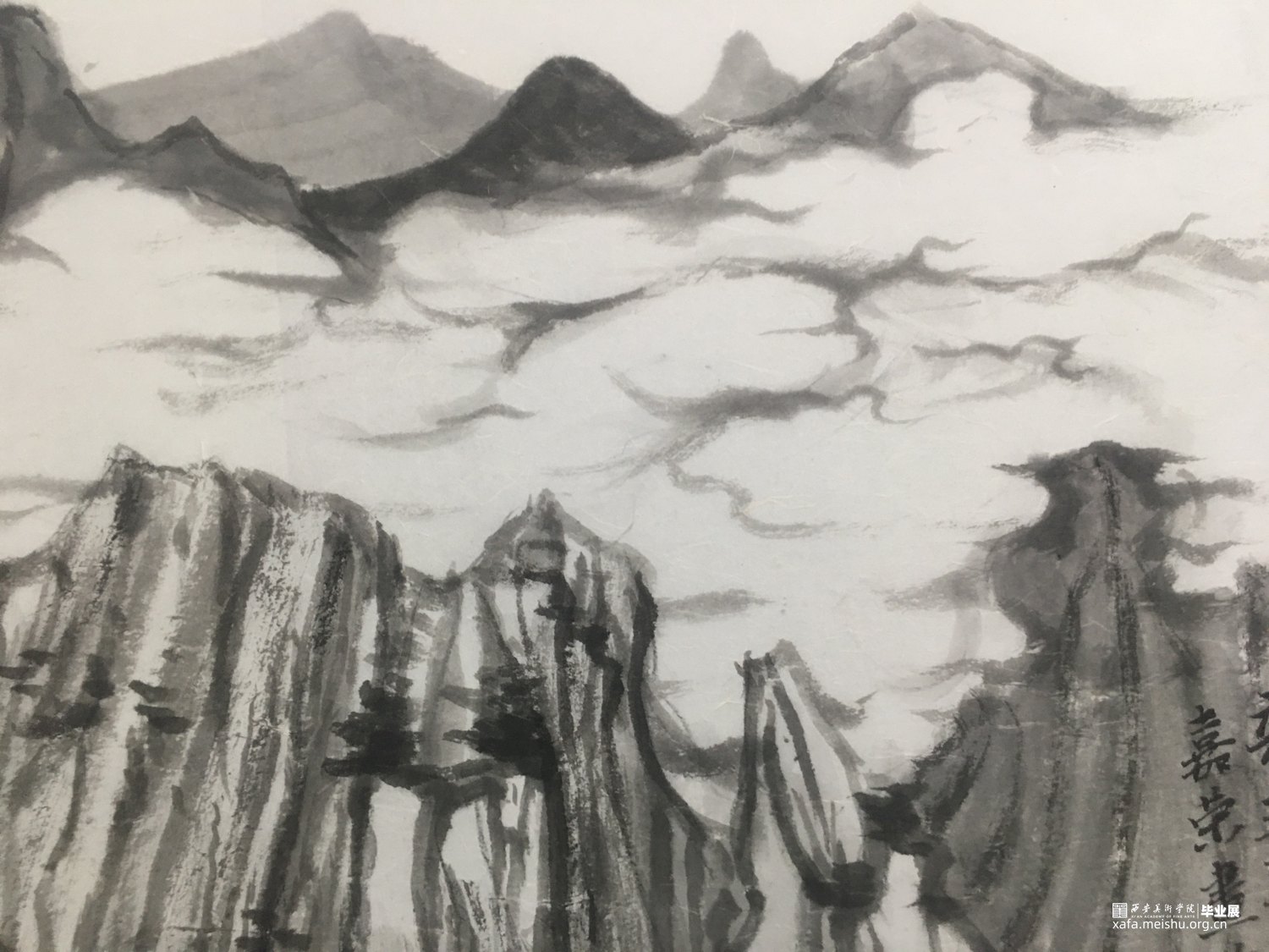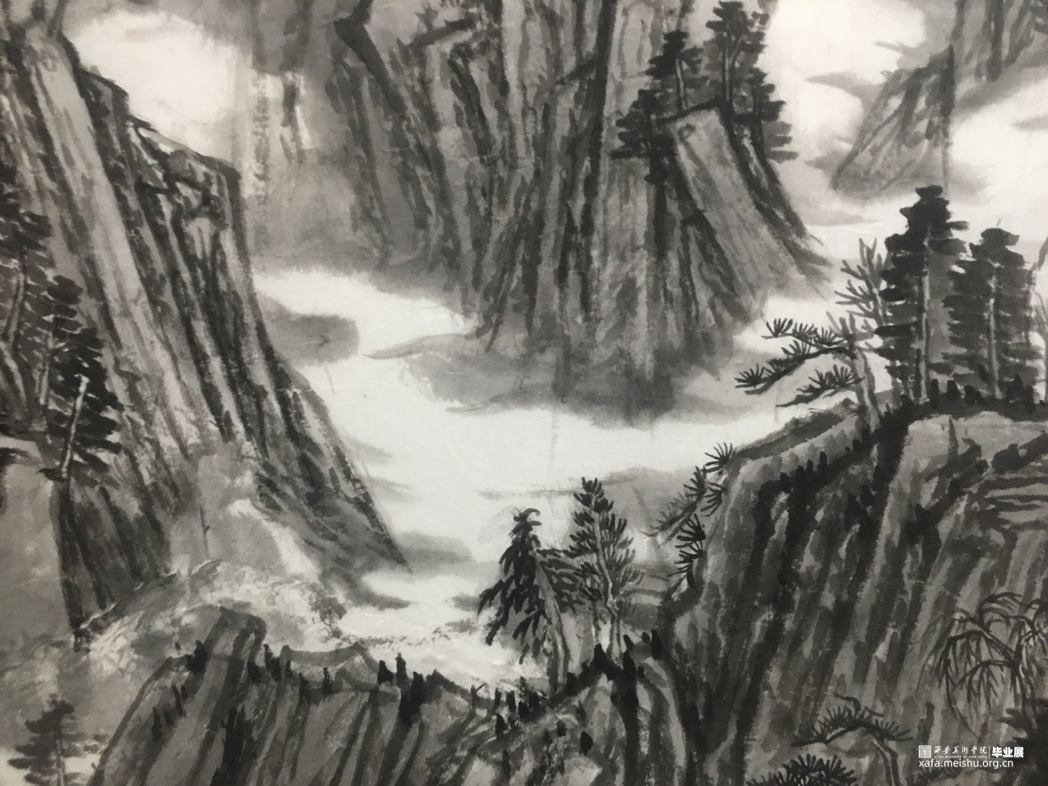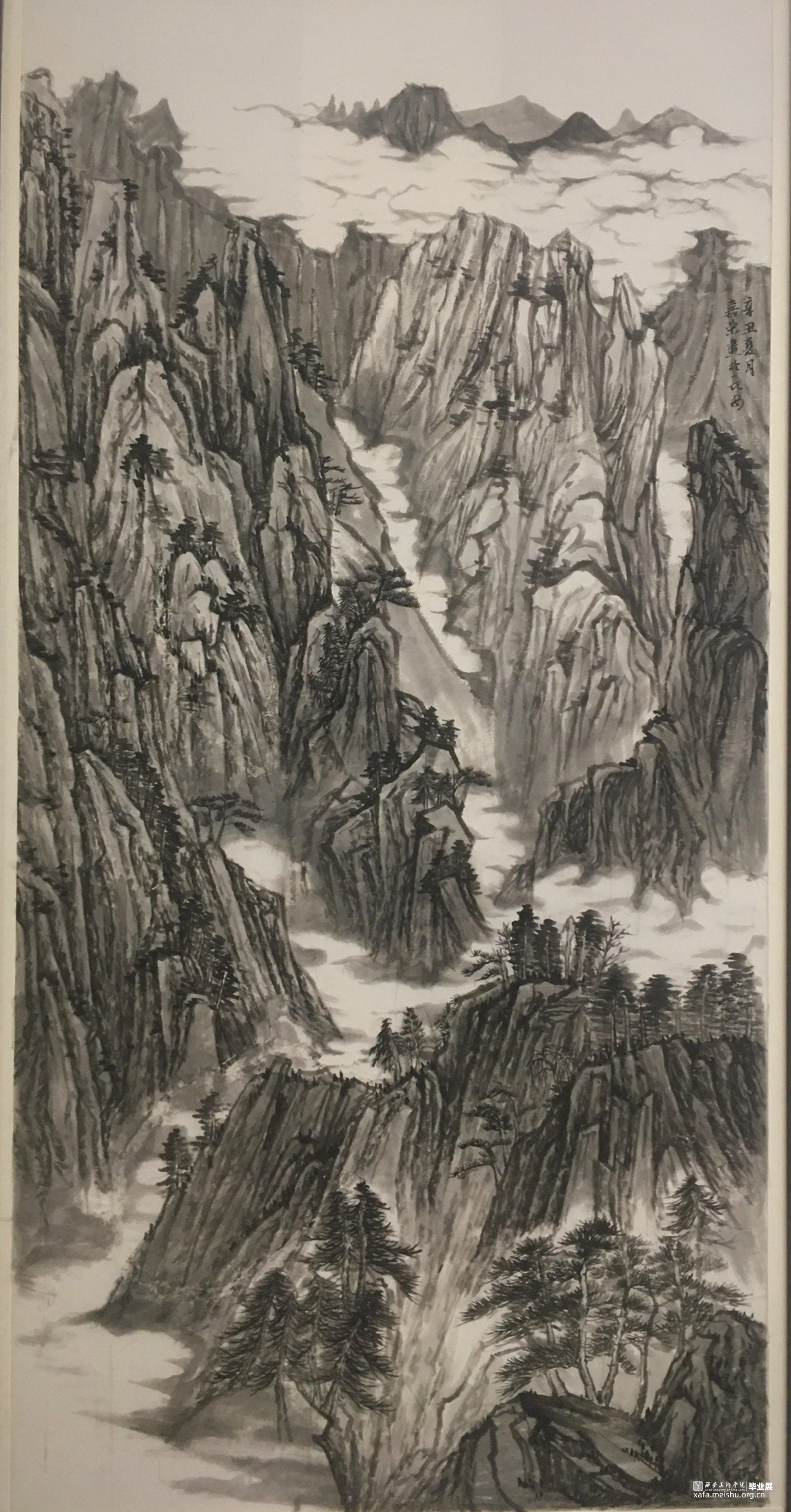澄怀观道 卧以游之 放情丘壑 云泛西海丹轮挂,金涛霞烟幻离奇。云涛夕照映寒林,灵石苍松卧幽谷。远眺玉带曲又折,如练弯弯千万里。山下沟壑深幽险,谷底生烟醉颜容。悬崖千丈壁如削,风云变幻石满目。以水墨形式取材于黄山景象,放情丘壑、意高迹远、含道映物。