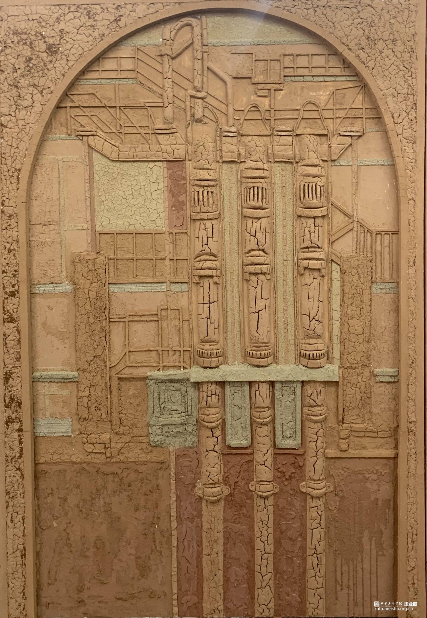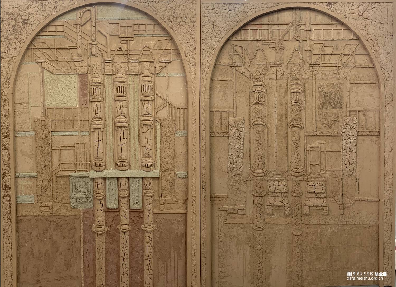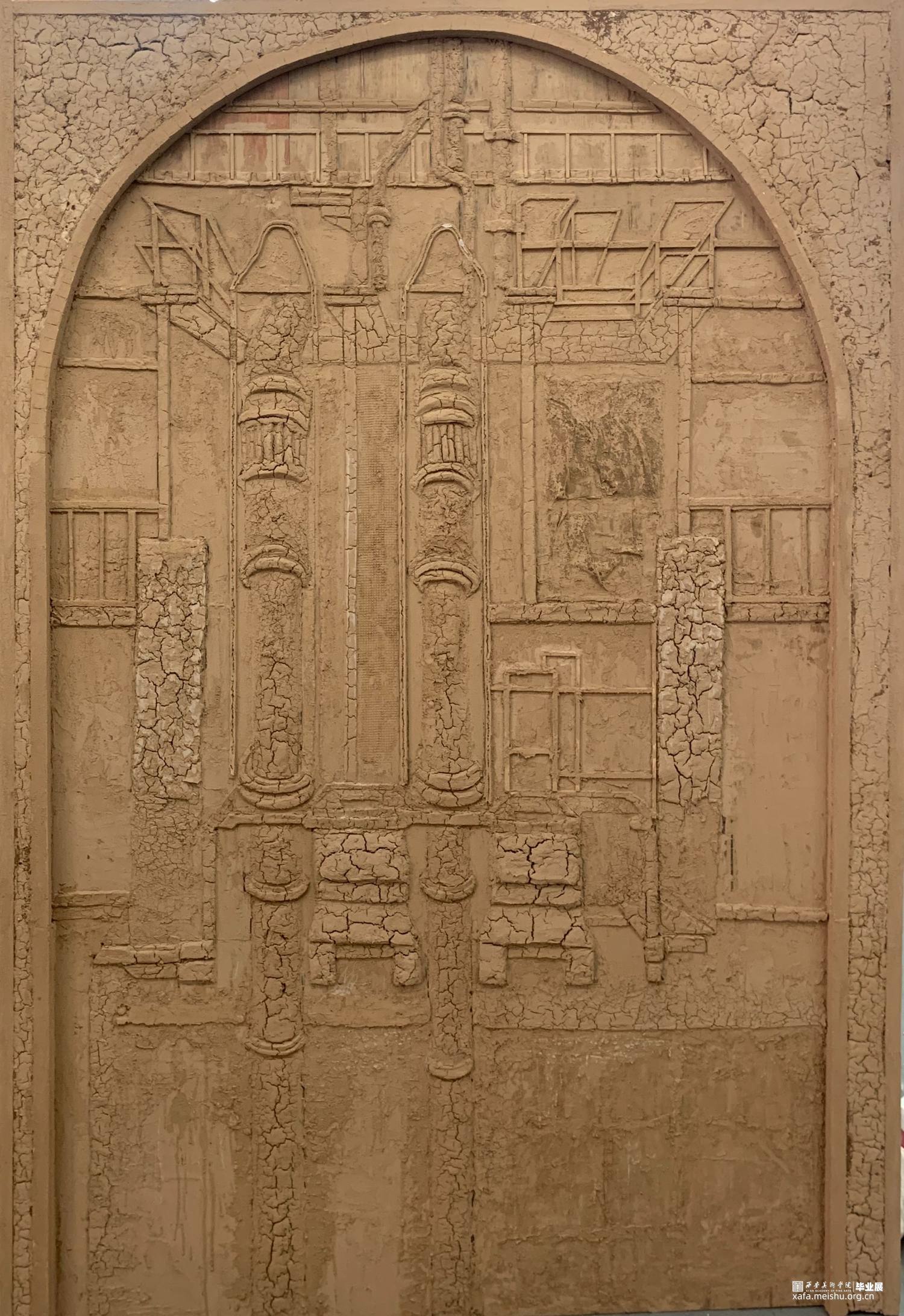 作品用了黄土、石粉等材料,在创作过程中外形用了陕北窑洞的造型,画心是废弃的工厂。通过对土材料的研究,表现画面的裂痕机理效果。作品是以我的家乡为时代背景,在现代工业文明发展过程中那些废弃的工厂,也曾经给时代的发展做出了贡献。这也是我们的记忆结点,我是一个比较留恋过去的人,所以我通过对残留的时代见证遗产,来表达我对我对过去生活的留恋。用作品的破碎感来拼贴人们对那个时代的回忆。
