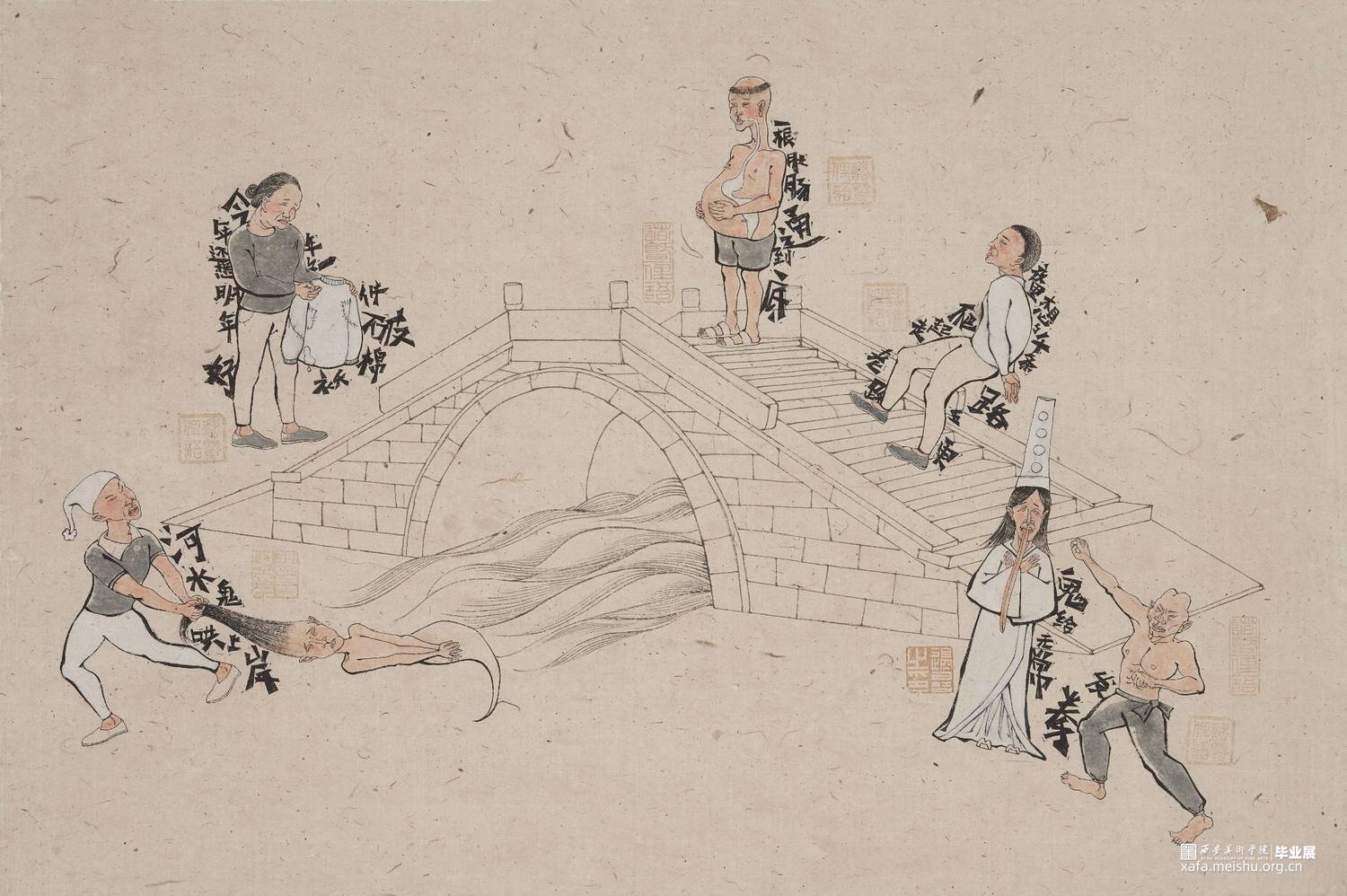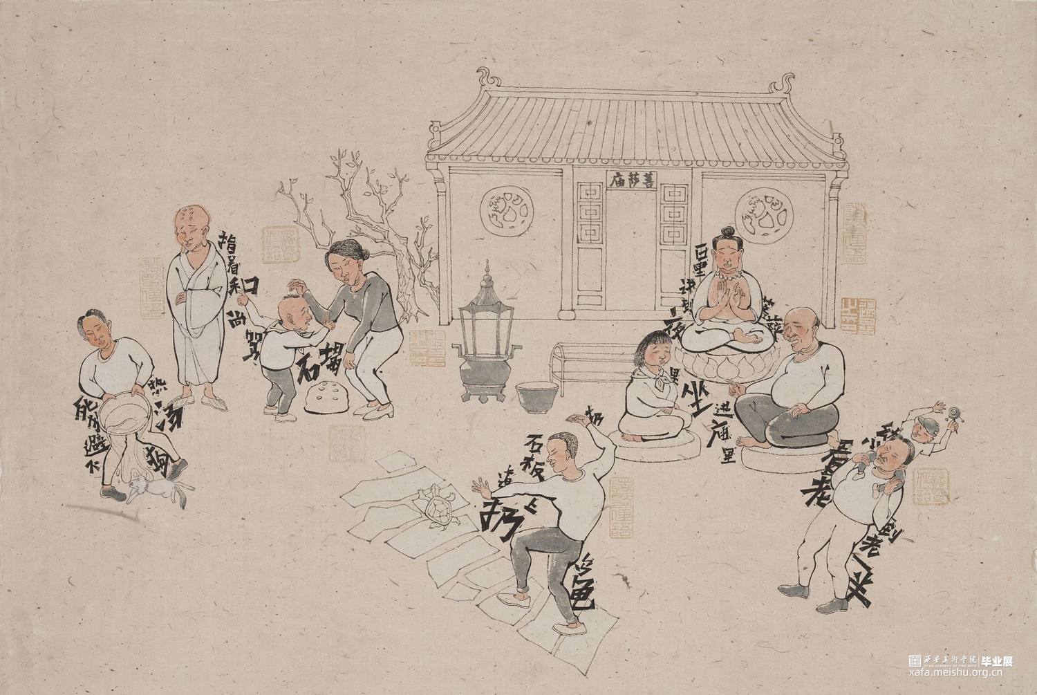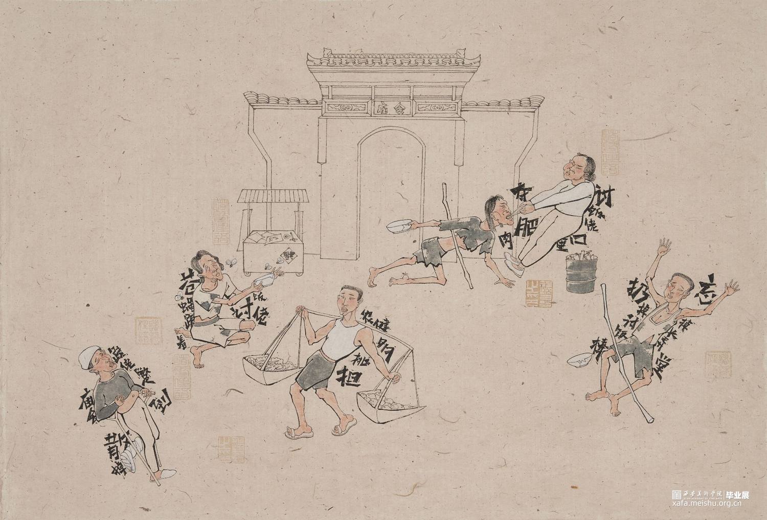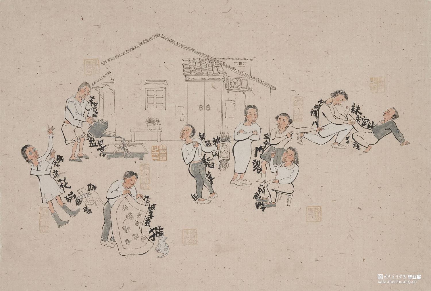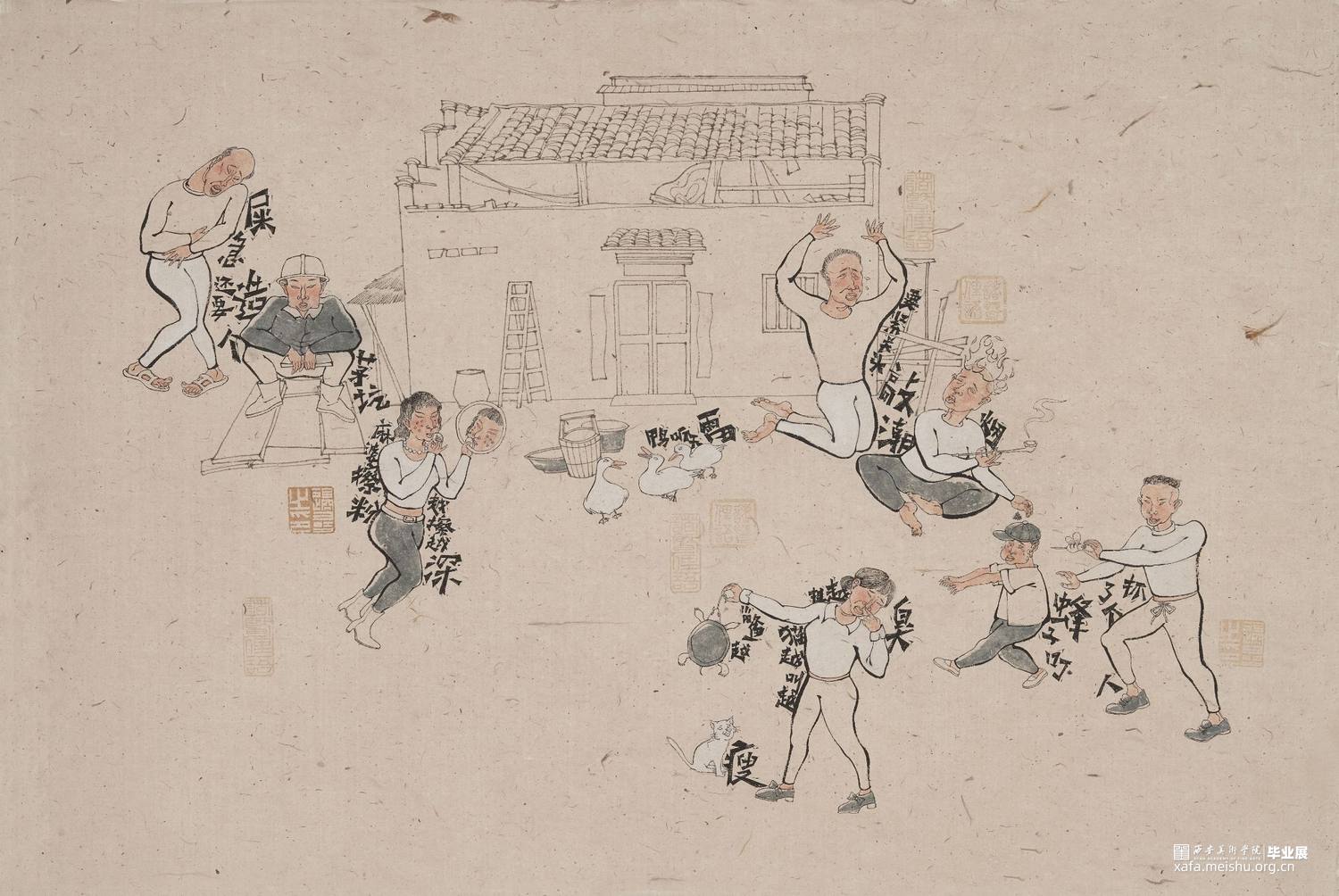 我的毕业创作是根据自己家乡诸暨的俚语为基础,研究俗谚文字转图像的可行性。为了能够将古越地区诸暨的风俗文化较为有趣地介绍给观看者,将国画技法与版画语言相结合,分析了诸暨方言俗语的表面含义与应用场景相结合所展现出的趣味性以及生动性,然后进行创作。将文与画相结合,把俗语文字也当作画面的一部分,让文字也变成图像的一部分与人物绘画共同直观地映入观者眼中,并产生关注感,而这份兴趣就是对我作品最大的鼓励。