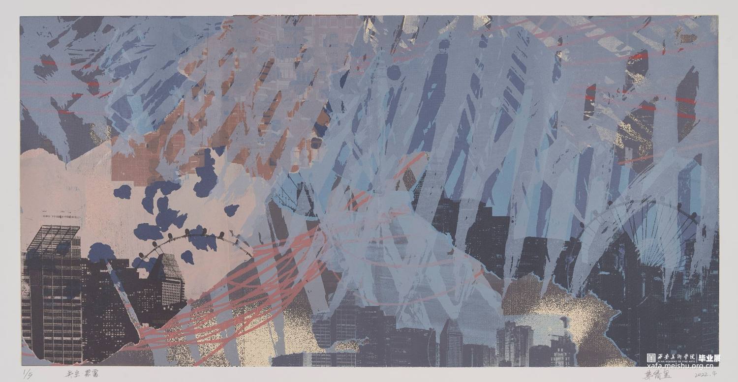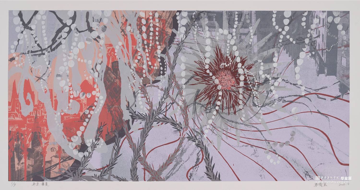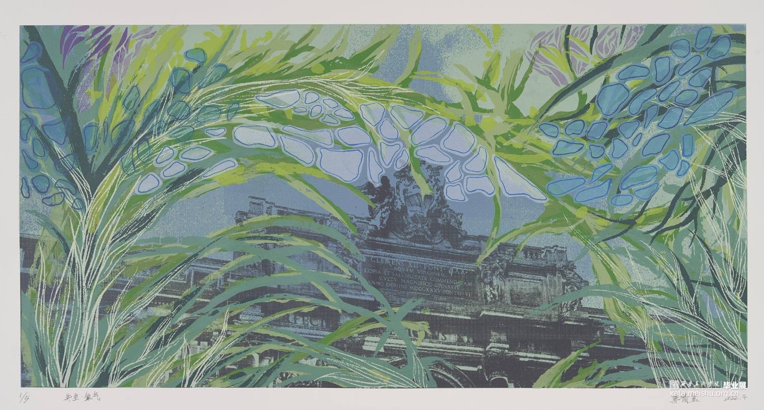 《共生》系列作品以丝网版画的形式呈现,将想象与现实结合,通过放大自然植物的恣意生长,与现实生活中“人为置入”的建筑同置于一个环境里,给予它们“共生”的空间,表达了我在生态问题与环境污染频发的当下,对这段生态关系中作为“工业生命”的建筑与自然植物能否共生共存的思考。该系列作品均通过套印二十余版颜色以调整画面层次,运用手绘感光语言和影像感光语言,结合网上直接制版等技法完成;画面中的色彩为存于幻想的植物带来无限的生命力,灰色的工业建筑又诉说了不可争的事实,表达出作品“对立统一”的观念。
