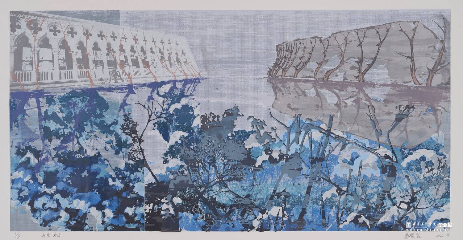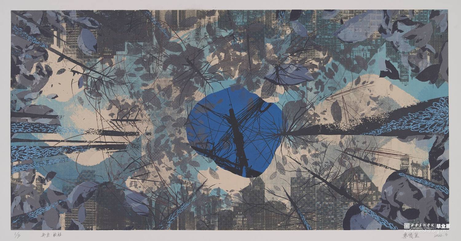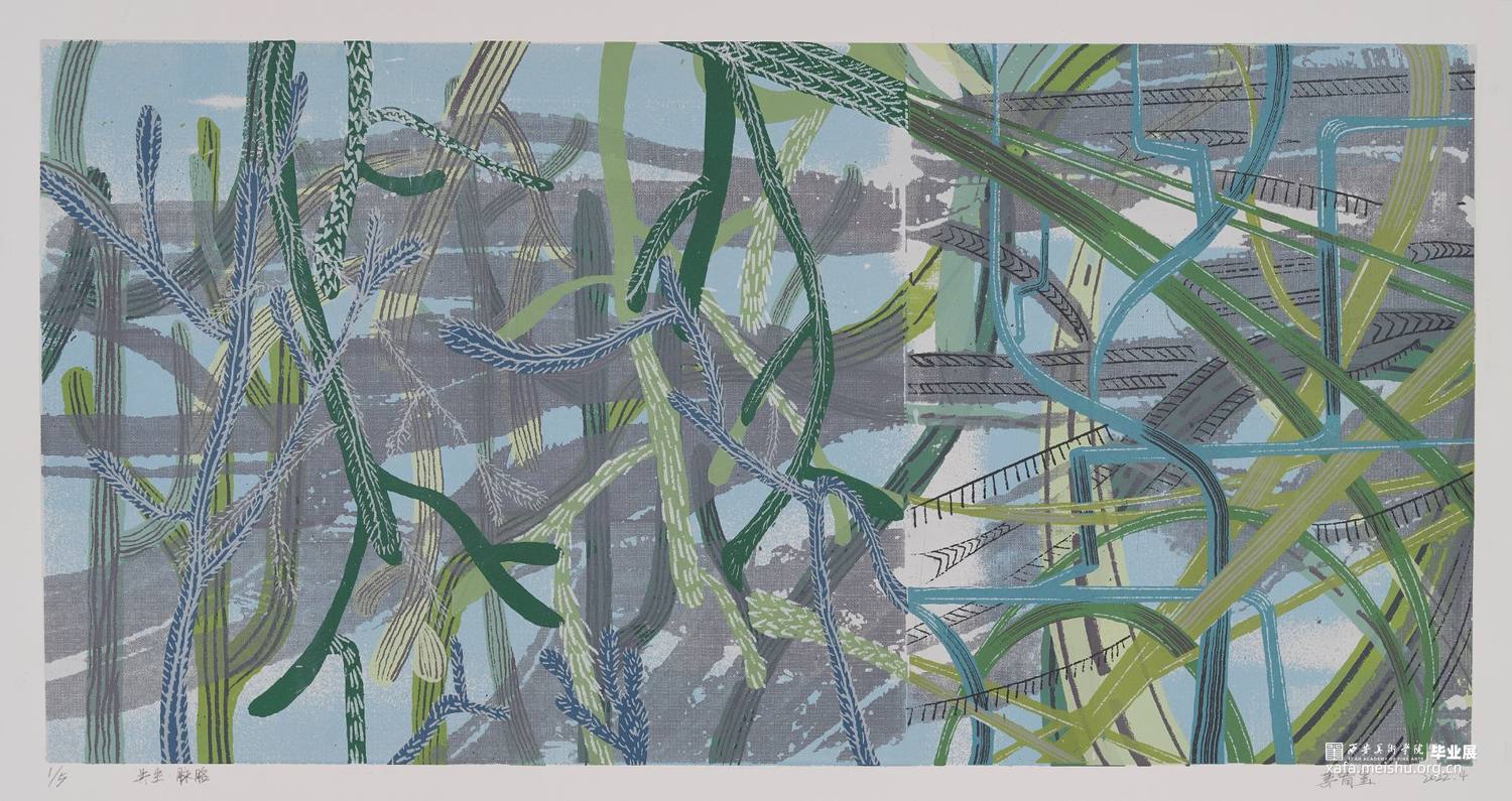 《共生》系列作品以丝网版画的形式呈现,将想象与现实结合,通过放大自然植物的恣意生长,与现实生活中“人为置入”的建筑同置于一个环境里,给予它们“共生”的空间,表达了我在生态问题与环境污染频发的当下,对这段生态关系中作为“工业生命”的建筑与自然植物能否共生共存的思考。该系列作品均通过套印二十余版颜色以调整画面层次,运用手绘感光语言和影像感光语言,结合网上直接制版等技法完成;画面中的色彩为存于幻想的植物带来无限的生命力,灰色的工业建筑又诉说了不可争的事实,表达出作品“对立统一”的观念。