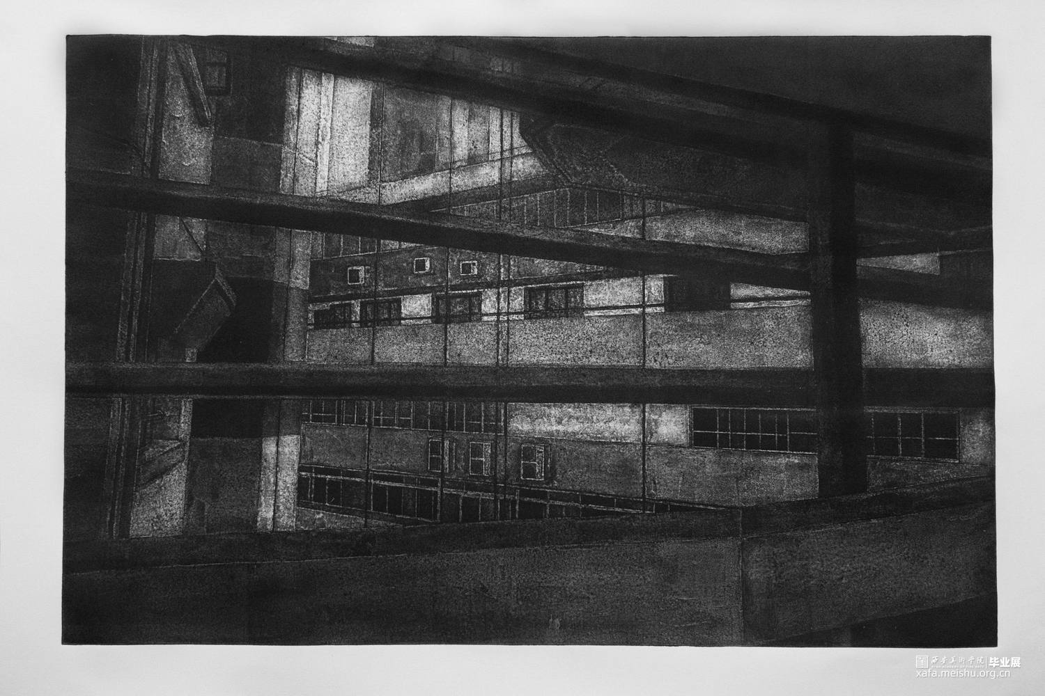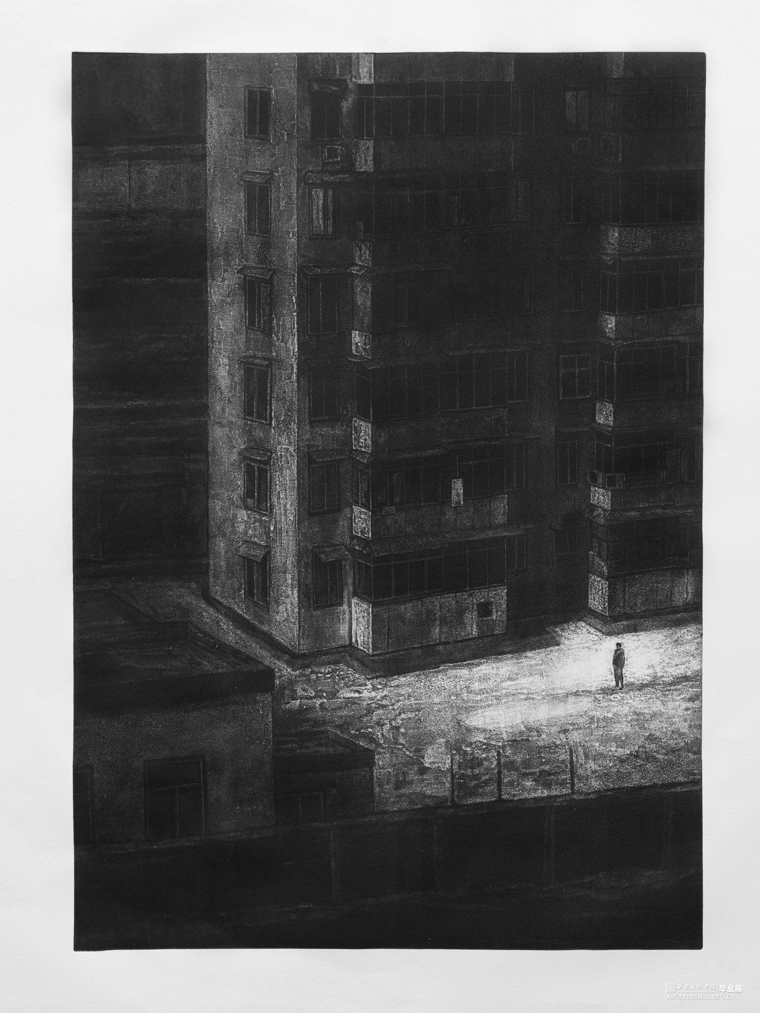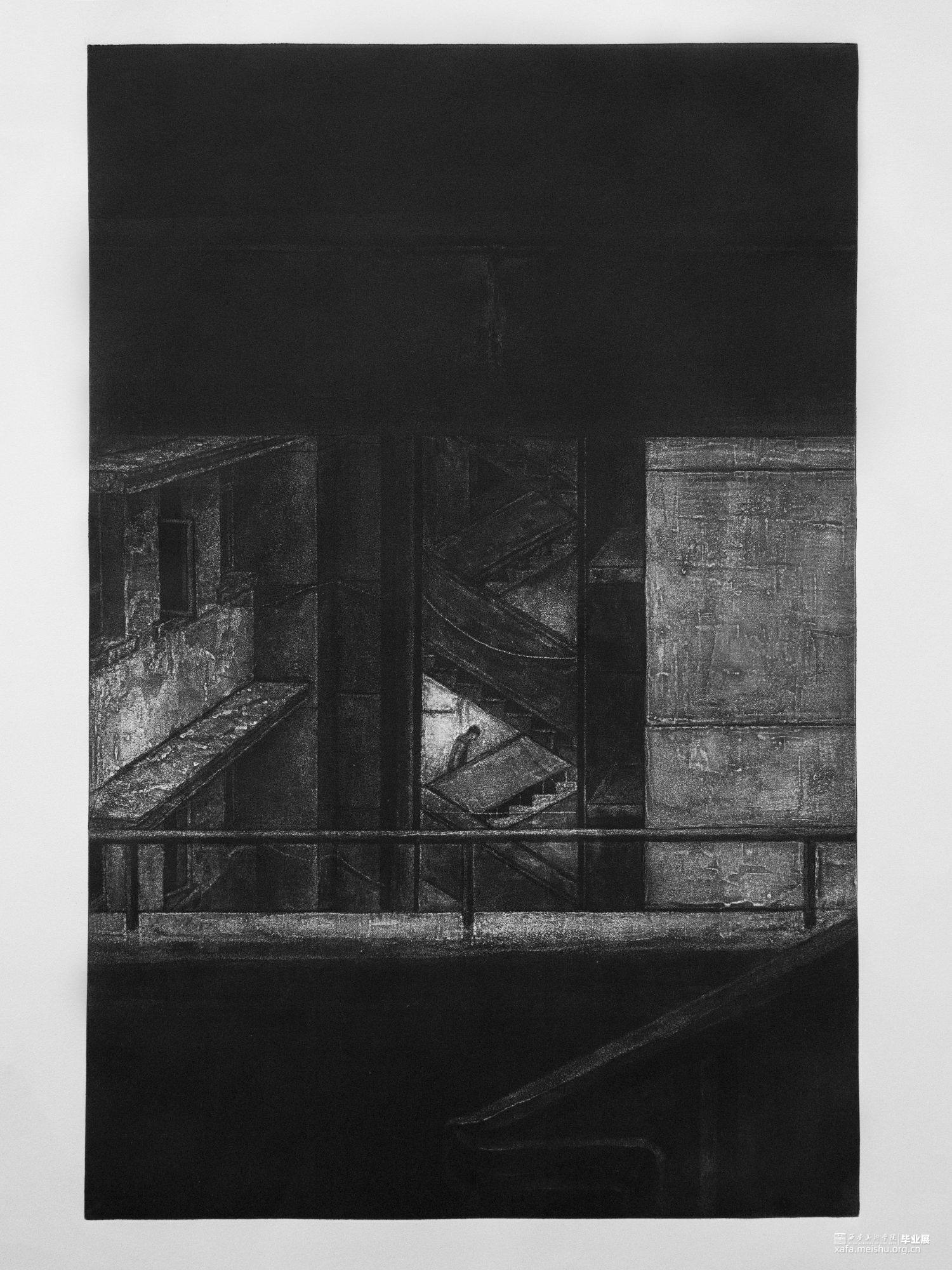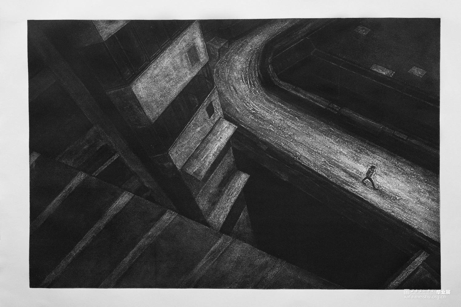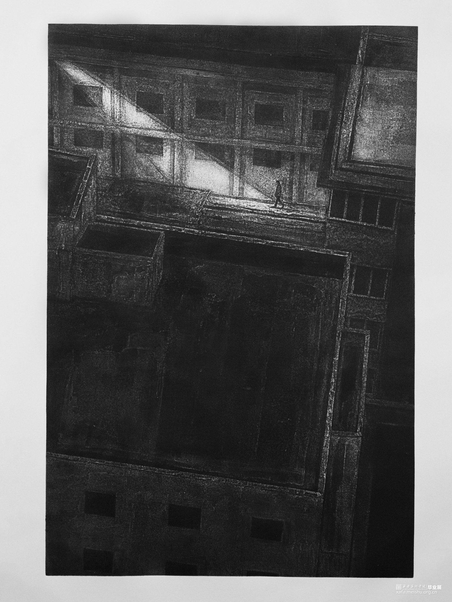 选取具有典型意味的城市场景,画面内容为居民区老旧建筑与对城市片段的描绘。以生活气息浓烈的城市建筑为主体,通过黑白关系的运用和画面构成表现建筑不同特点与背景。内容与当下人们生活密切关联,进而试图在思想上与观者产生共鸣。以透视手法与不稳定构图的手段体现城市与人之间复杂的关系,给予观者在观看画面时既是参与者又是旁观者的体验,探讨以城市人视角观看城市的方式。画面视角直接向中心人物引导的同时,给人们一种处于画面外部来观看其中的视角。人们仿佛置身画面之外却又感到身处其中。画面内人物可以指代观者自身作为城市人的状态,而画面外旁观者的视角也可以指代观者本身。借以此种方式在探索版画中绘画性与图示性的基础上,提供给观者多重角度的视觉体验。