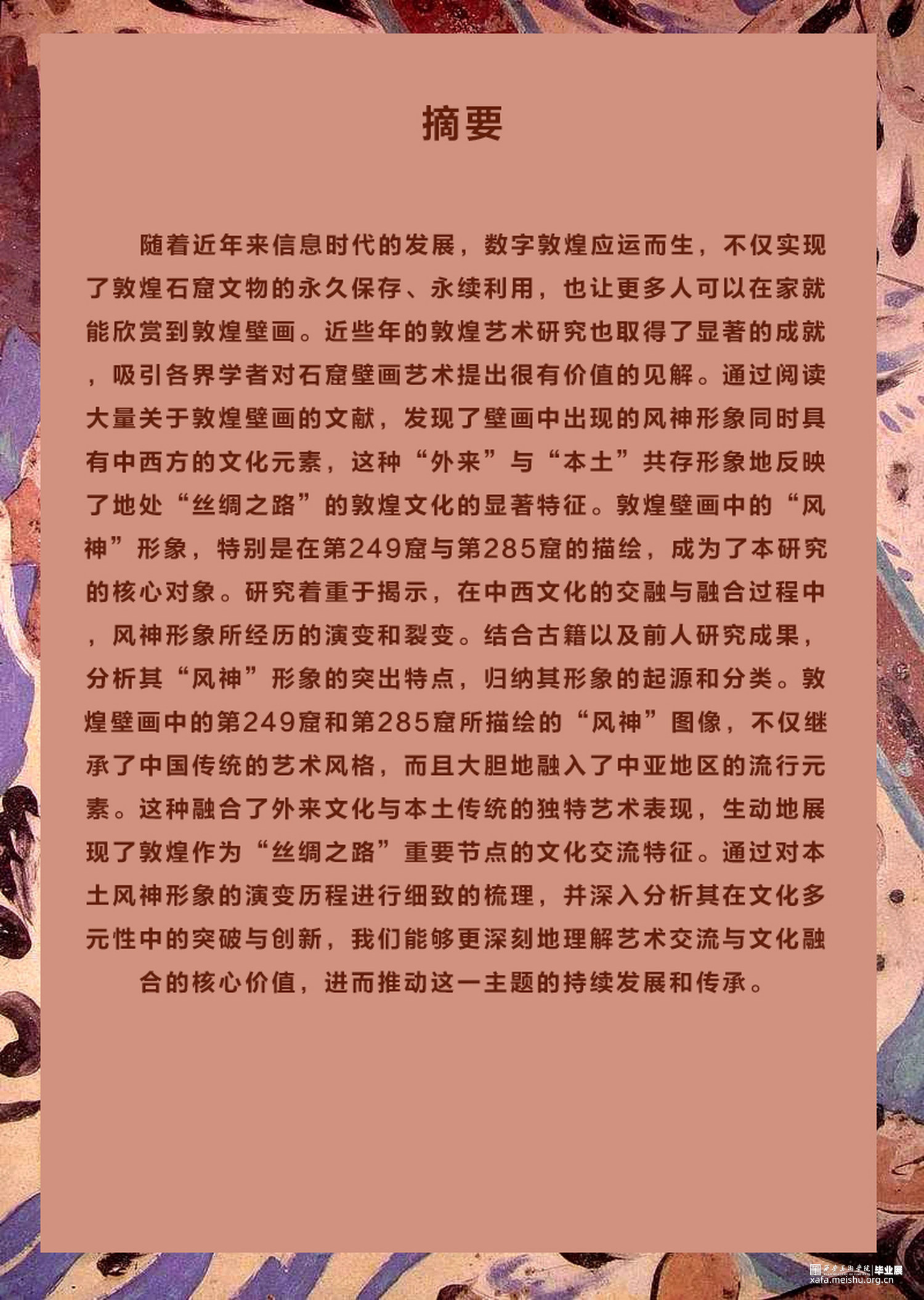 本文正文部分共四章,以敦煌壁画中的风神形象作为论文研究对象,重点选取了敦煌壁画249窟,285窟“执风巾”风神形象进行深入的研究和探讨。