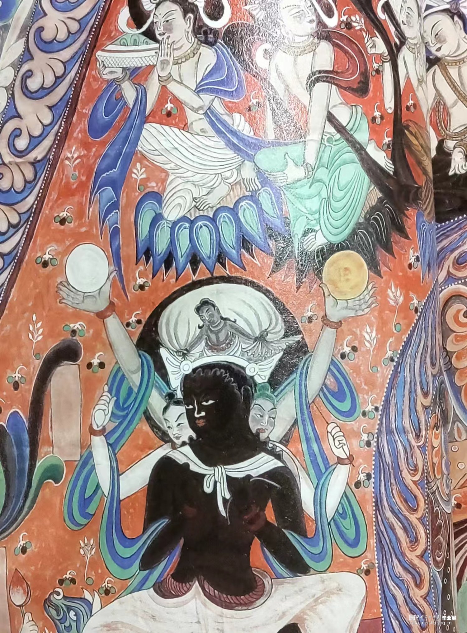 在西壁南侧的最上部,有一条蓝色的长方形条带,条带内自南向北依次绘有一个白色圆轮和六个白色椭圆形轮,内各画有一身人物形象,表现的是日天(菩萨)及其眷属。日天头有光,着高髻,双手合十,呈正面向,端坐于一驷马二轮车中。驷马两两相背,分别于车厢两端。在日天的圆轮下面,画一辆三只凤鸟拉的日车,向中央龛的方向疾速奔跑。车上有两力士,一前一后,其中前者一手持一人面盾牌,一手高高扬起,作驾车状;后者高举双手,似用力托着上方日轮。在中国传统文化中凤凰就是太阳神的符号,凤凰、朱雀都代表太阳,代表火,就是说把中国文化中的对于太阳、对于火的理解,跟骑着马的这种非中国文化符号的表现日神的元素,两个结合起来,这种图像,世界上也是绝无仅有的。