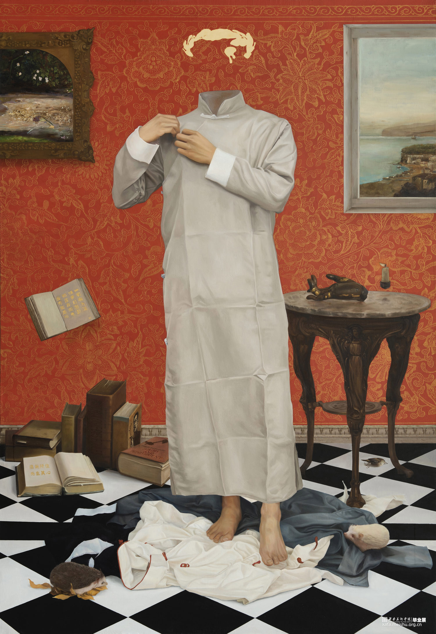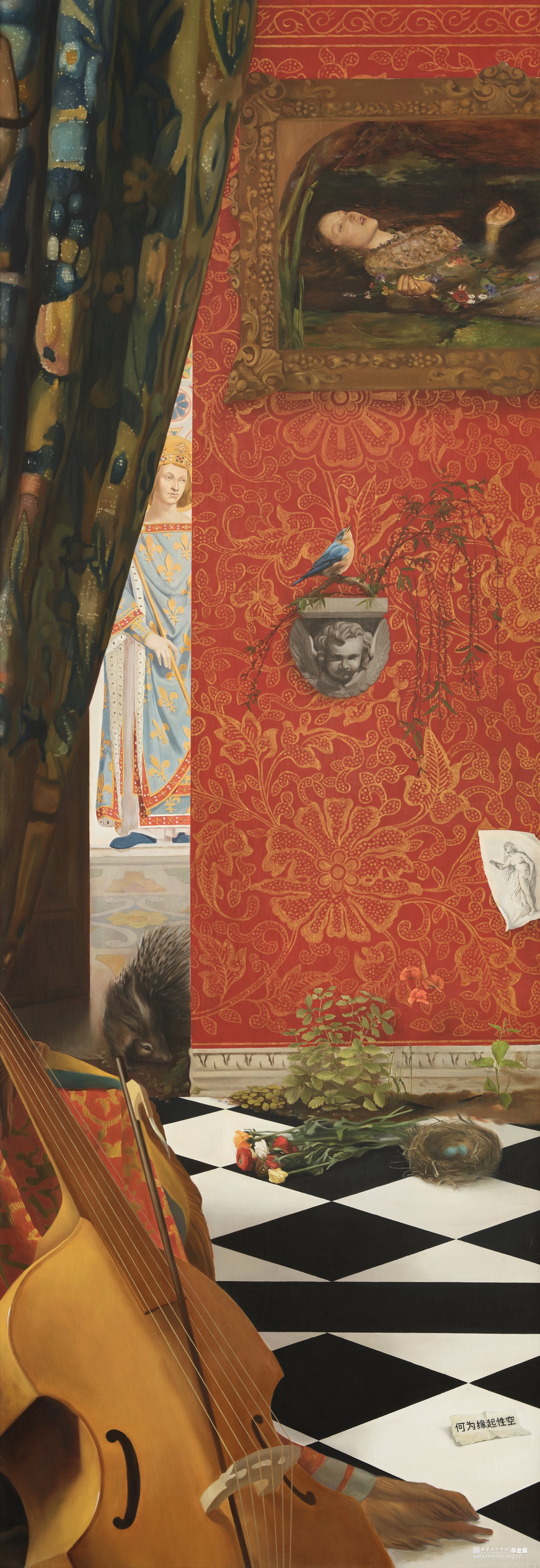 寂静之声:一千个读者有一千个哈姆雷特但奥菲莉亚只有一个。米莱斯的奥菲莉亚,这幅画仔细观察会发现里面有着无比丰富的情感表达,其中有着代表抛弃的杨柳枝,代表童真的毛茛,代表后悔的荨麻,代表死亡的罂粟花,还有那为即将到来的死亡而歌唱的知更鸟。我将原作中的事物分离出来,组合出另一种形式的构图,有了在画框里的奥菲利亚,一只知更鸟站在杨柳枝上仰望着她,下面飘过一张素描稿,其中的女人惊恐地望着上方的奥菲利亚,手中紧握的匕首将要刺入自己的心脏。再往下是从墙角长出的罂粟花和荨麻草,还有一束毛茛花躺在地上,最后是知更鸟那蓝色的蛋,他有着他的期盼。终归大提琴断了弓弦,往后是一只带满尖刺从门里走来的豪猪,原来是一个带着所谓护甲实着是满嘴攻击性的蠢货,可笑的是身后墙壁上那左手持权杖右手拿荆棘冠的神。透过门和帘的光一亮一暗一亮一暗。