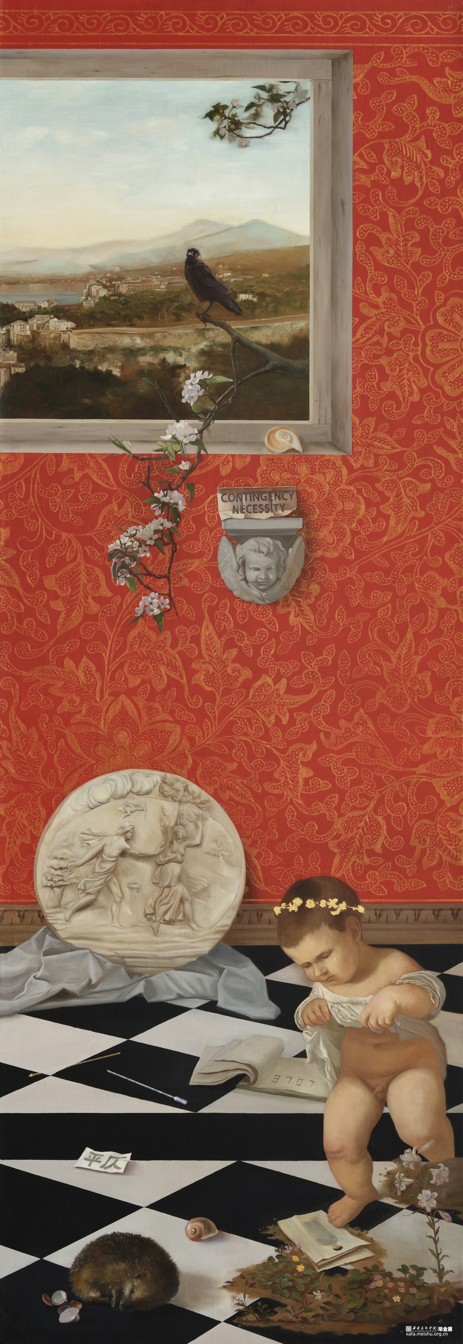 回到丘比特他尿尿的下面有一张图,那是画者。窗外是我的向往,向往着美好的未来。一只乌鸦紧盯着你,它是智慧的化身,用以警示言行。它落脚的地方是一颗盛开着梨花的树,花枝从窗外伸了进来。
