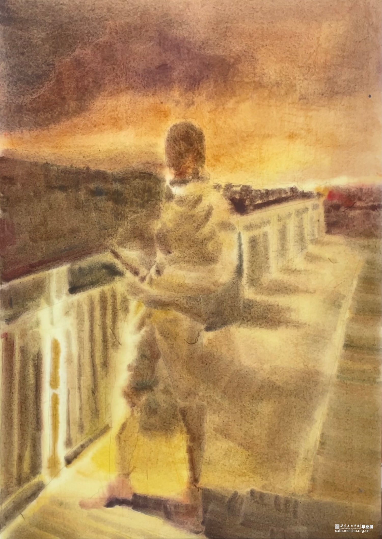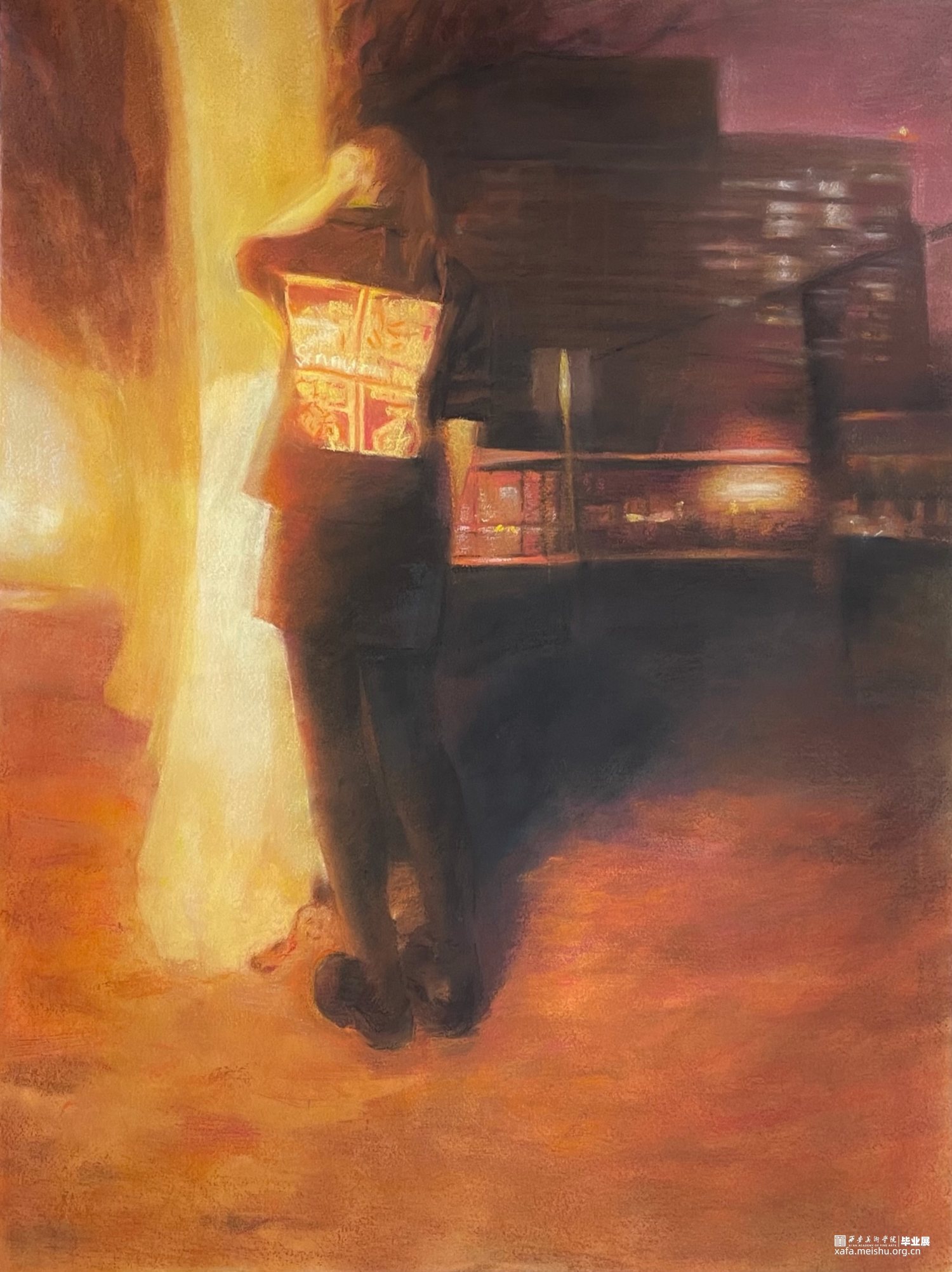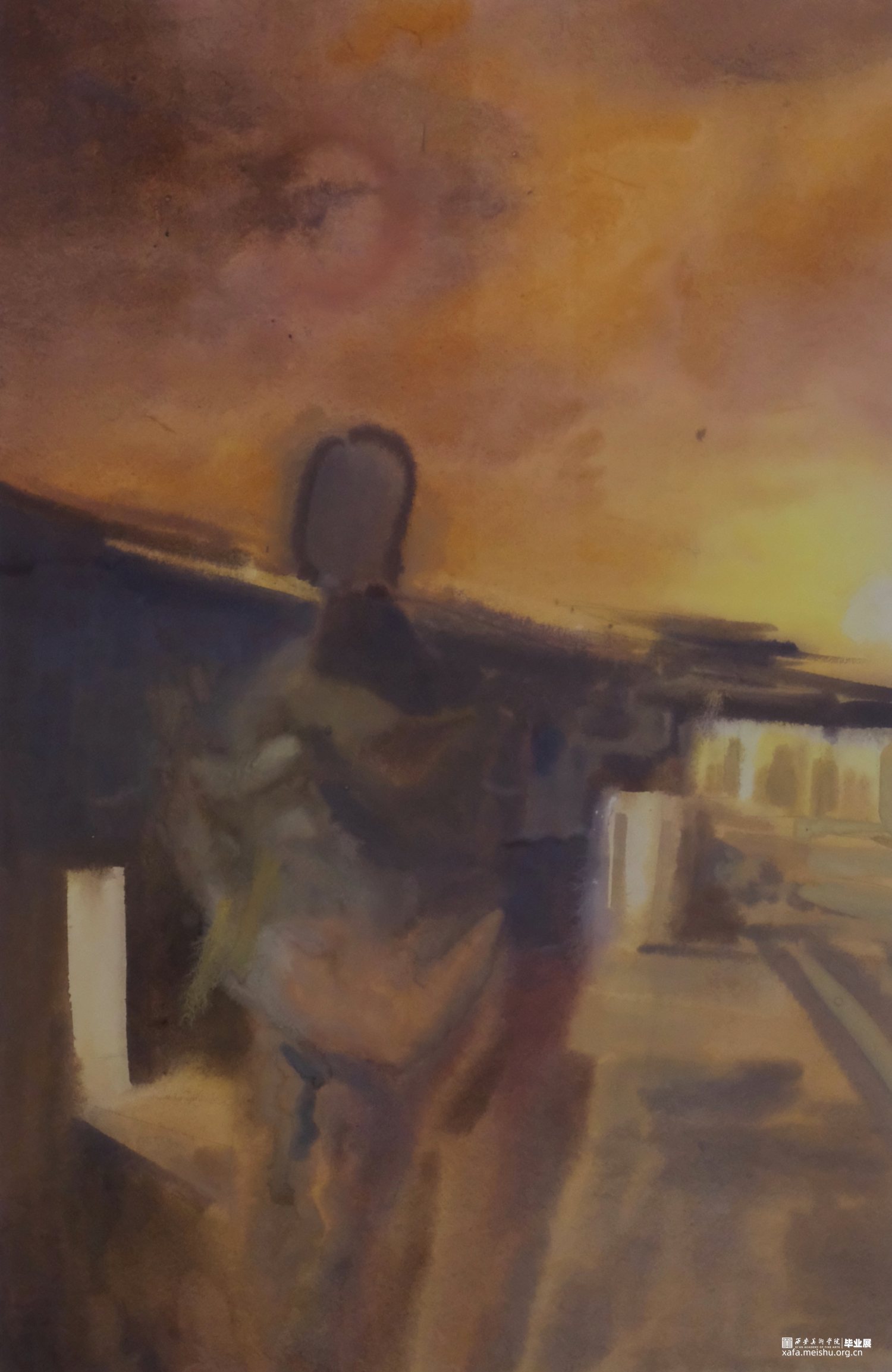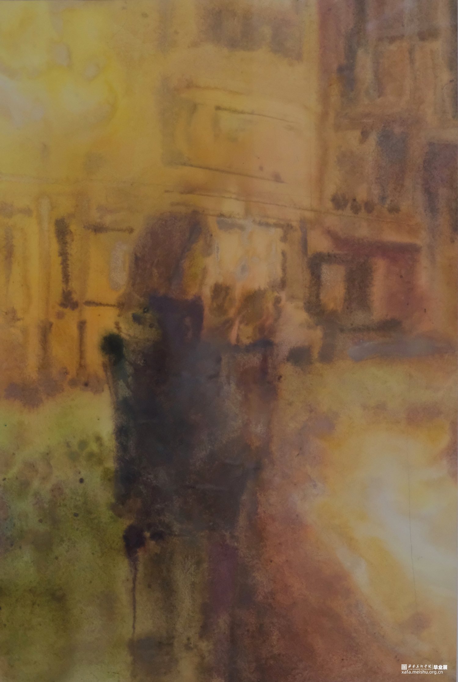 情绪表达与具象绘画探索是对当下快餐式生活表示抗议,人们无法在灯火通明的夜间得到合理休息,疲倦延伸到白天,使得情绪低落,空虚的精神状况在都市弥漫,人们毫不停歇的追求物质欲望的满足。一切平静的需求无法满足,在夜间灯光影响下寻求刺激,但是在激动的情绪过后,只有虚妄。用现代水彩表现这种情绪,使得人们反思生活在无尽的光污染的危害,希望人们能够找到平静而非虚妄。