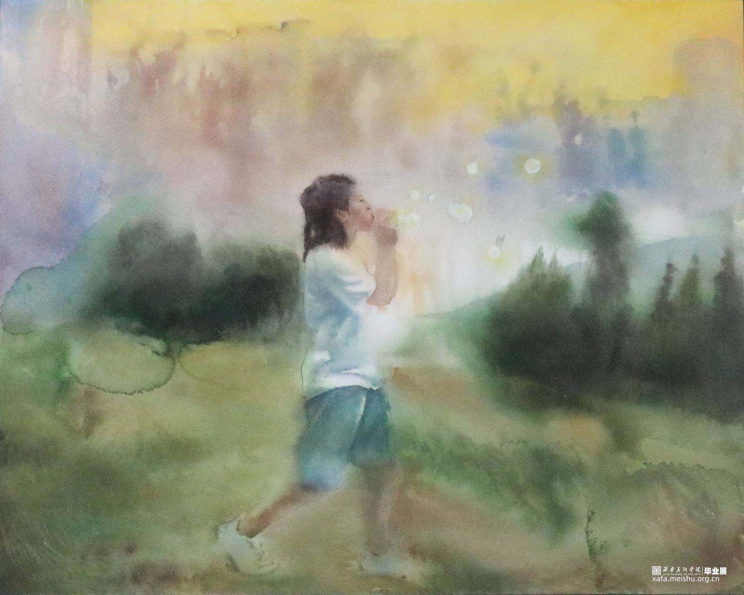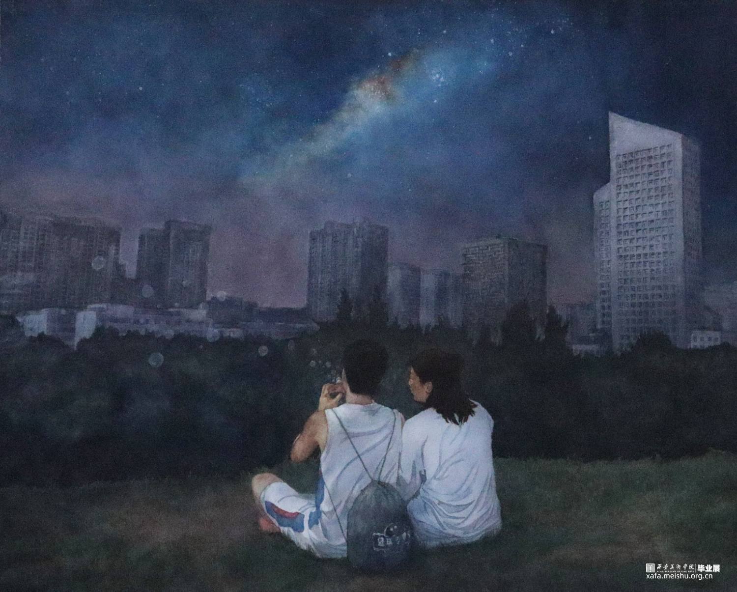 我的创作灵感来源于我身边亲近的人,在长时间相处的过程中,自然而然的萌发出许多充满想象的浪漫主义的思想,同时这一份浪漫主义的思想也贯穿到我的艺术创作当中去,比如说像这幅《夜空下的两人》,当我有一个在一片很平常的草地上,俩人在玩吹泡泡机的经历时,心中马上就萌生出一个想法“把夜晚和星空这两个元素加进来,把浪漫的氛围散漫整个画面”,让俩人玩泡泡机的这一过程在满天繁星的银河下进行,繁星的璀璨呼应在两人的玩耍中,同时对后面楼房灯火通明景象进行弱化处理,从而营造出一种“人无需多,只需一个”便能体会生命的美好时刻的画面。