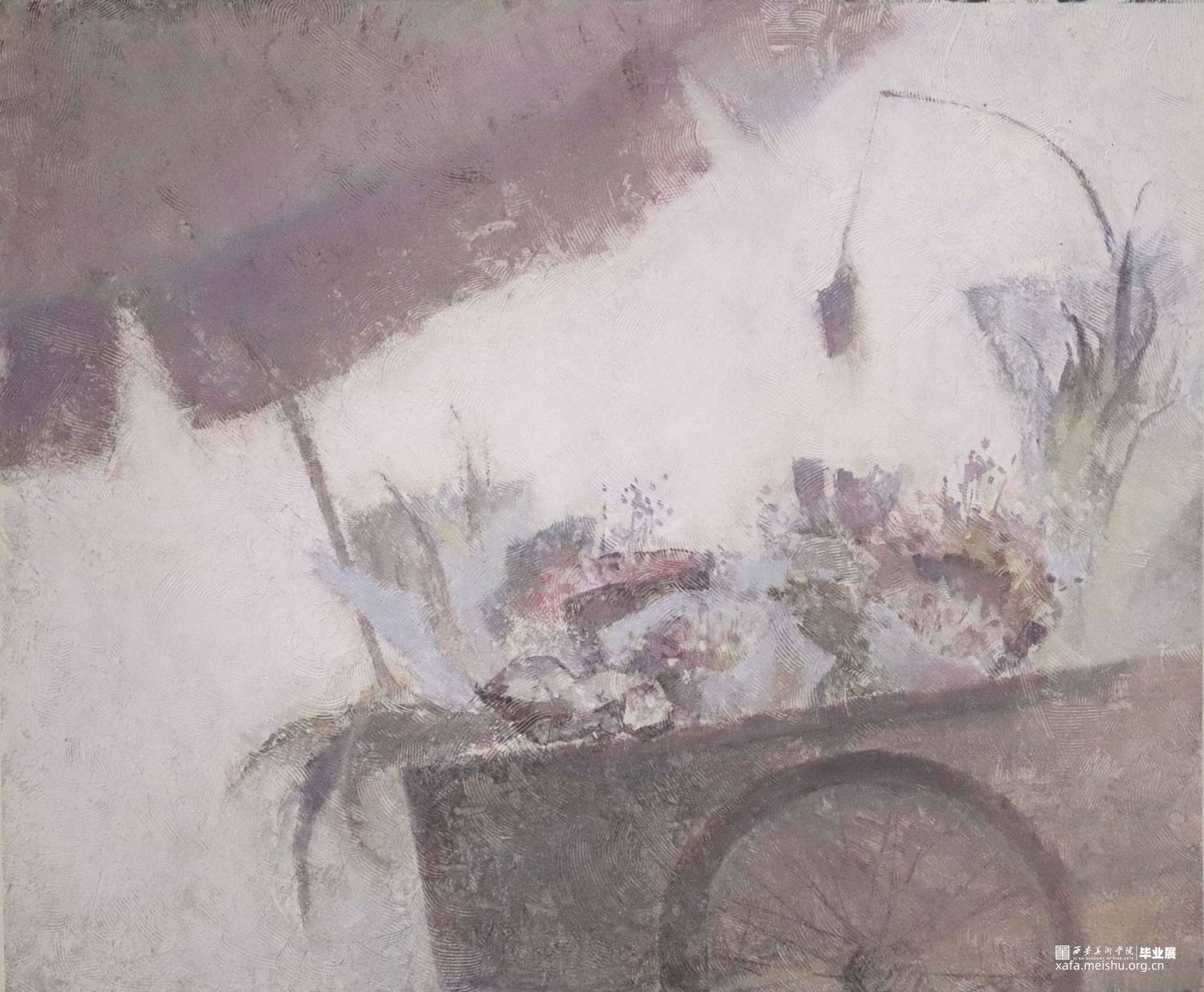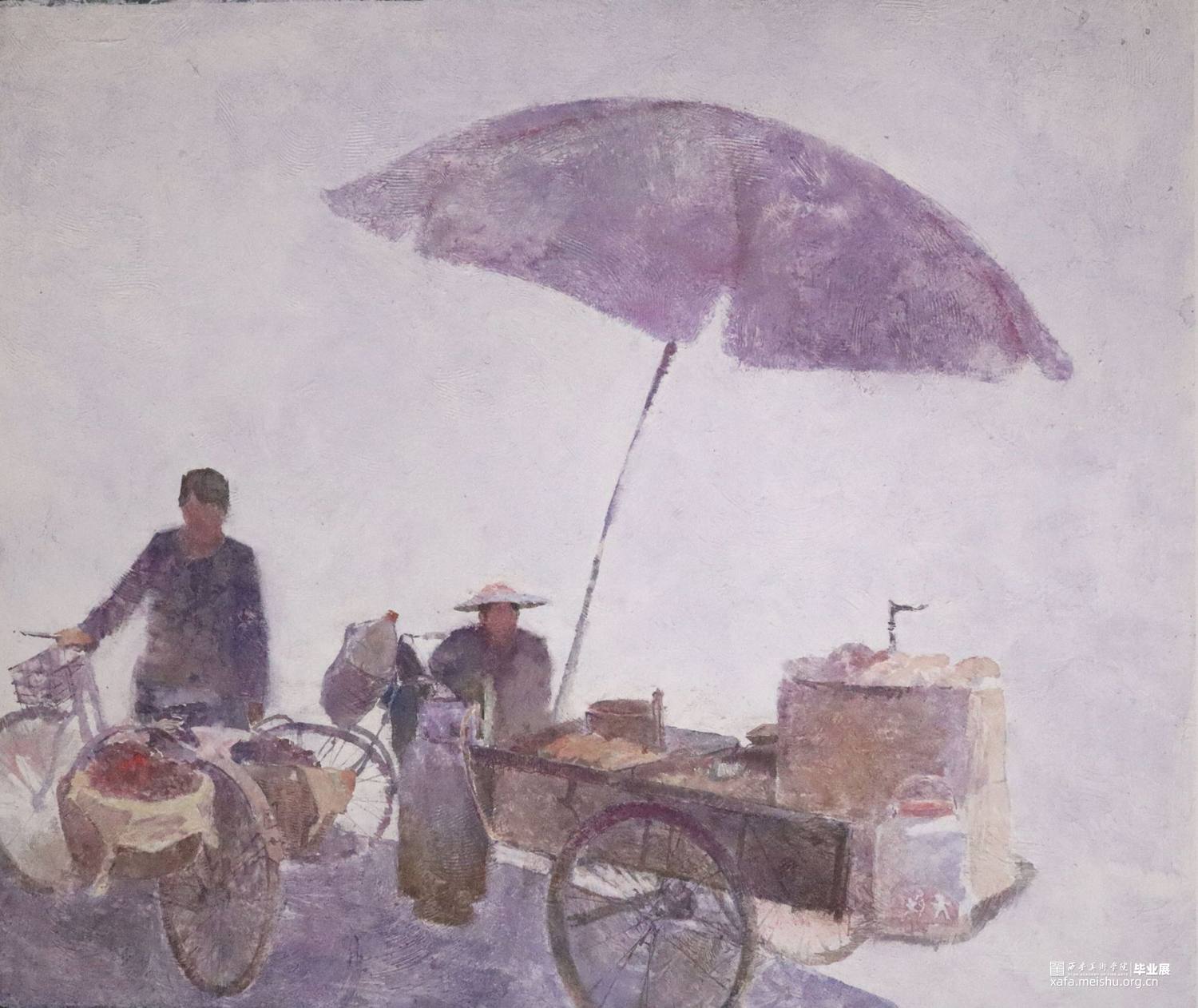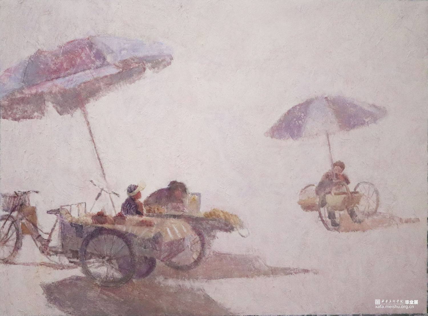 伯克曾说过:“生命在闪耀中现出绚烂,在平凡中出现真实。”艺术的灵感源于真实的生活。此次创作,我也是在平常生活中得到灵感。从平凡的劳动者们中出发,选择了贴近生活的题目——《平凡一隅》。摊贩的日常是喧嚣的,我使用大面积留白的方式,让他们归于宁静,并捕捉轮廓和色彩的微妙变化,希望让人感受到平凡生活中不平凡的美。