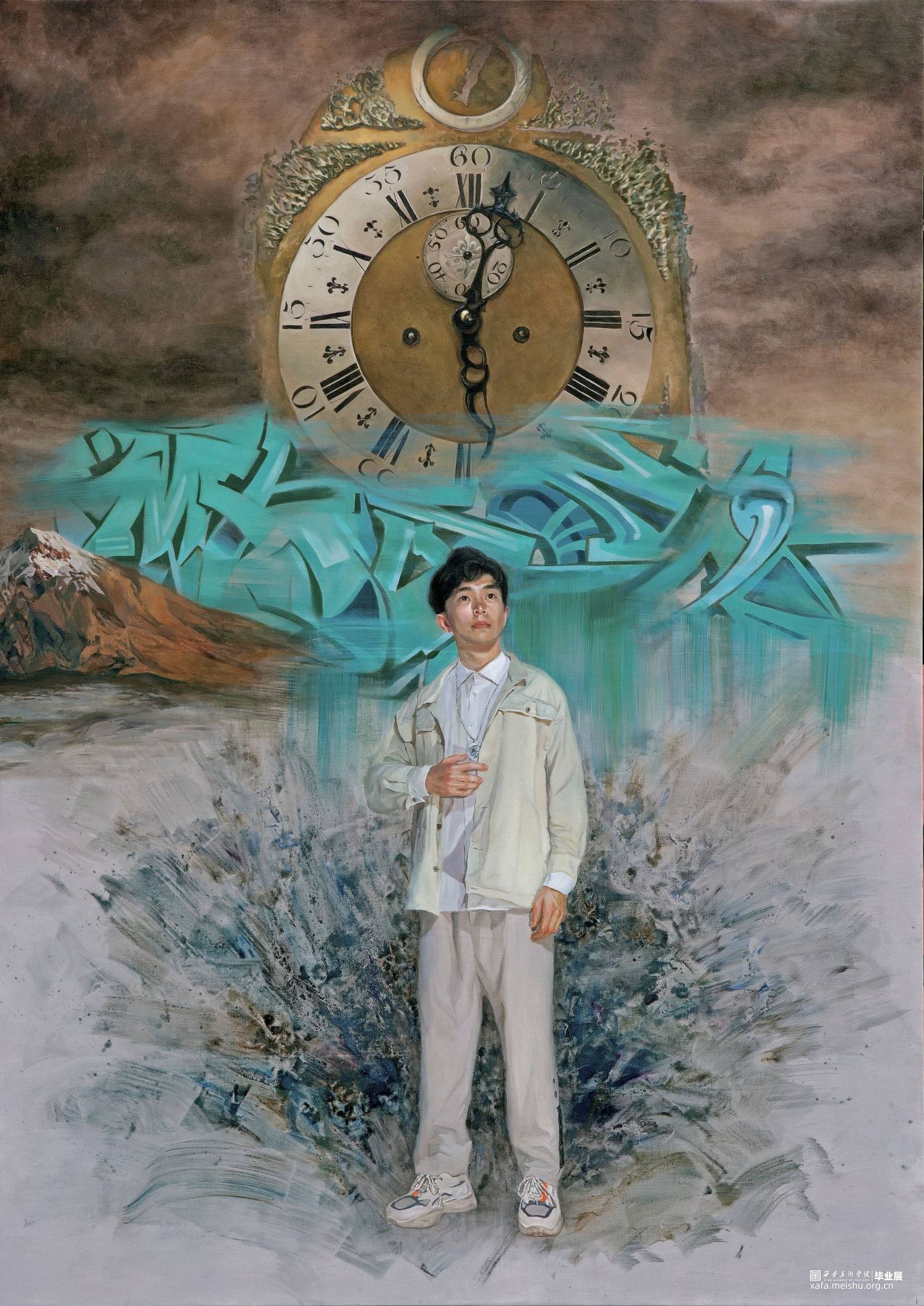《荏苒》——时钟这一物象代表时间流逝,涂鸦选自学校的涂鸦墙暗喻青春,少年面对易逝的时光,空留无奈与遗憾。