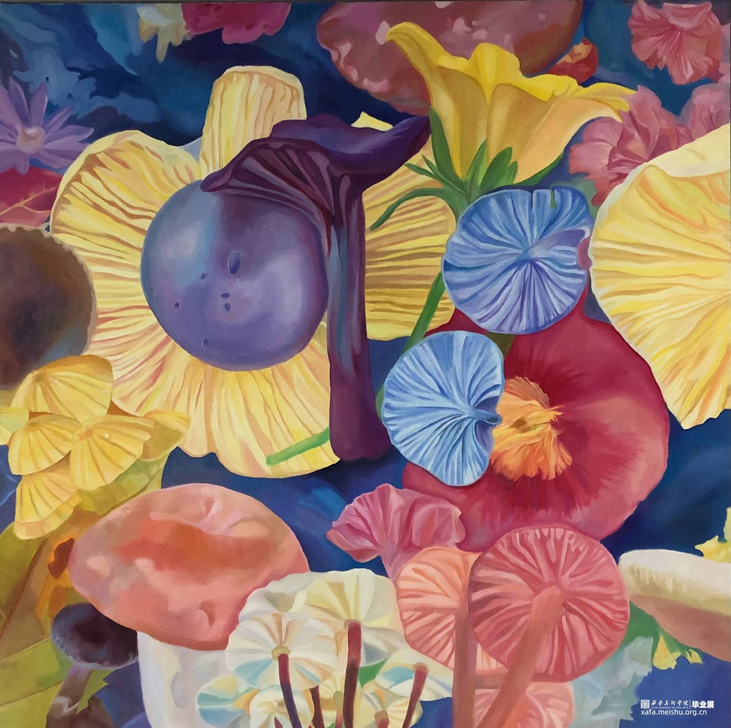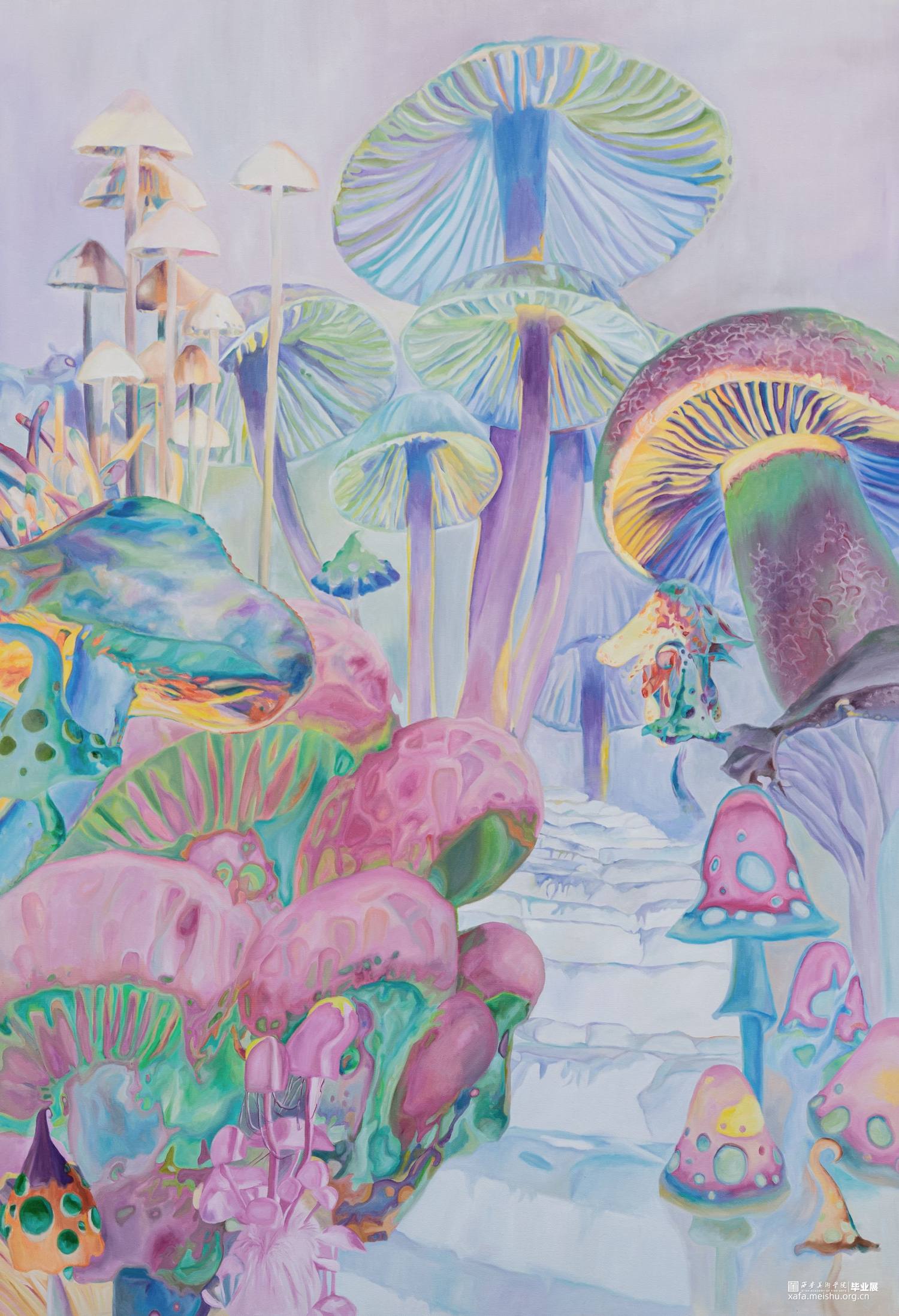 小时候读着童话故事,并且向往着童话中美好而梦幻的世界。以“梦”为题,选取了形态各异的蘑菇作为主体并搭配想象的色彩,旨在表达出魔幻森林的神秘感与飘渺感。