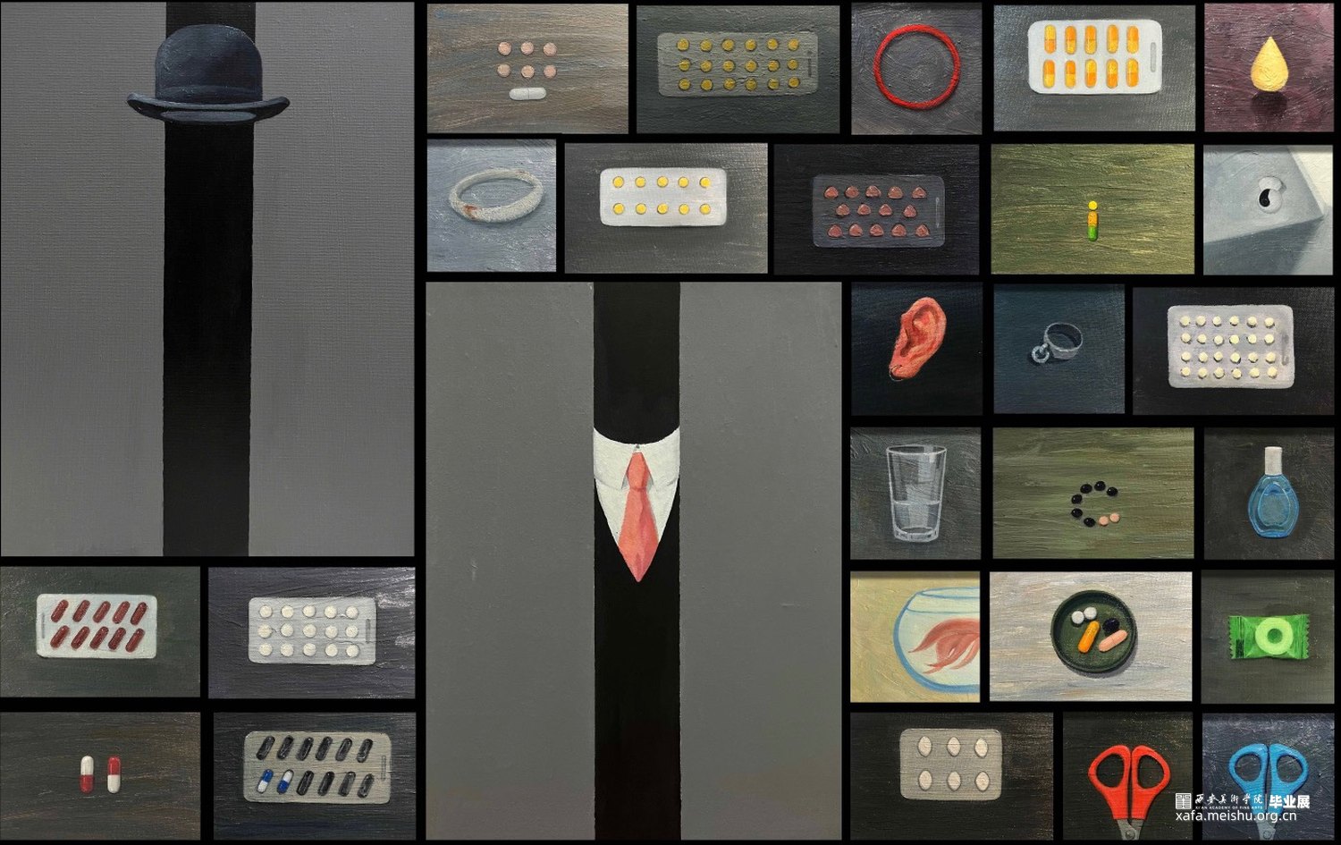 由于在创作期间受马格里特作品的影响较深,因此在我的创作中尝试用一些衣物、饰品来表现一个“正襟危坐”的人的形象,其中礼帽和红色领带两张,正是学习借鉴了马格里特作品中的元素。如果说药片的作品想体现的是人体生