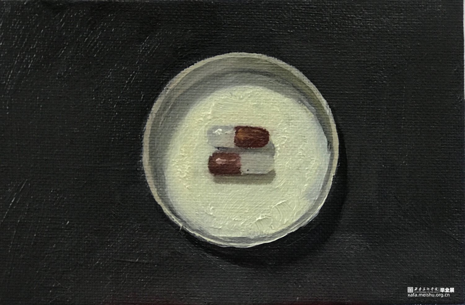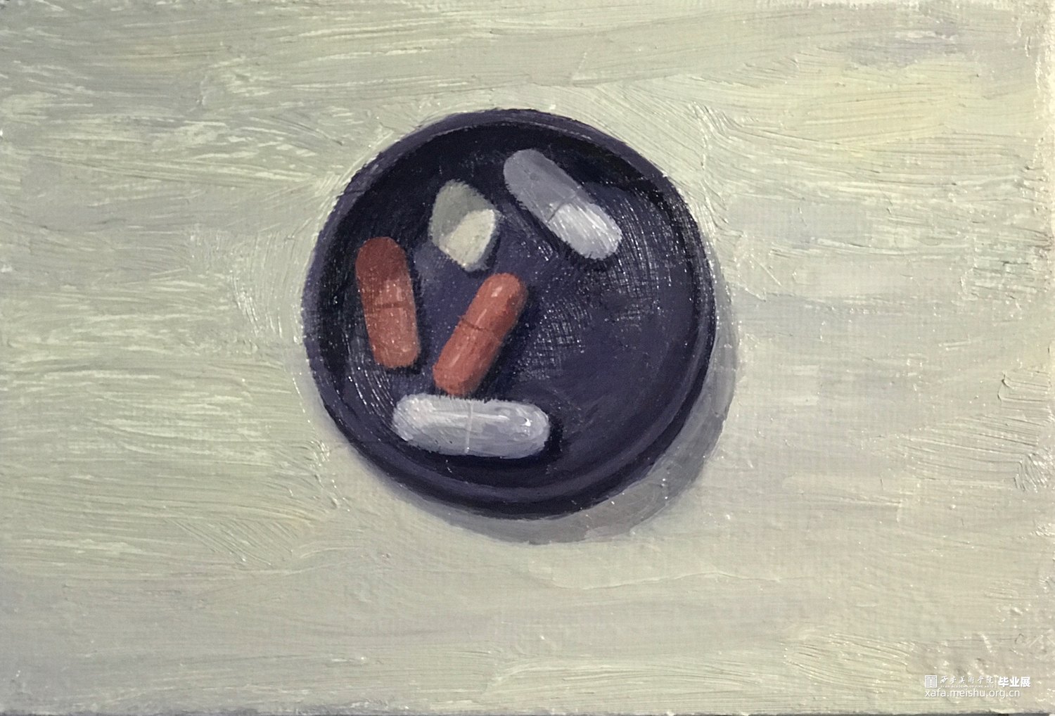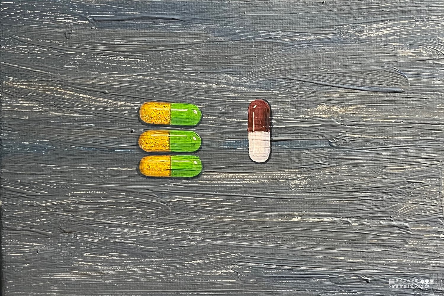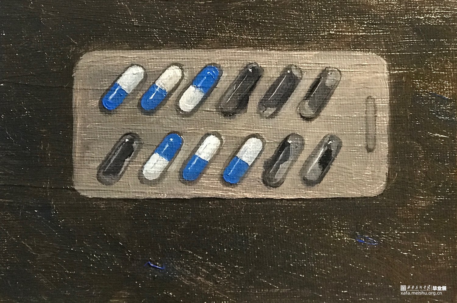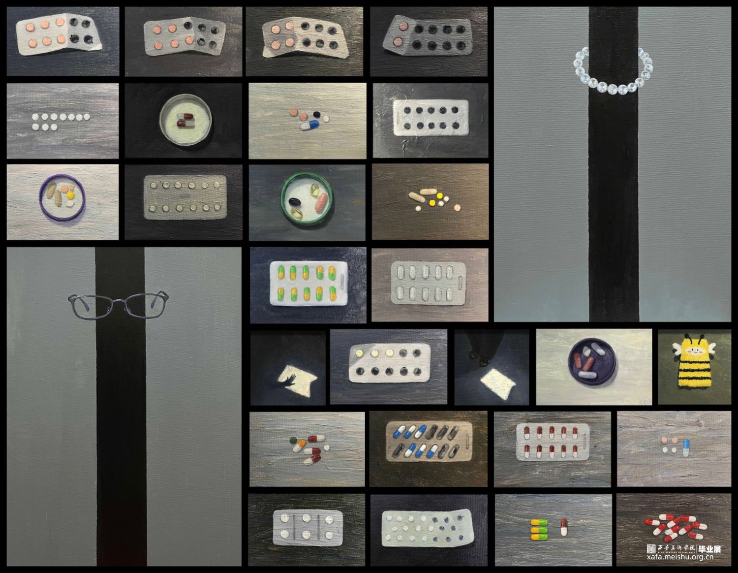 作品的选题思路源于我个人2021年一整年的生活状态,反复生病导致不停的吃药。不健康的身体状态也导致我在很长一段时间无法出门,不能去画室,不能正常的画画。在我的指导老师的帮助与建议下,我决定先画点小小画尝试下,就画自己的生活,画每天吃的五颜六色的药片,之后还尝试画了很多不起眼的生活用品,这张创作才初现雏形。