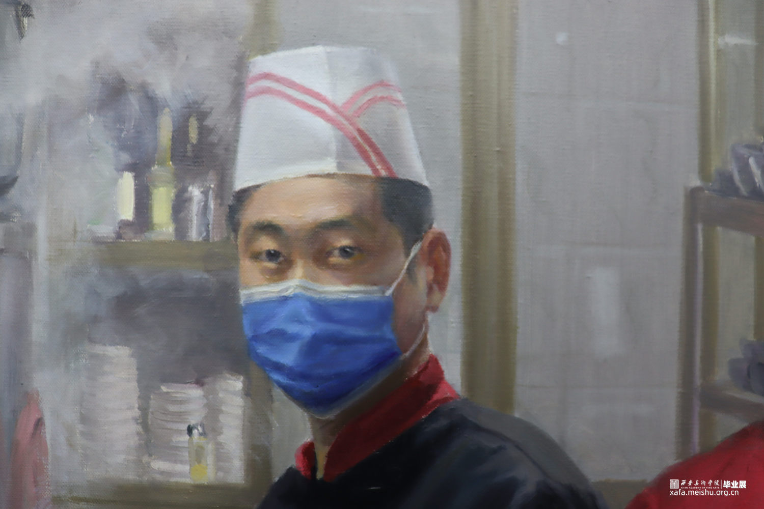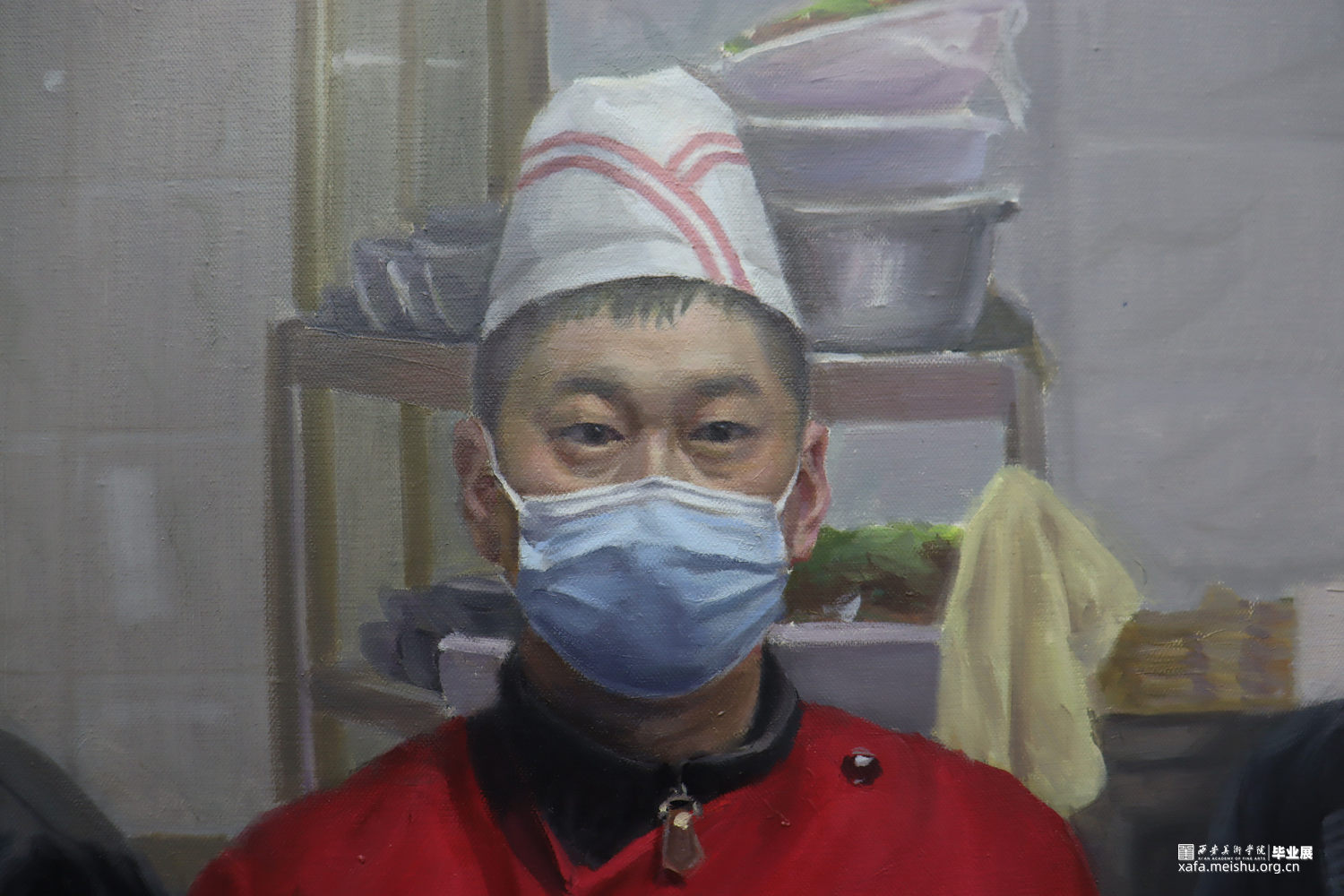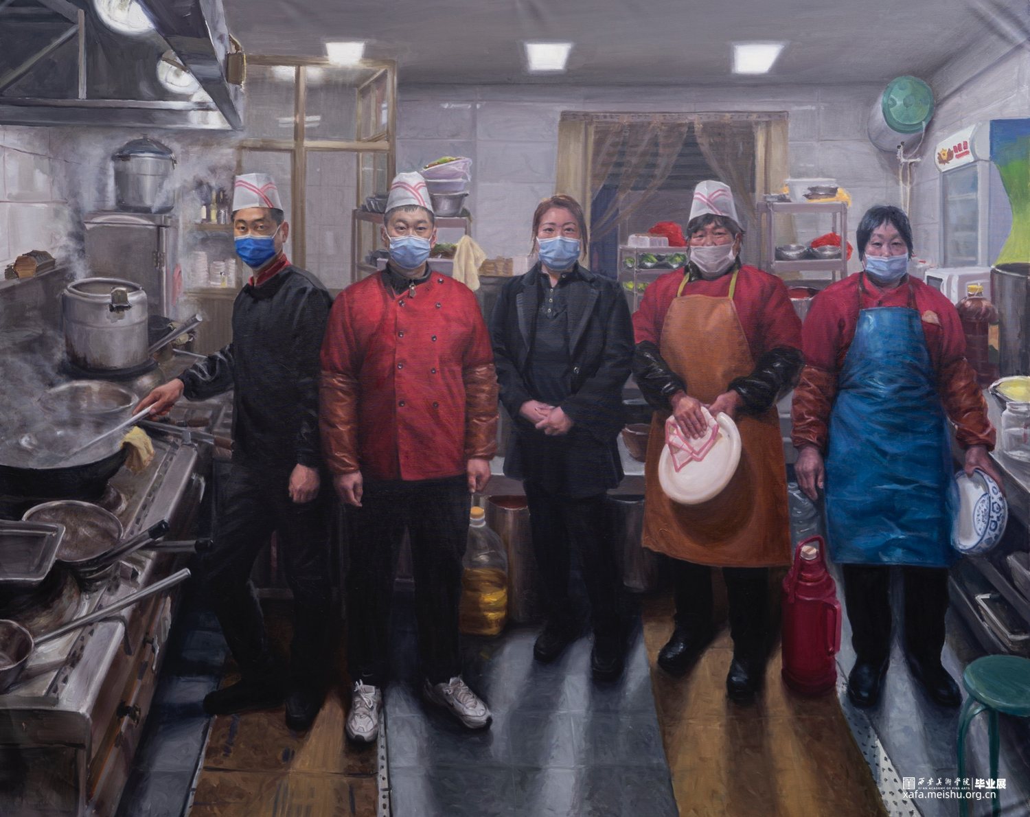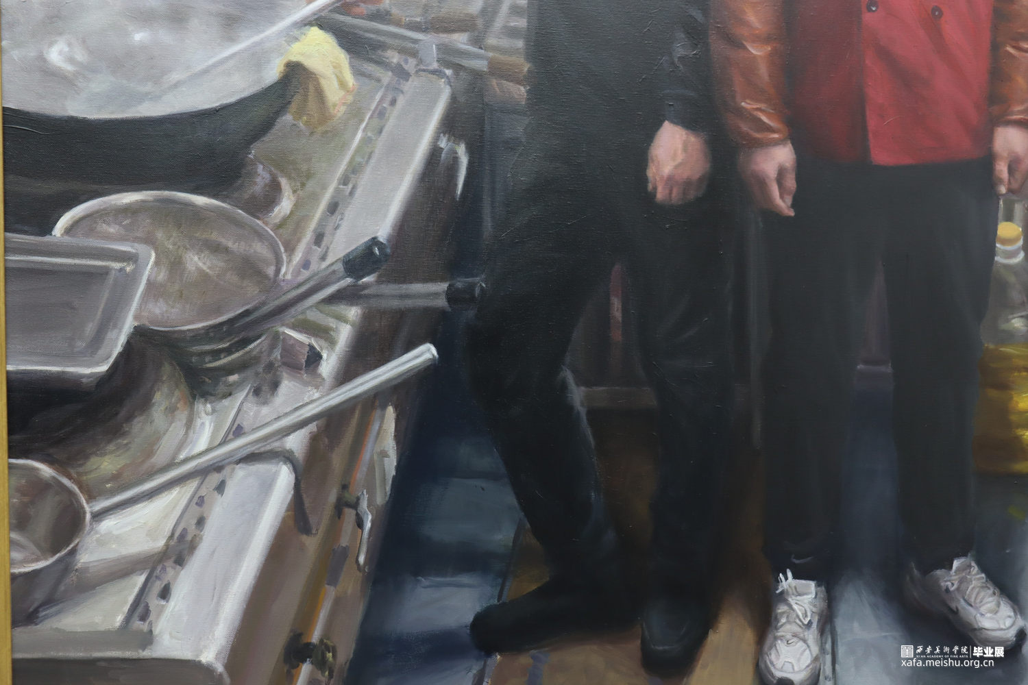 在经过对不同底层工作群体的实地采访与观察后,我选定酒店的职工作为我进行艺术创作的人群。我挑选了一家当地知名的酒店,我分别对前台经理,厨师长围绕工作感想和感悟进行了深入采访,我又连续对洗碗工,洗菜工,传菜员以及其它职位的酒店人员进行工作跟踪记录与观察,为我进行油画艺术创作进行素材铺垫以及情绪共鸣,最终创作出这幅作品。