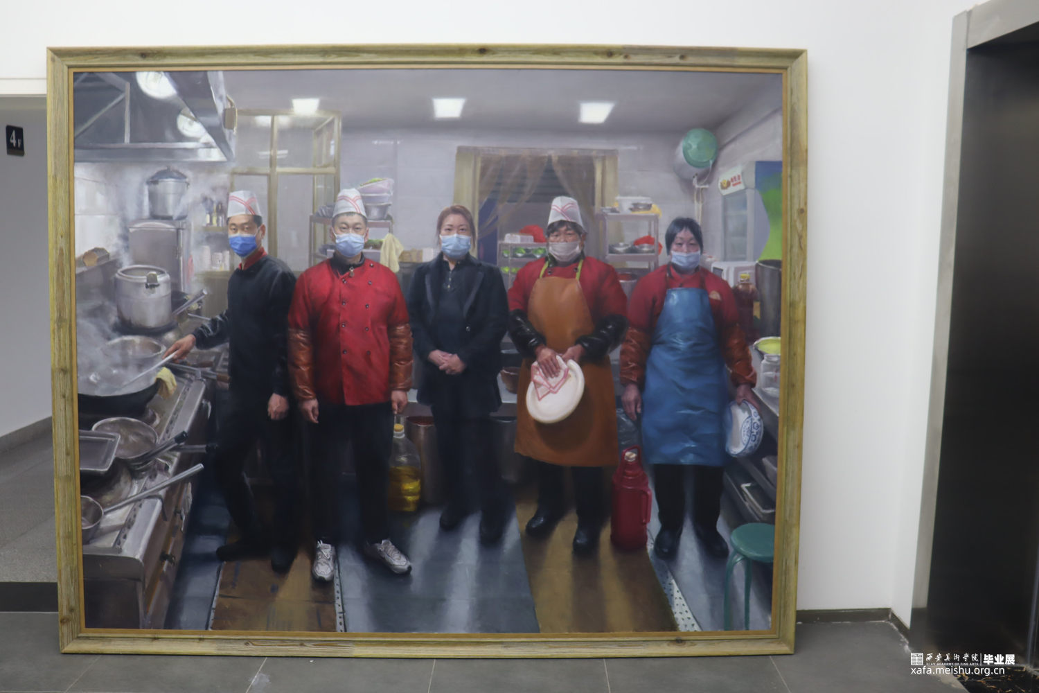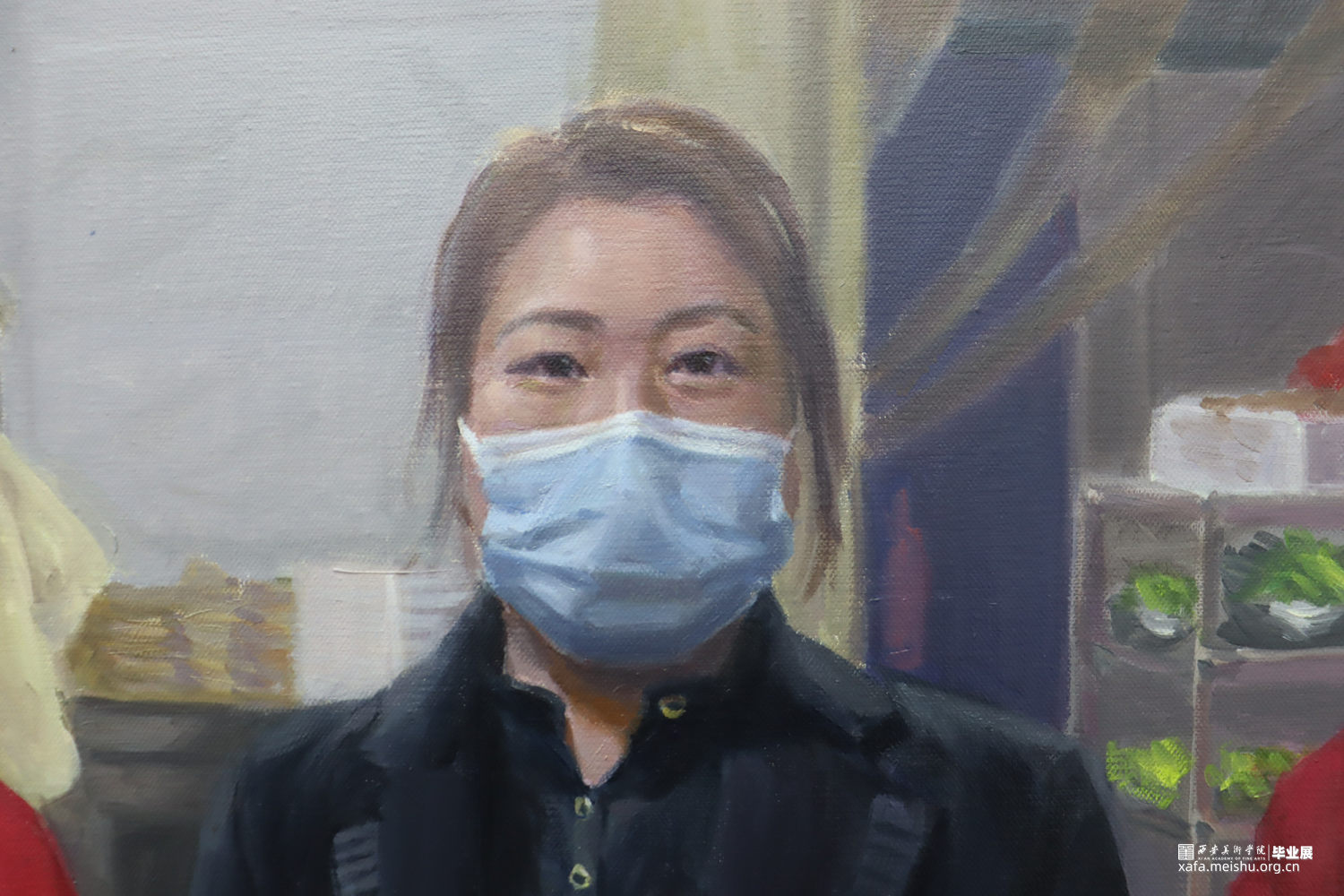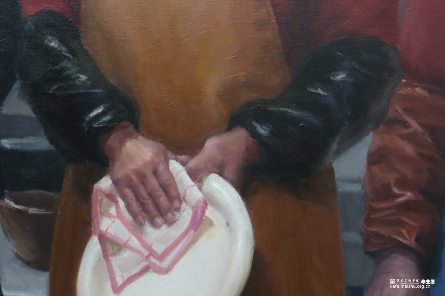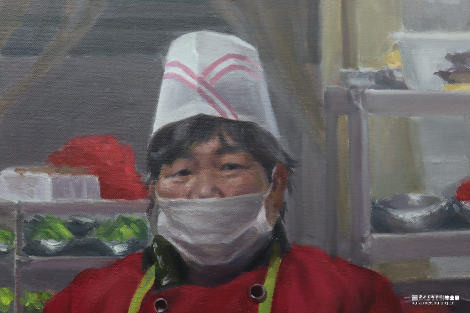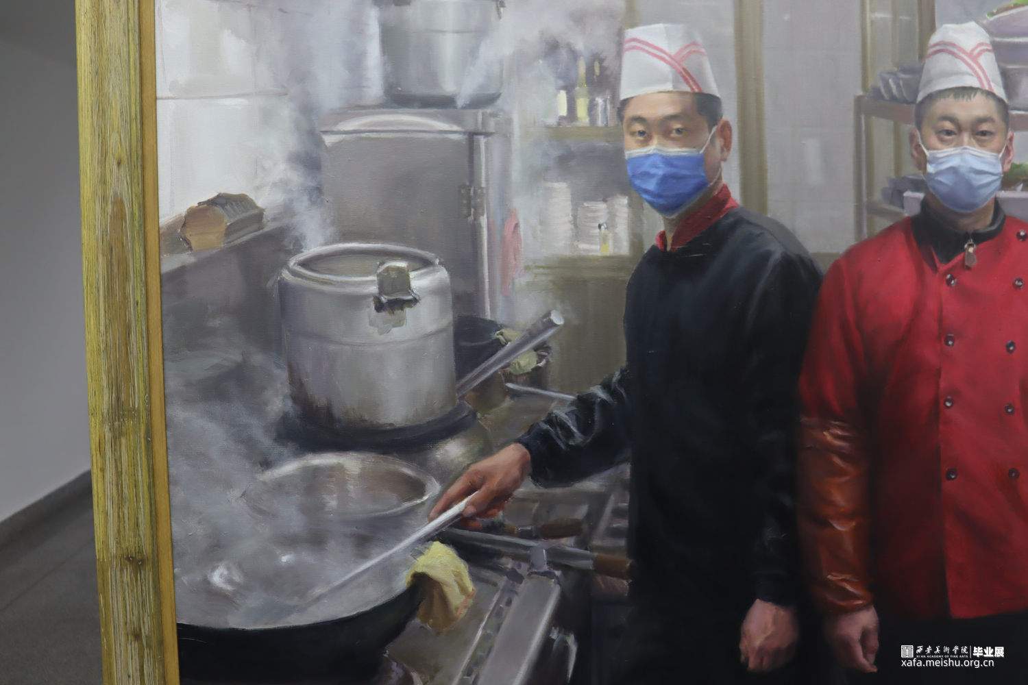 在经过对不同底层工作群体的实地采访与观察后,我选定酒店的职工作为我进行艺术创作的人群。我挑选了一家当地知名的酒店,我分别对前台经理,厨师长围绕工作感想和感悟进行了深入采访,我又连续对洗碗工,洗菜工,传菜员以及其它职位的酒店人员进行工作跟踪记录与观察,为我进行油画艺术创作进行素材铺垫以及情绪共鸣,最终创作出这幅作品。