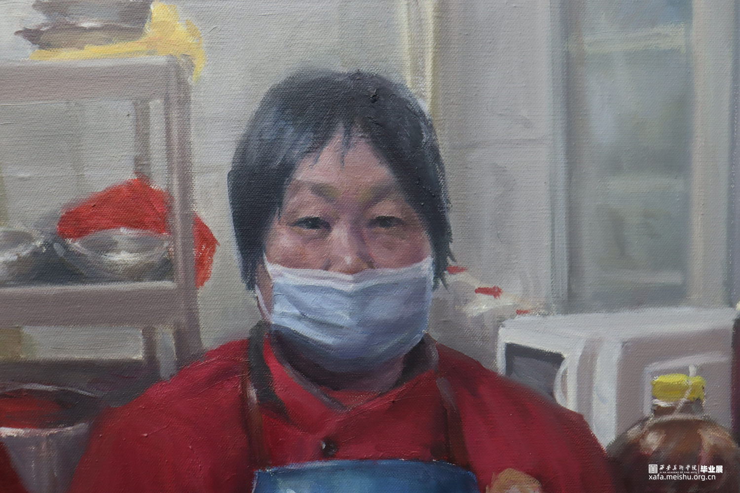 在这幅油画的创作中我着重表现社会底层打工人民对于工作的热情与自信,运用写实绘画的语言,营造朴实的画面。在创作过程中了解并接触这类人群,原意采用人文关怀进行油画创作却被劳动人民所展现的品质与精神所触动。