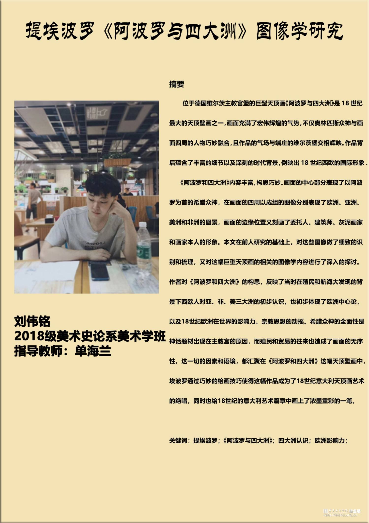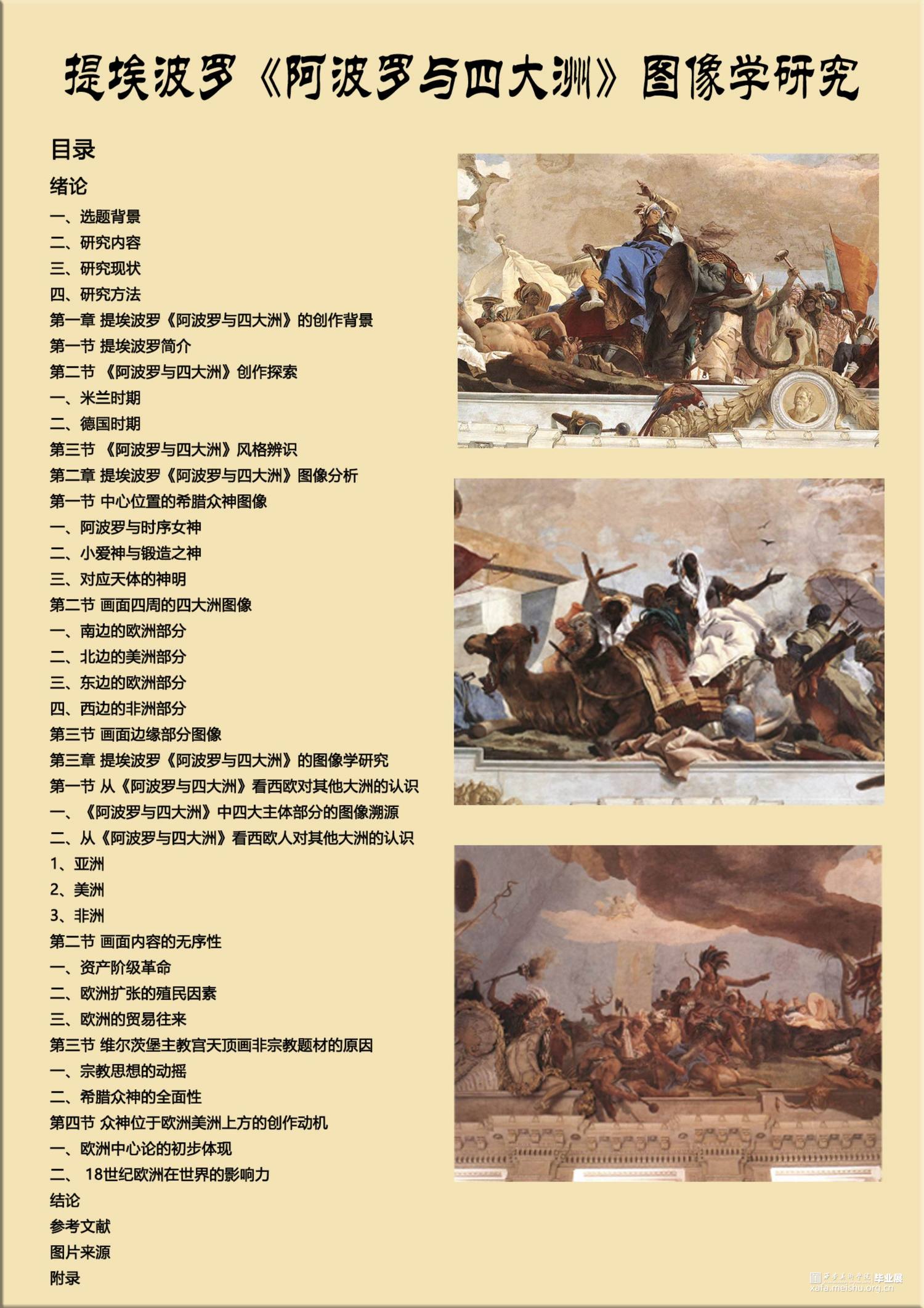 《阿波罗和四大洲》内容丰富,构思巧妙。画面的中心部分表现了以阿波罗为首的希腊众神,在画面的四周以成组的图像分别表现了欧洲、亚洲、美洲和非洲的图景,画面的边缘位置又刻画了委托人、建筑师、灰泥画家和画家本人的形象。本文在前人研究的基础上,对这些图像做了细致的识别和梳理,又对这幅巨型天顶画的相关的图像学内容进行了深入的探讨。作者对《阿波罗和四大洲》的构思,反映了当时在殖民和航海大发现的背景下西欧人对亚、非、美三大洲的初步认识,也初步体现了欧洲中心论,以及18世纪欧洲在世界的影响力。宗教思想的动摇、希腊众神的全面性是神话题材出现在主教宫的原因,而殖民和贸易的往来也造成了画面的无序性。这一切的因素和语境,都汇聚在《阿波罗和四大洲》这幅天顶壁画中,埃波罗通过巧妙的绘画技巧使得这幅作品成为了18世纪意大利天顶画艺术的绝唱,同时也给18世纪的意大利艺术篇章中画上了浓墨重彩的一笔。