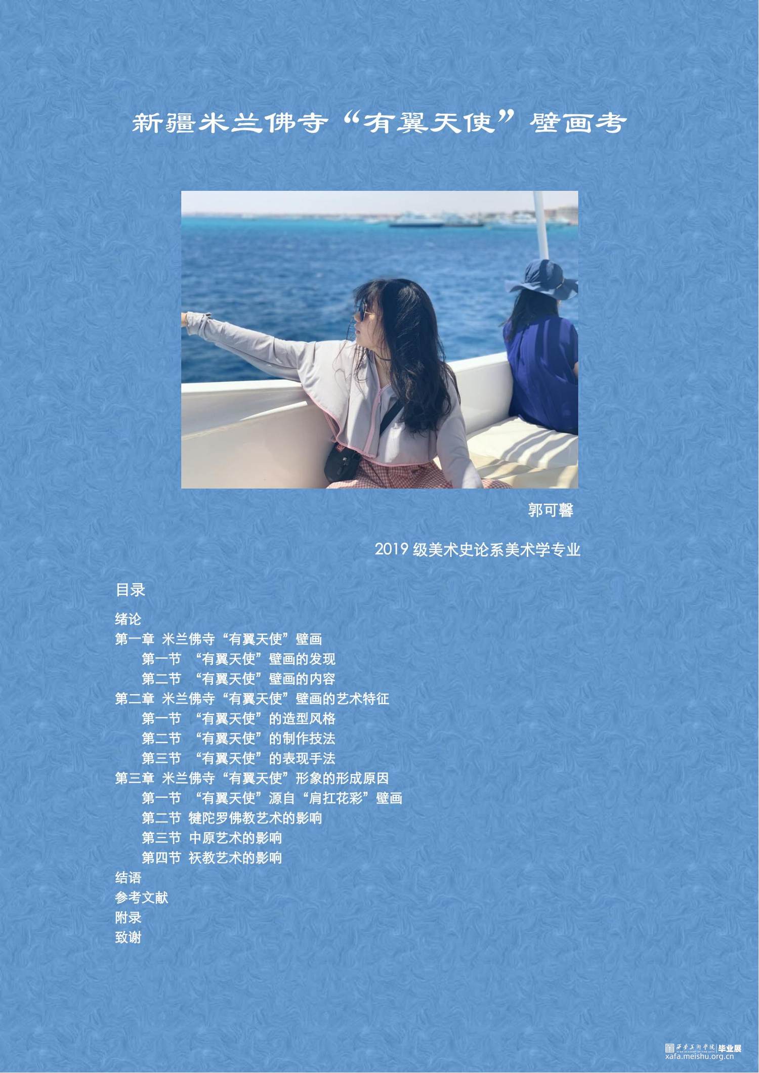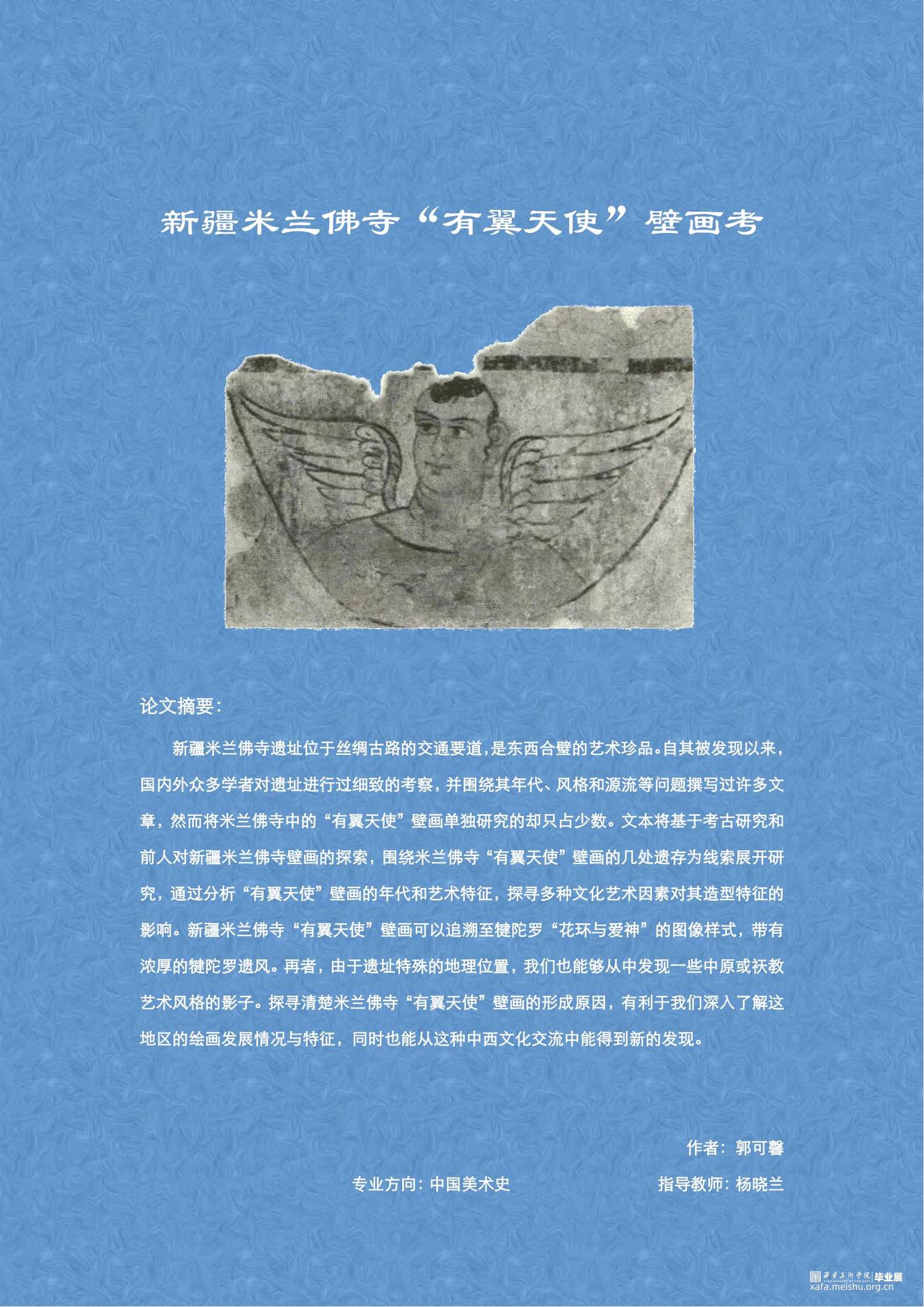 文本将基于考古研究和前人对新疆米兰佛寺壁画的探索,围绕米兰佛寺“有翼天使”壁画的几处遗存为线索展开研究,通过分析“有翼天使”壁画的年代和艺术特征,探寻多种文化艺术因素对其造型特征的影响,并得出以下结论: