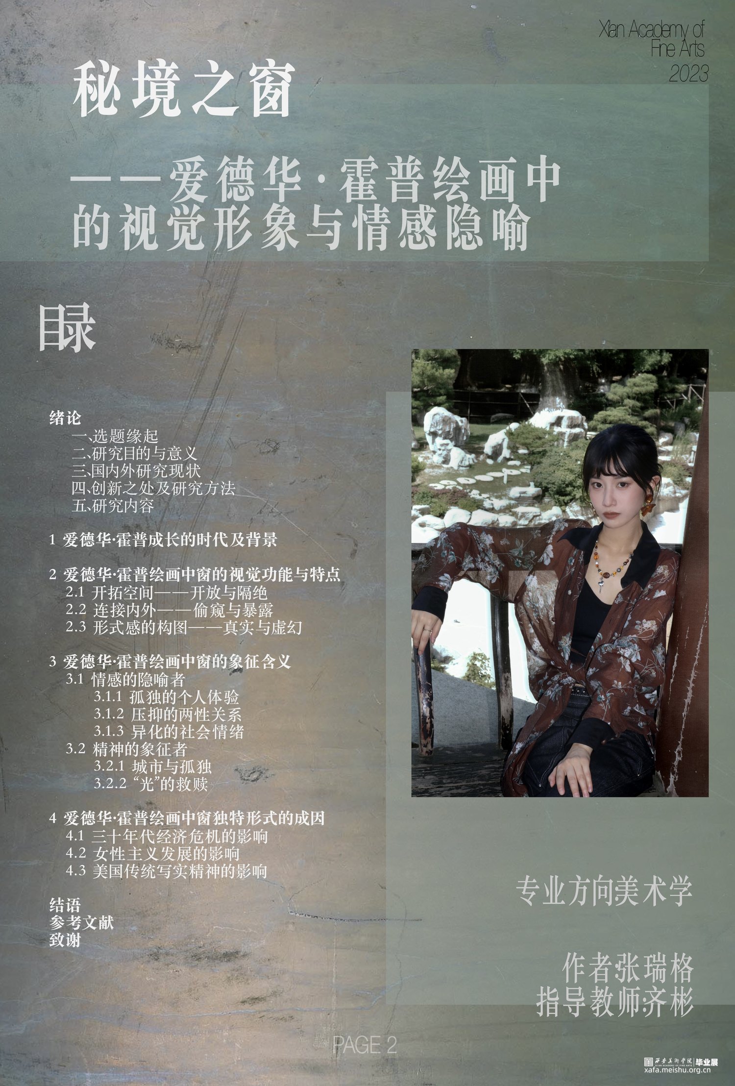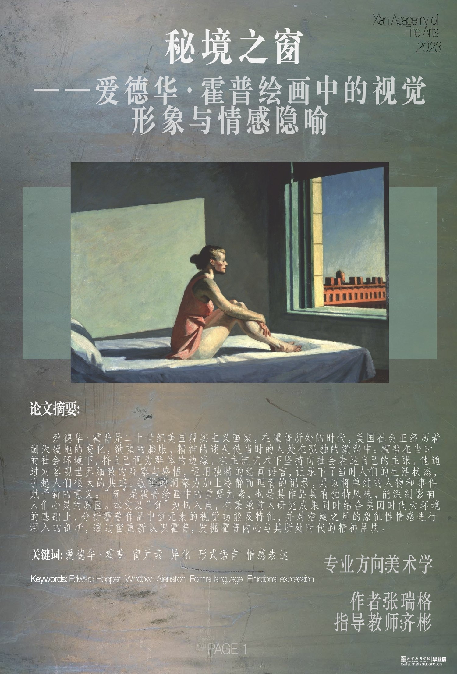 爱德华·霍普是二十世纪美国现实主义画家,在霍普所处的时代,美国社会正经历着翻天覆地的变化,欲望的膨胀,精神的迷失使当时的人处在孤独的漩涡中。霍普在当时的社会环境下,将自己视为群体的边缘,在主流艺术下坚持向社会表达自己的主张,他通过对客观世界细致的观察与感悟,运用独特的绘画语言,记录下了当时人们的生活状态,引起人们很大的共鸣。敏锐的洞察力加上冷静而理智的记录,足以将单纯的人物和事件赋予新的意义。“窗”是霍普绘画中的重要元素,也是其作品具有独特风味,能深刻影响人们心灵的原因。本文以“窗”为切入点,在秉承前人研
