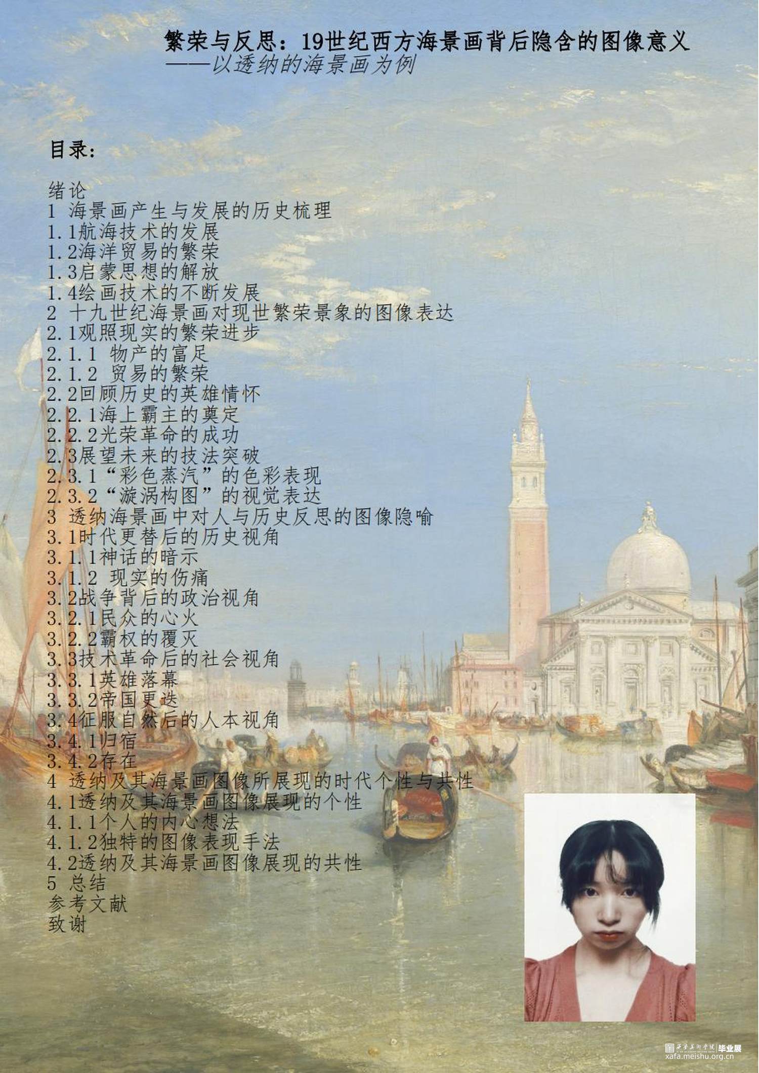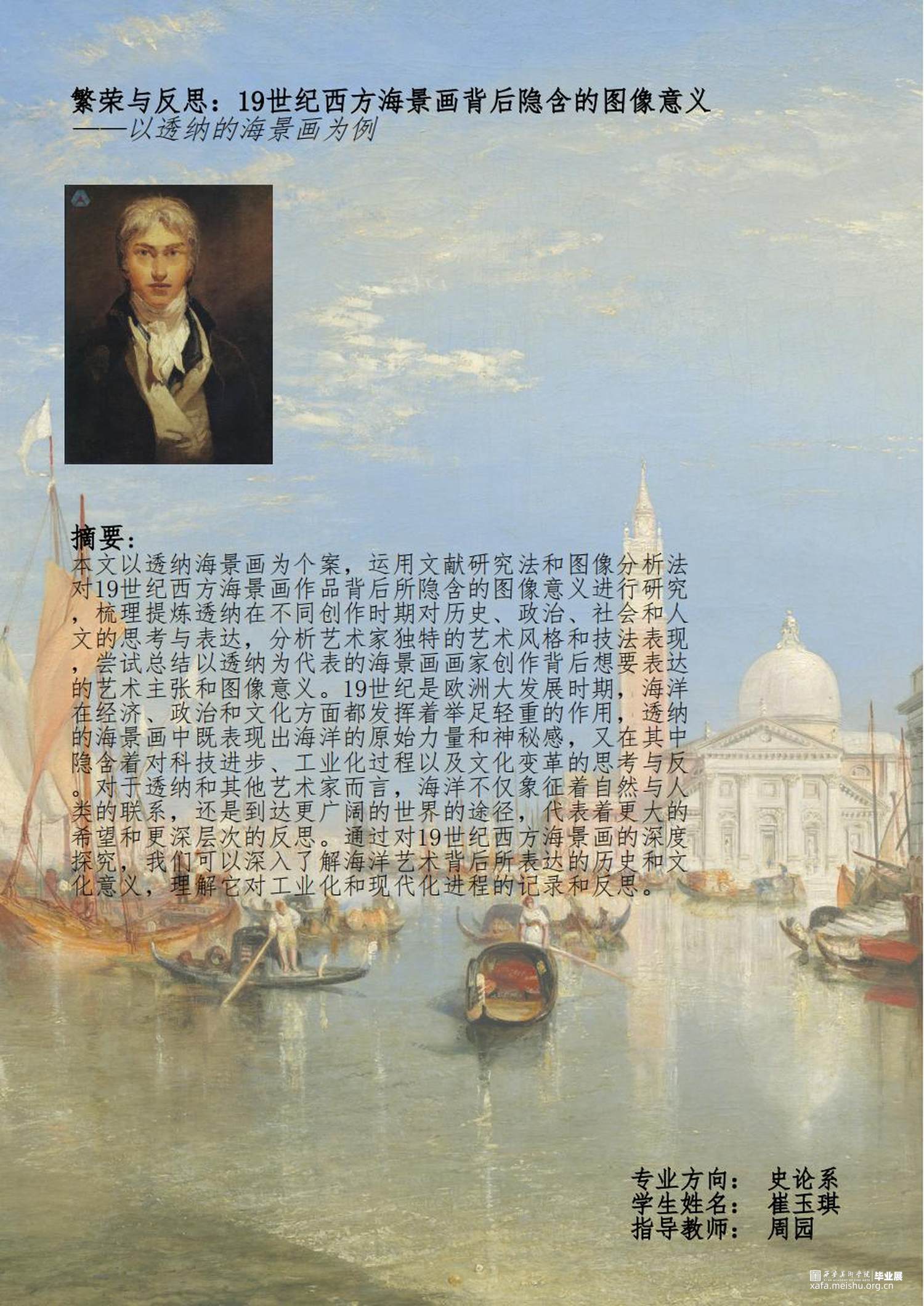 本论文以透纳的海景画为例,对19世纪西方海景画中蕴含的图像意义进行分析研究。揭示19世纪西方海景画的发展历程和艺术特点,探究其与当时社会、文化、政治背景的联系。研究透纳海景画作品的形式特点、艺术语言和主题内涵,探讨其背后隐含的图像意义和思想内涵。探究19世纪西方海景画的创作动机和视觉表达方式,分析其中涉及的社会、政治和文化现象,以及艺术家对其意义的反思和批评。