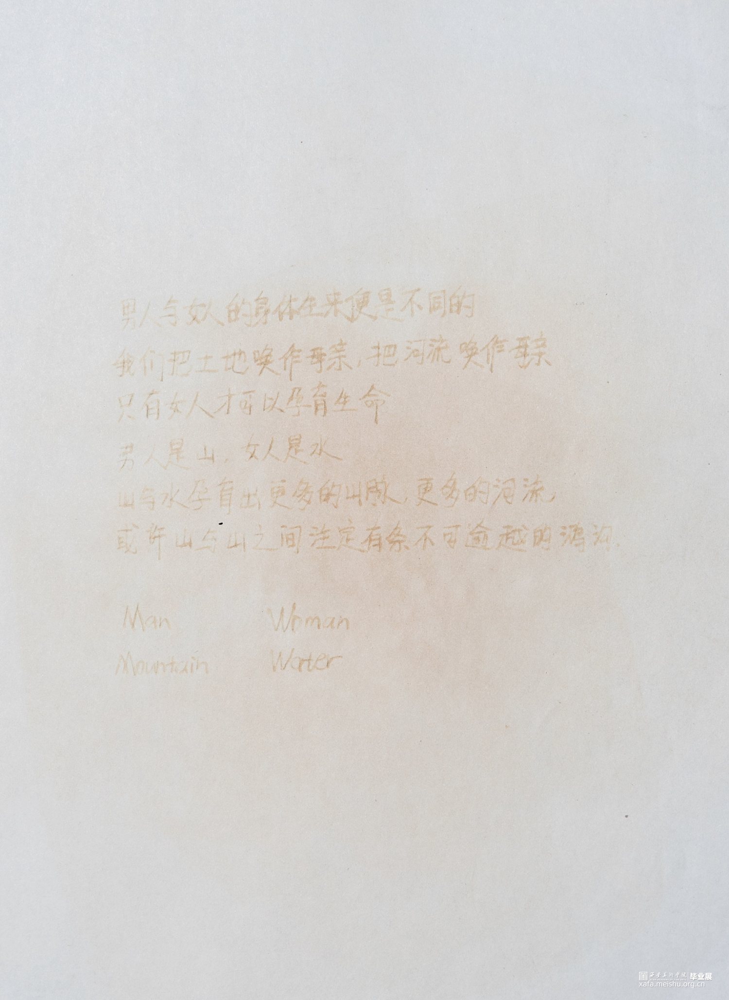 “男人是山,女人是水”这句话为两个板块之间的一个过渡,也是整个作品的中心,我借这句话来完善我对性别的探讨,表达了“男人要像山一样”这种刻板印象所带给我的压力。