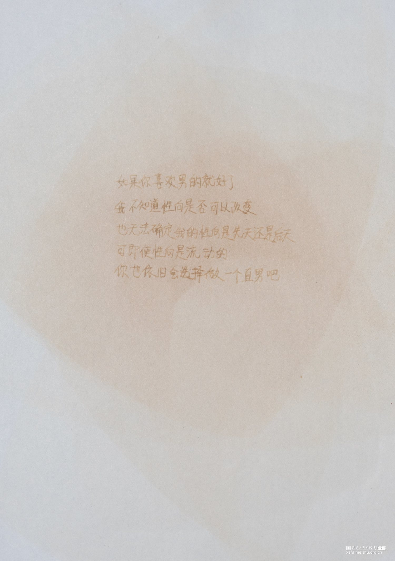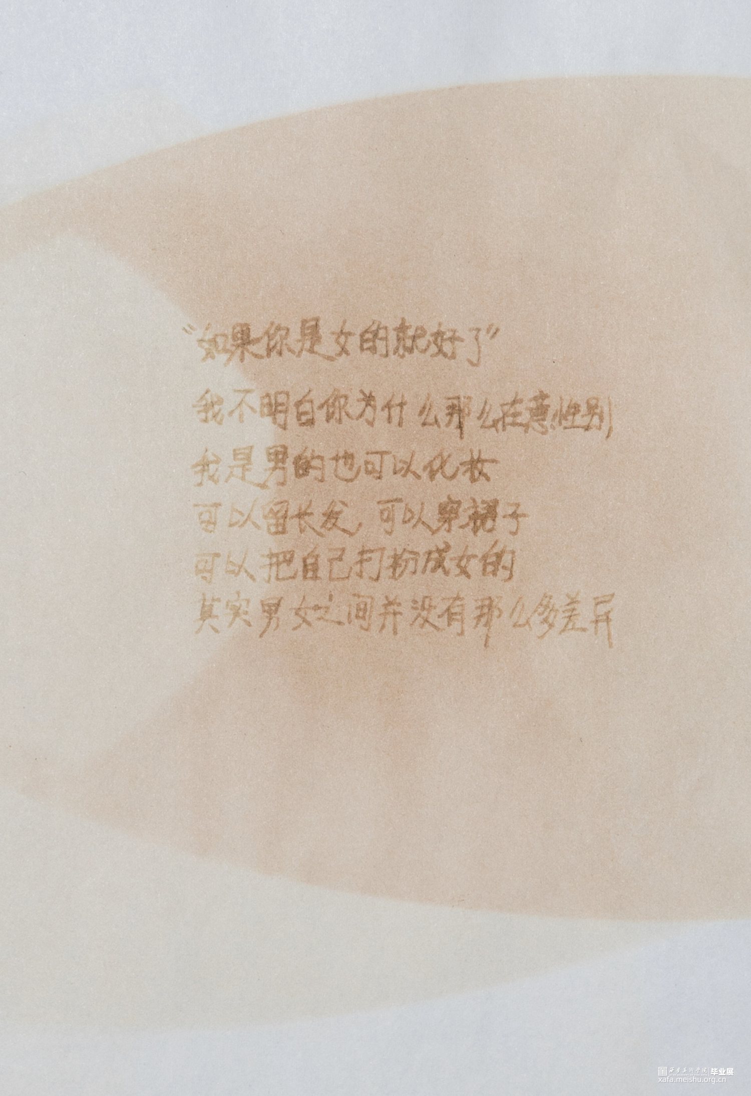 我喜欢上了自己的直男朋友,他对我说“如果你是女生就好了”。我被这句无心的话困扰了很久,开始变得极力想向对方证明,男的与女的其实没什么差别,希望他能抛开性别看待我们之间的关系。在作品中,我把自己幻想成女生,由“男人是山,女人是水”这句话去探索男女的差异,再由图像结合视频描述自己的成长经历,探讨性向是否可以改变。在意识到自己无法成为女的,对方也不会喜欢男的后,我逐渐接受现实并从这段关系中走出。整个作品既是自己的臆想,也是一个自省、自疗的过程。