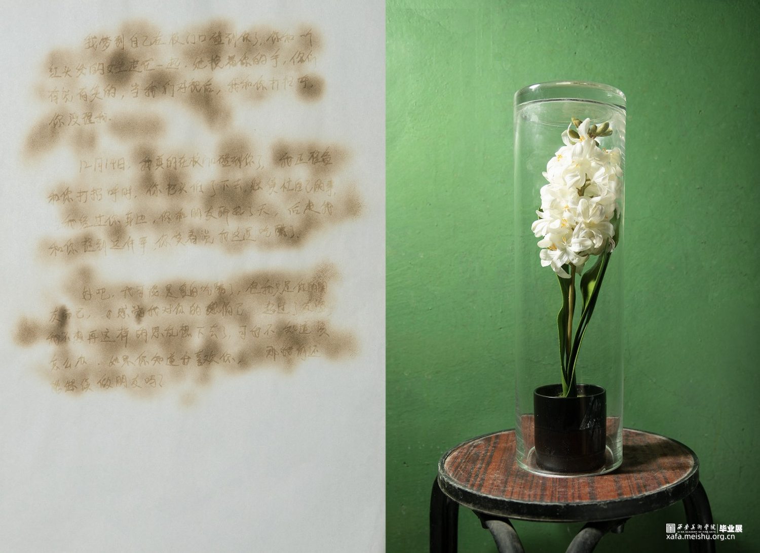 作品的叙事结构上,我将图片编排成4个部分,以用醋写的信作为开头来交代故事的发生背景,结合风信子的花语表达我对他无法开口的感情(我作为他的朋友没资格吃醋)。之后文字的作用便为“转场”,是一个章节的开头或总结。故事从我喜欢上直男朋友展开,由他的一句“如果你是女生就好了,开始较为表面地讨论男女之间的区别,将自己幻想成一个女性,接着是更深层次探索男女身体上的差异,意识到男女生来便是不同的,之后进入下一段臆想——对方会不会喜欢上男生,即性向是否可以改变?这一部分我把自己当成一个案例,从自己小时候的一些行为切入,来探讨性向的先天/后天性,视频则是这部分内容更为详细的表达。结尾是我意识到我与他之间没有可能后逐渐放下,走出“失恋”的阴霾。
