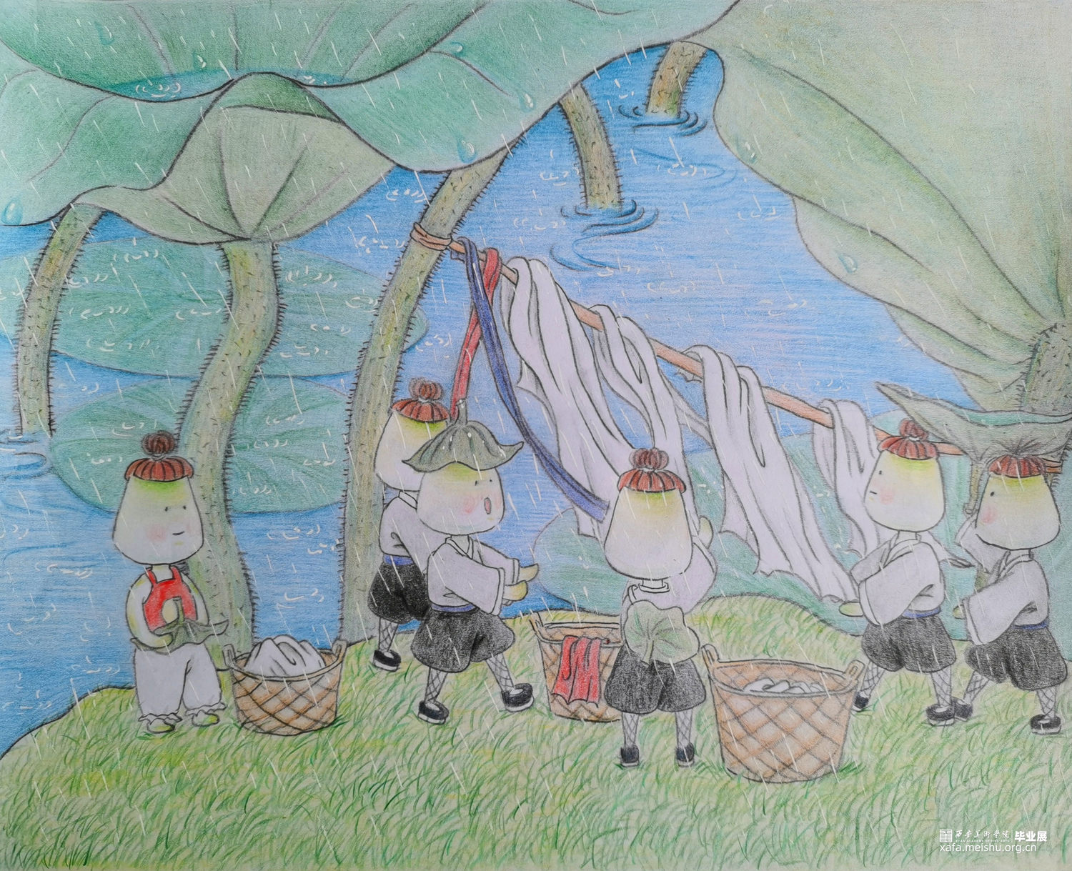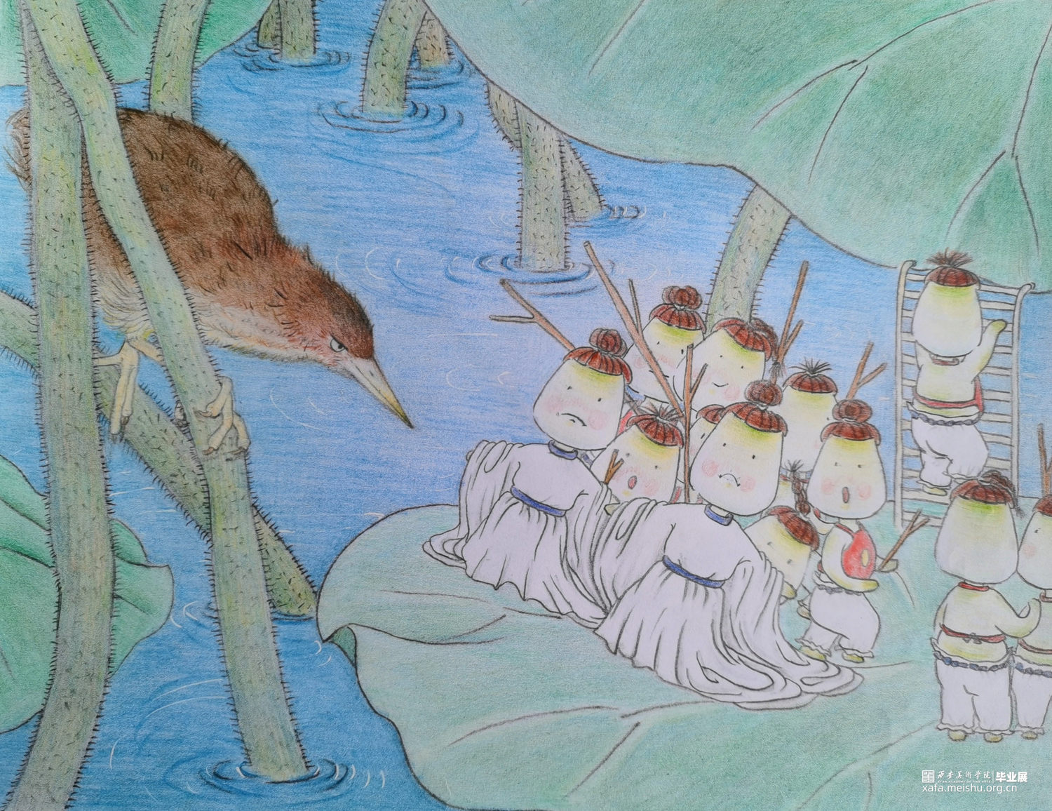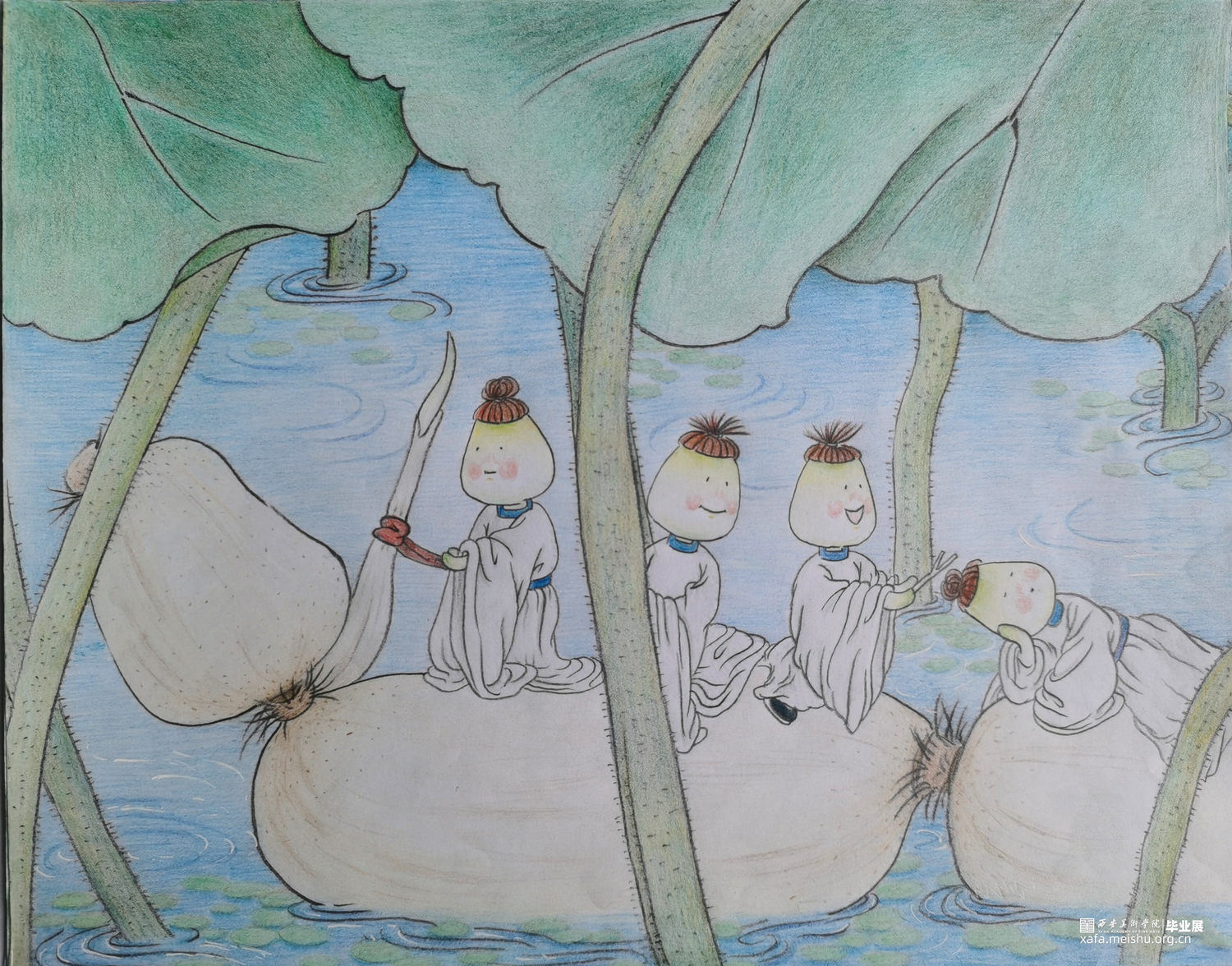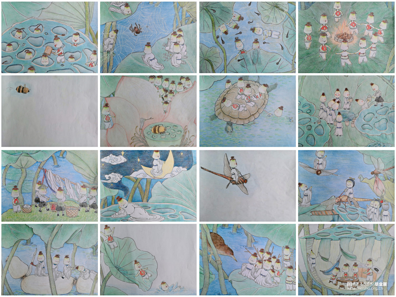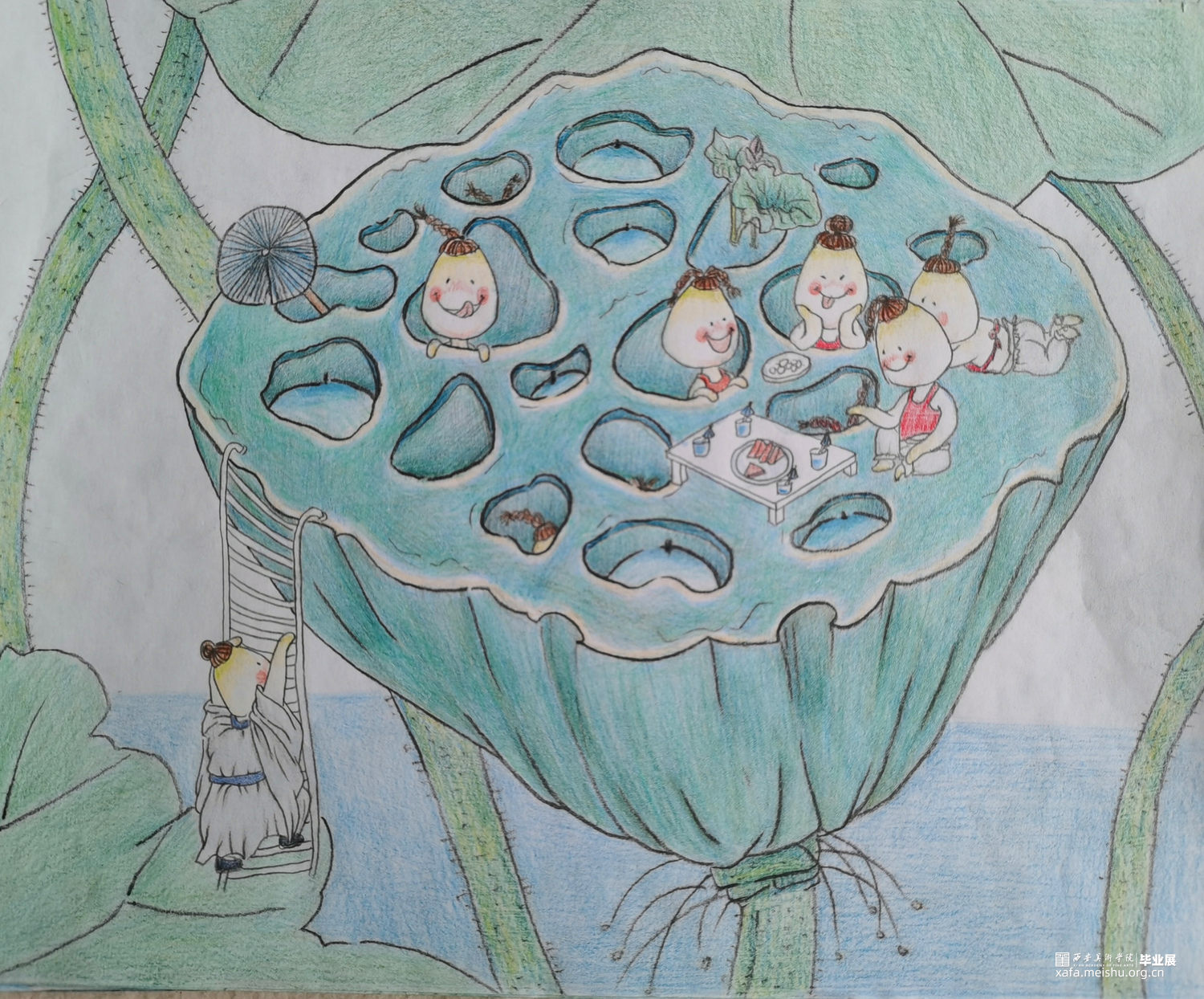 我选择的题材偏意象,莲子、莲蓬、荷叶是我画面主要构成元素。以多幅小画把莲子拟人化放在荷塘的不同角落中,它们忙碌着不同的事情。画面以纸本设色的形式呈现。引用传统绘画方式绘画生活场景。现实中的莲子在我的画面中幻化成“莲仔”。再用“莲仔”来表达我看见的莲世界也把我内心纯真的那一块展现在画面中,这也使得整个画面充满奇特的童话般的感觉。把观者拉入这梦幻的童话场景中让他们体会这纯真与美好。