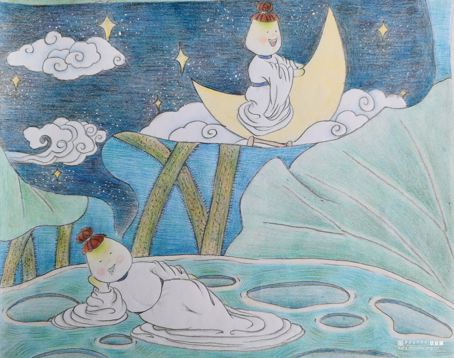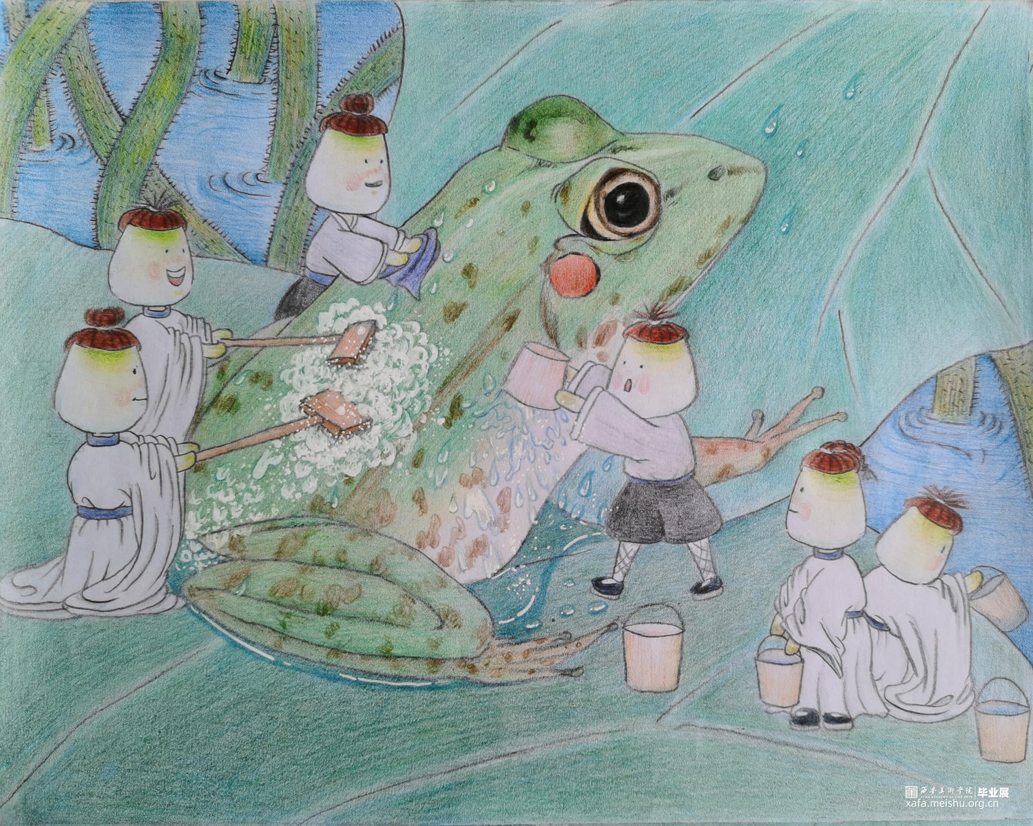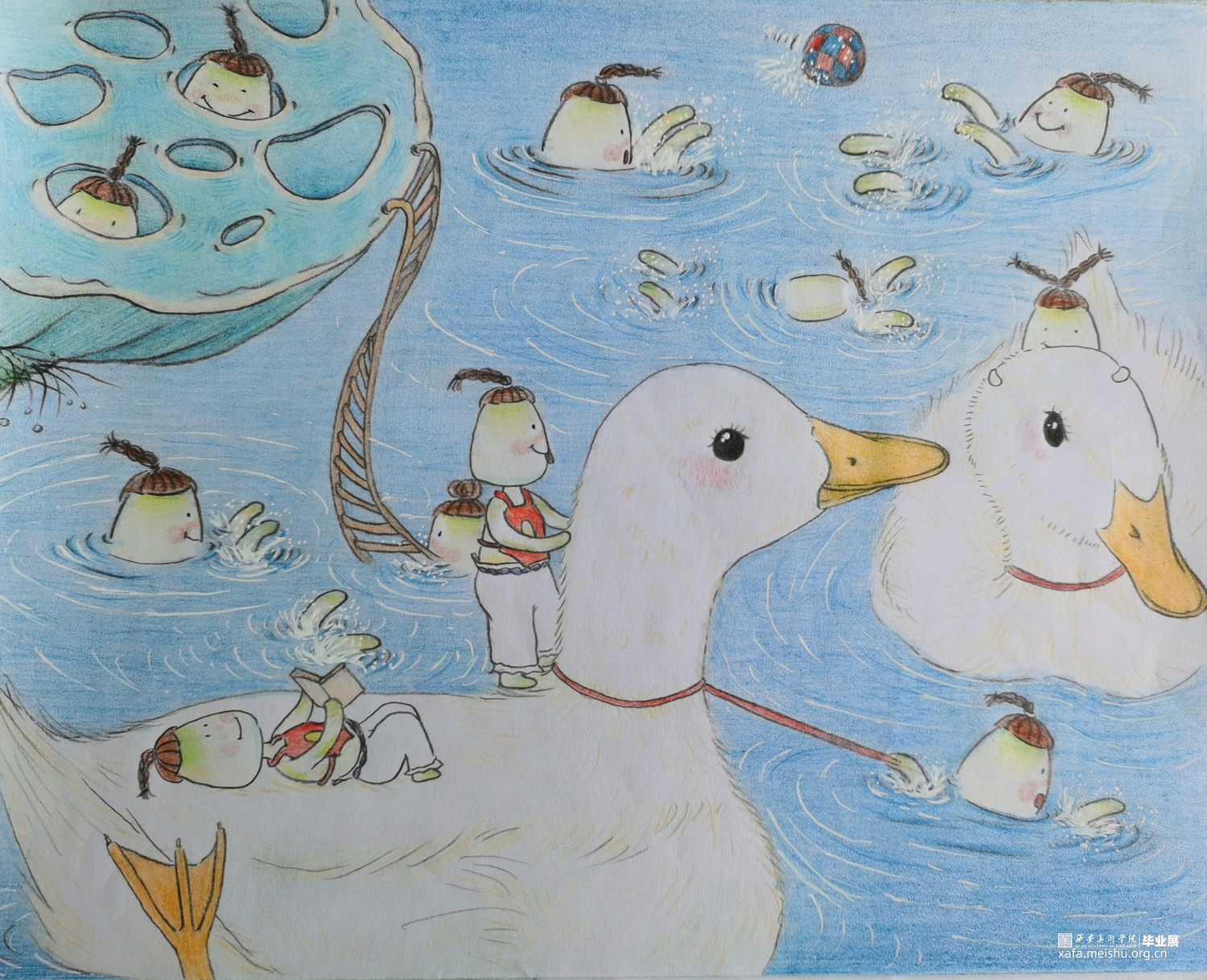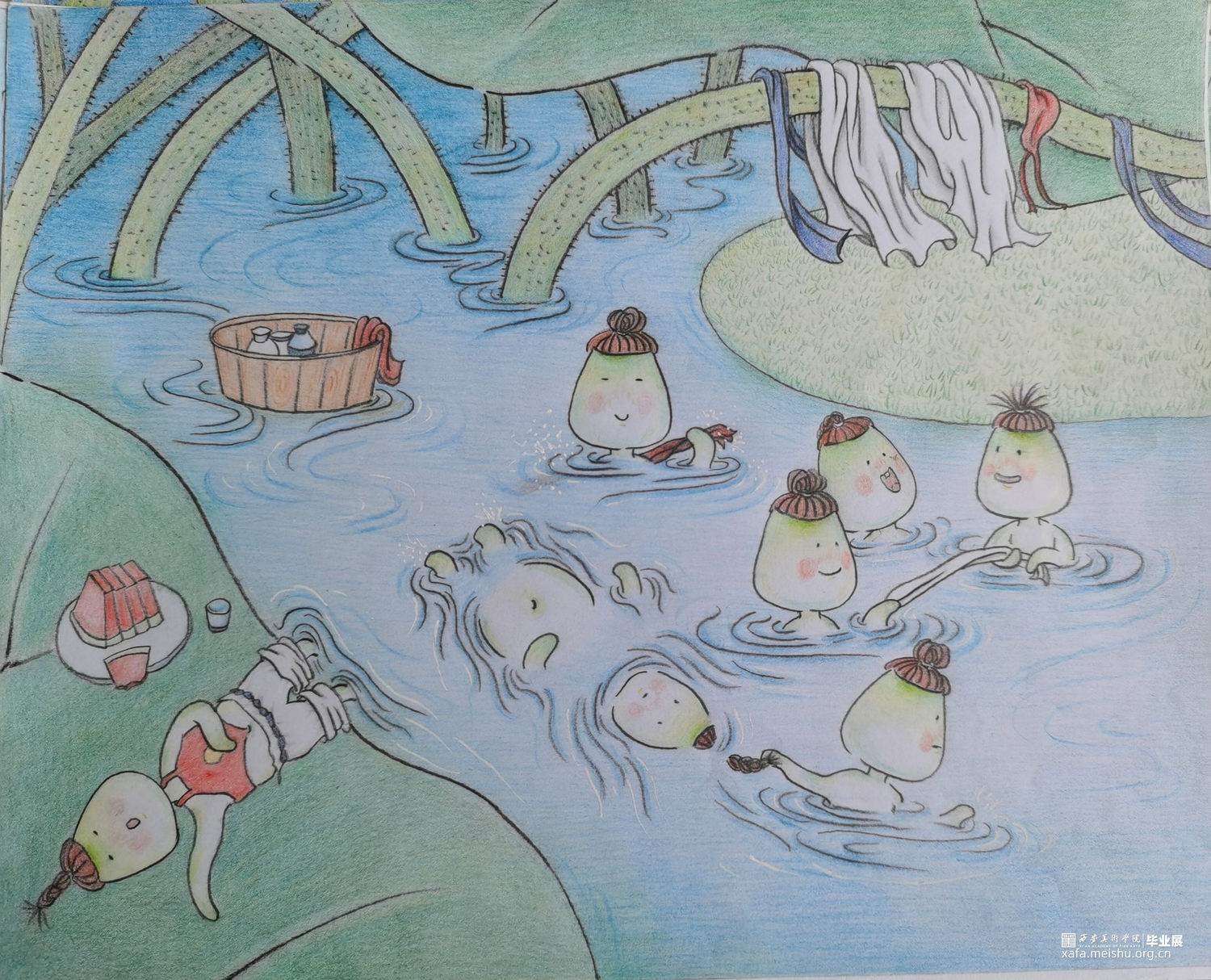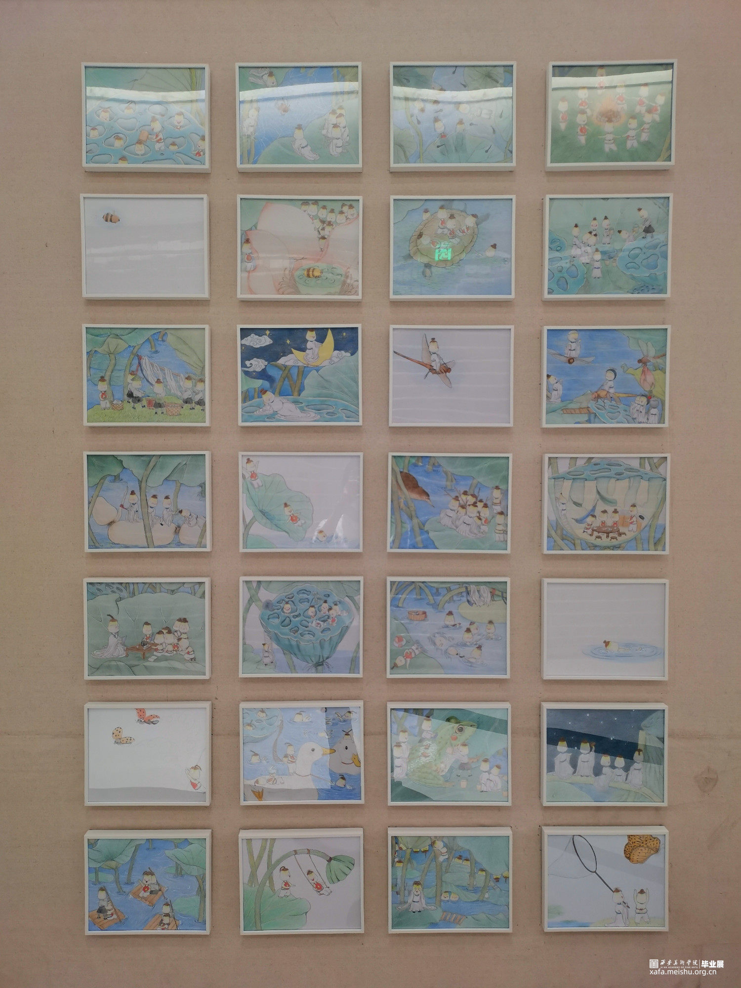 我选择的题材偏意象,莲子、莲蓬、荷叶是我画面主要构成元素。以多幅小画把莲子拟人化放在荷塘的不同角落中,它们忙碌着不同的事情。画面以纸本设色的形式呈现。引用传统绘画方式绘画生活场景。现实中的莲子在我的画面中幻化成“莲仔”。再用“莲仔”来表达我看见的莲世界也把我内心纯真的那一块展现在画面中,这也使得整个画面充满奇特的童话般的感觉。把观者拉入这梦幻的童话场景中让他们体会这纯真与美好。