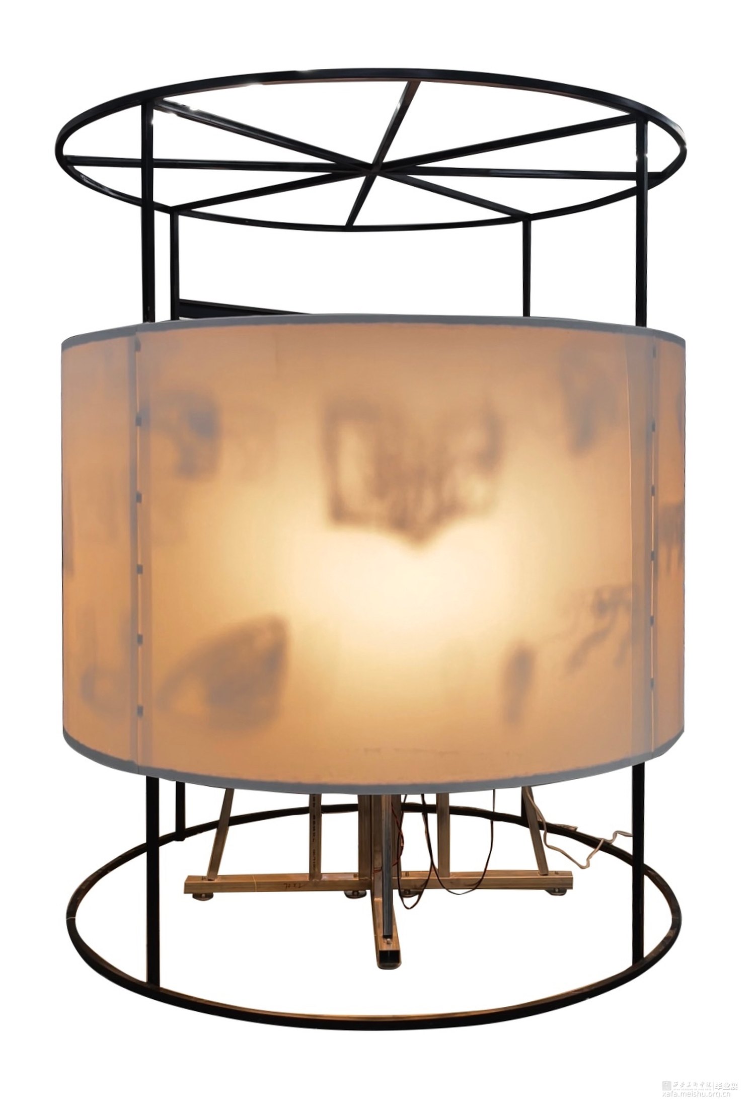 灵感来自皮影戏,将这个传统文化作为主要元素融入进这个装置作品当中。作品由几个金属结构为框架,透光投影幕布为表层的圆柱体构成。圆柱体表面有横排的图像,其中有远中近三景构成,呈现出一个有虚实远近主次的完整画面。观者围绕作品走动,感受画面的变化,又犹如中国画中的卷轴,有移步换景之感。作品在较为阴暗环境下展出,整体呈现暖色色调,暧昧的光影下,缓缓流露出对传统艺术与文化的流连情绪。也提问出:高速发展的世界中,属于我们自己的过去,是否依然被铭记着?