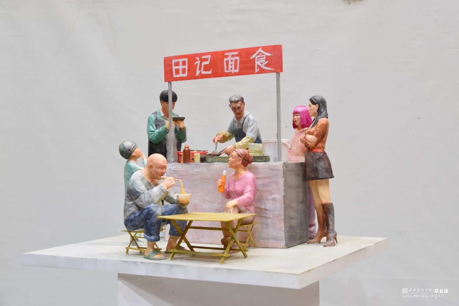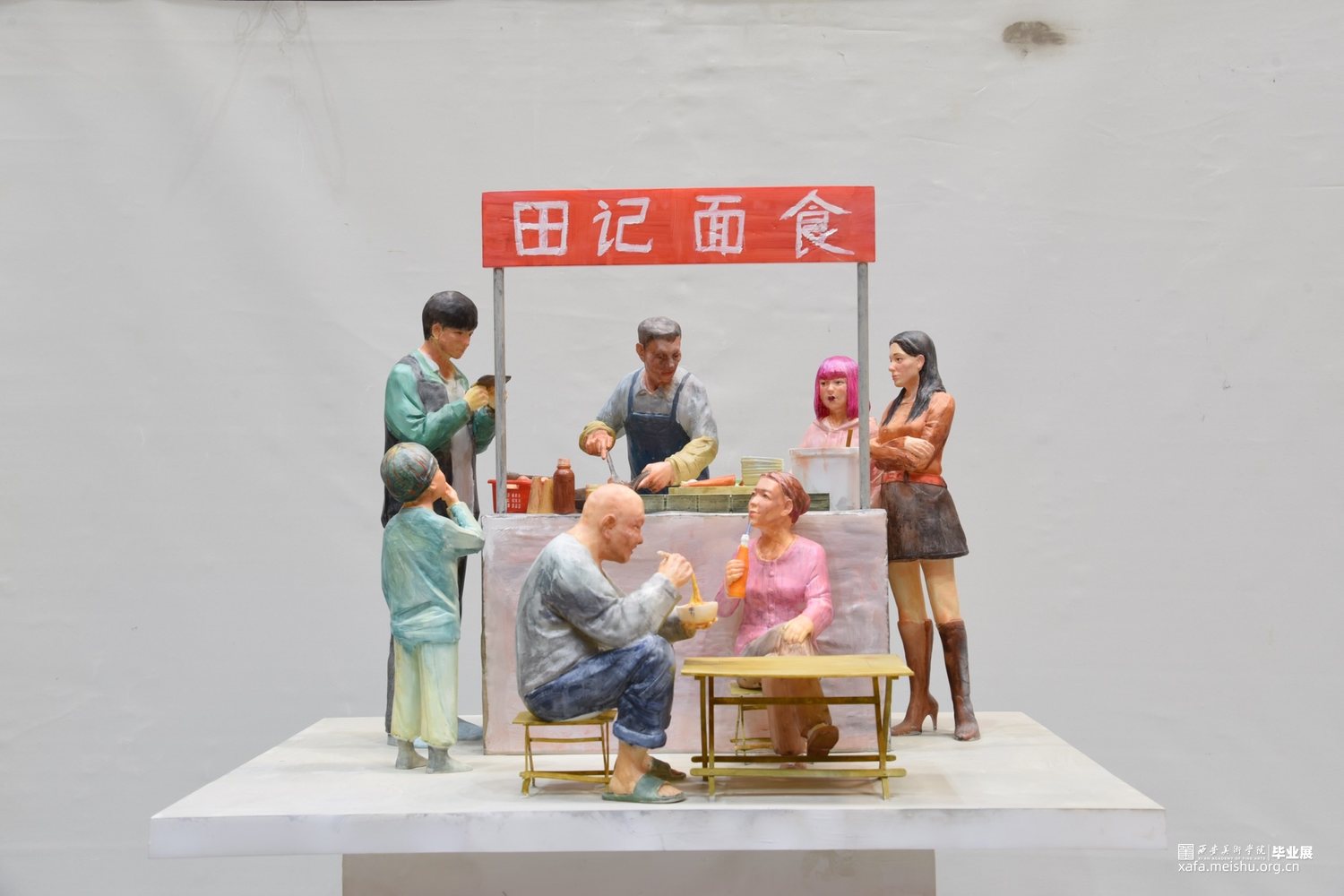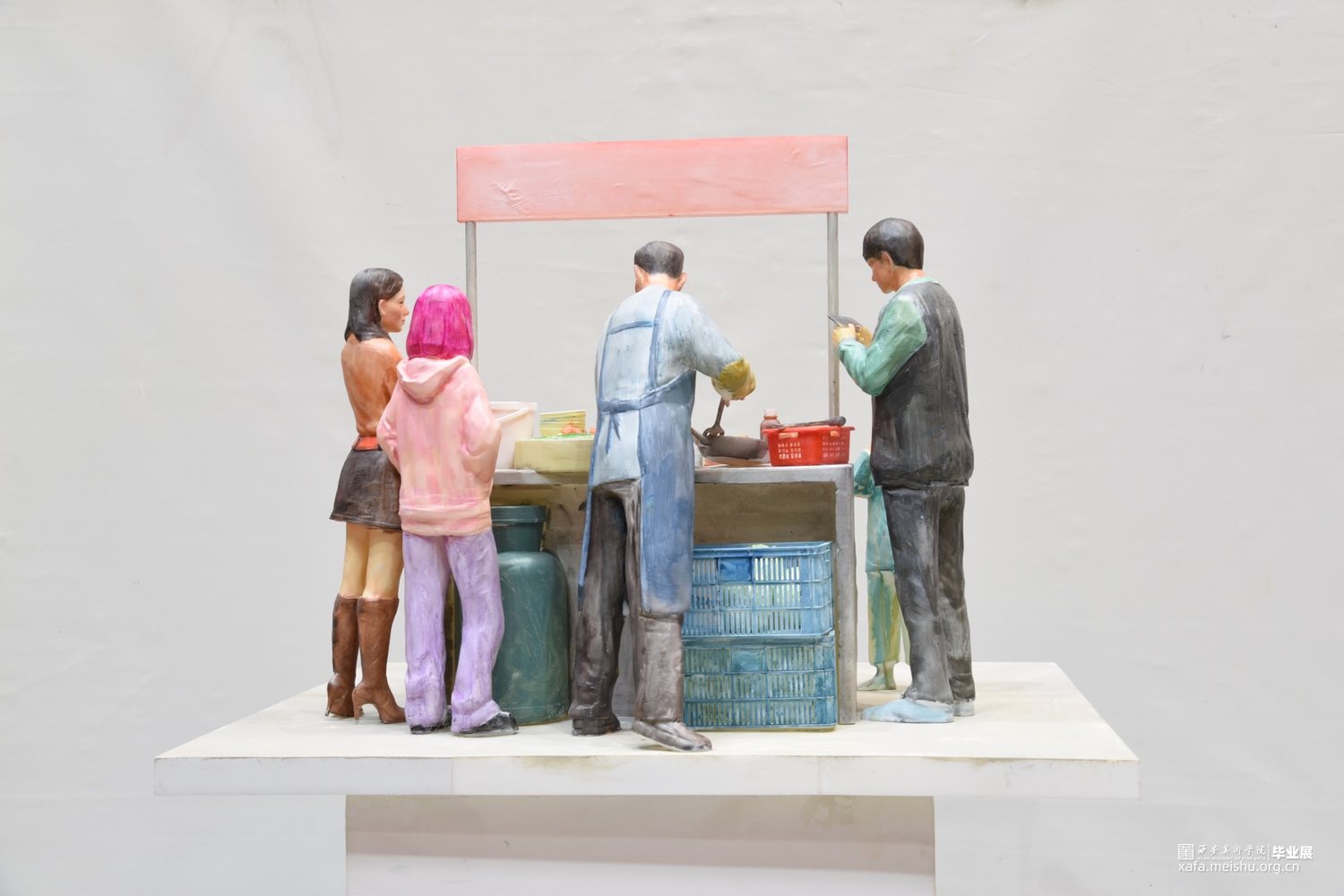 《夜市》描绘了街头聚集了各种人物的夜市小摊,充满了城市中的人情味 。运用3d打印的树脂材料,设计了七个形象各异的市井人物:笑口常开的老板、头发彩色的女大学生、端庄大方的职业女性、女子高中生、吃面的中年男人和中年女人。用饱和艳丽的丙烯颜料上色,展示丰富多彩的日常生活。