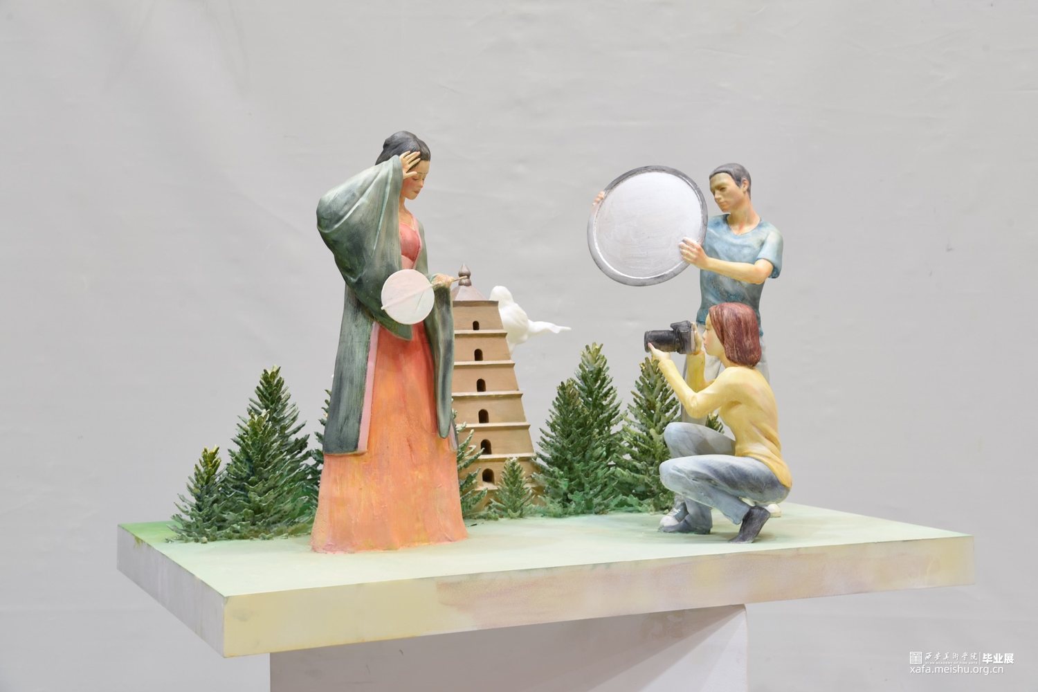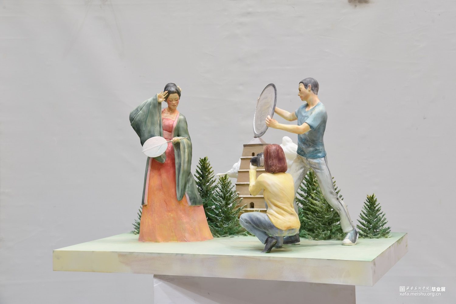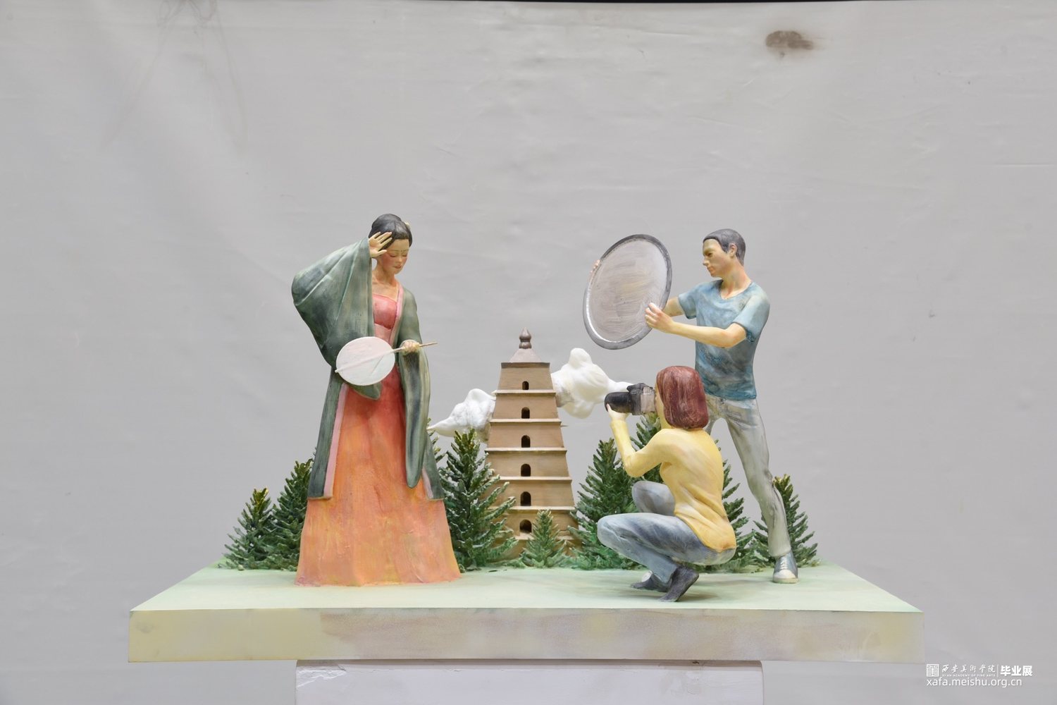 《汉服体验日》描绘了身着汉服与西安著名景点大雁塔合照的一组人物,身后是远景的大雁塔。穿汉服逛街拍照已然成为近些年西安游客和年轻人的休闲方式,运用了3d打印树脂材料,色粉彩铅上色,现代的造型中透露出一丝古朴