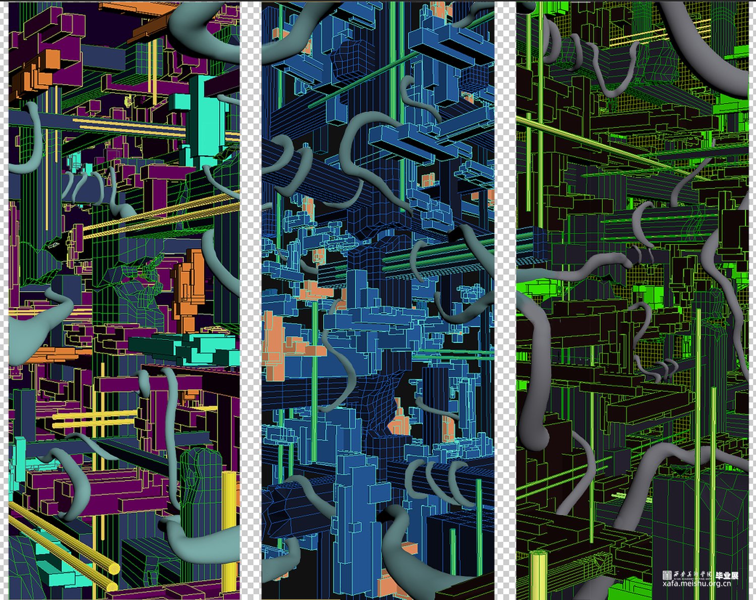 本作品试图运用不断交织的方阵和线条组成一系列异样的空间场域。它既是一个复杂、略带混乱而有一定规律的物理空间,又是对内心世界的一种呈现,以及对曲折而破损心理的思考。