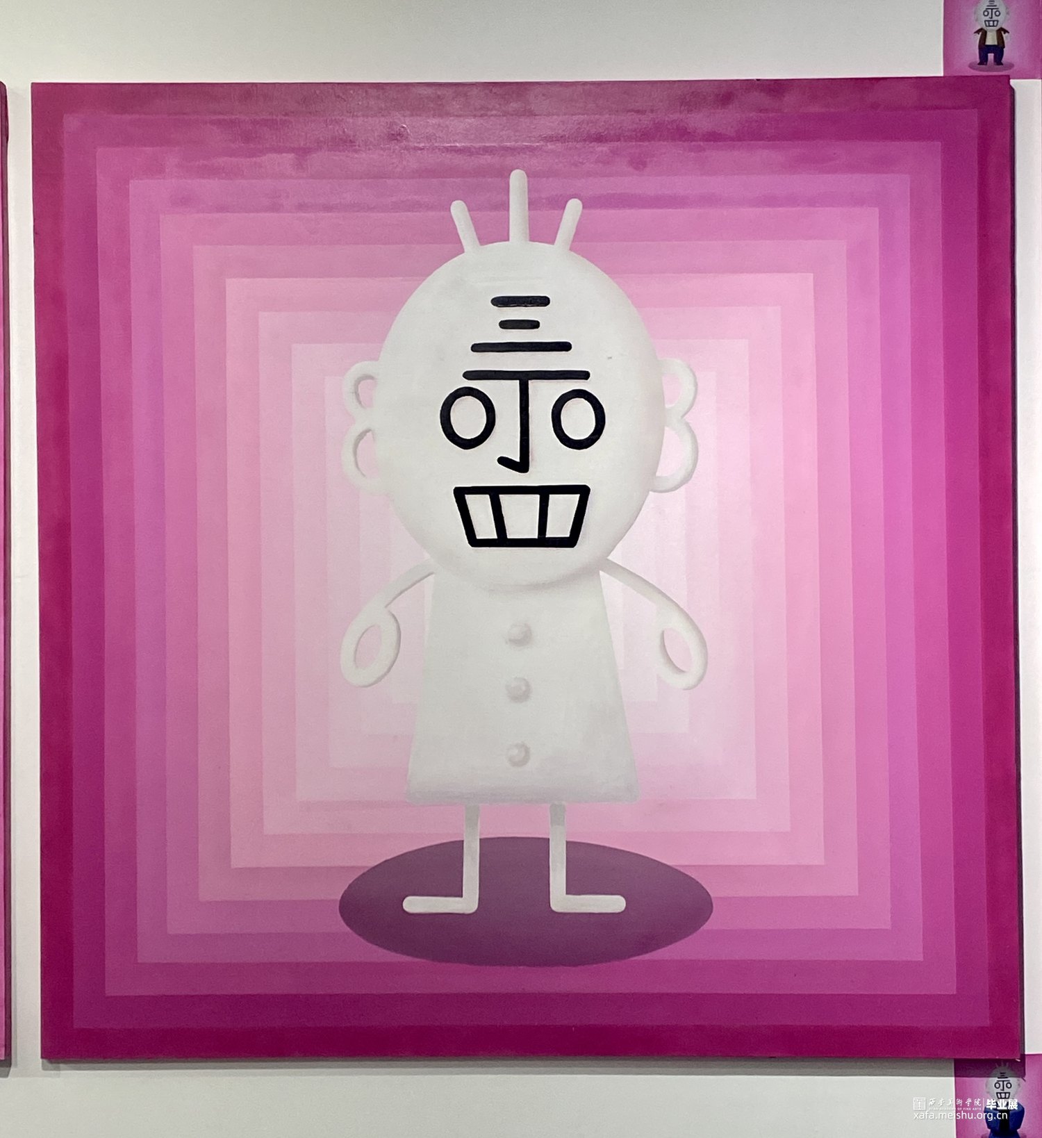 作品使用了“丁老头"这一带有共同回忆的涂鸦形象,在作品中,我希望我的绘画并不是一件“完成品”,而是沟通的桥梁,从而建立起观众与观众、观众与作者之间的联系。也希望可以引起观众对“艺术究竟能不真正回馈于人”的思考。