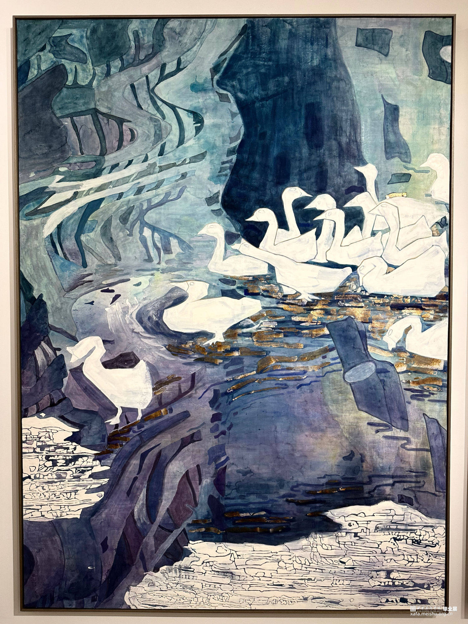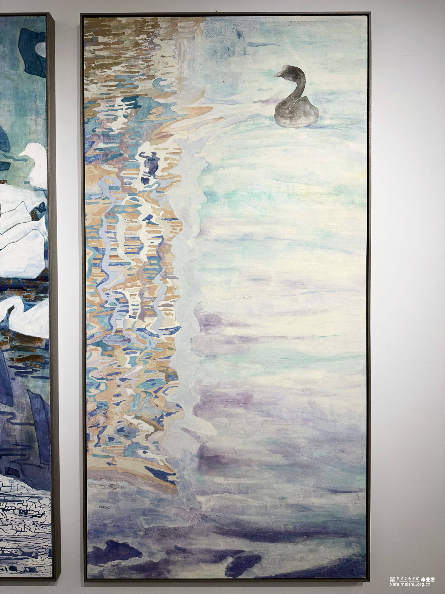 这两幅作品主要以矿物质颜料为主表现了明湖中母校的教学楼及天鹅,一黑一白映射了对这四年生活的回首观望以及说声再见。六月里,春去尽,迎来盛夏,一切仿佛定格在了画面中,恋恋不舍的情愫寄托在天鹅身上,给这美好时光画上句号。