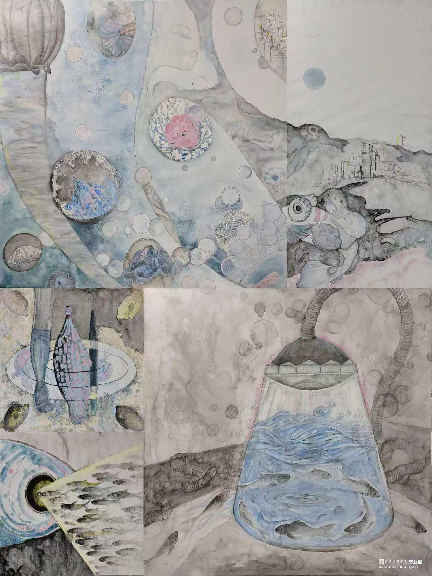 作品幻想海洋与我在同一空间,海洋置于楼房上空,海洋生物在画面中躲避和隐藏的状态,反映生活中我的迷茫和逃避。蓝色粉色混合形成梦幻的氛围,使人轻松、愉快,表现我在现实中寻求的舒适感。