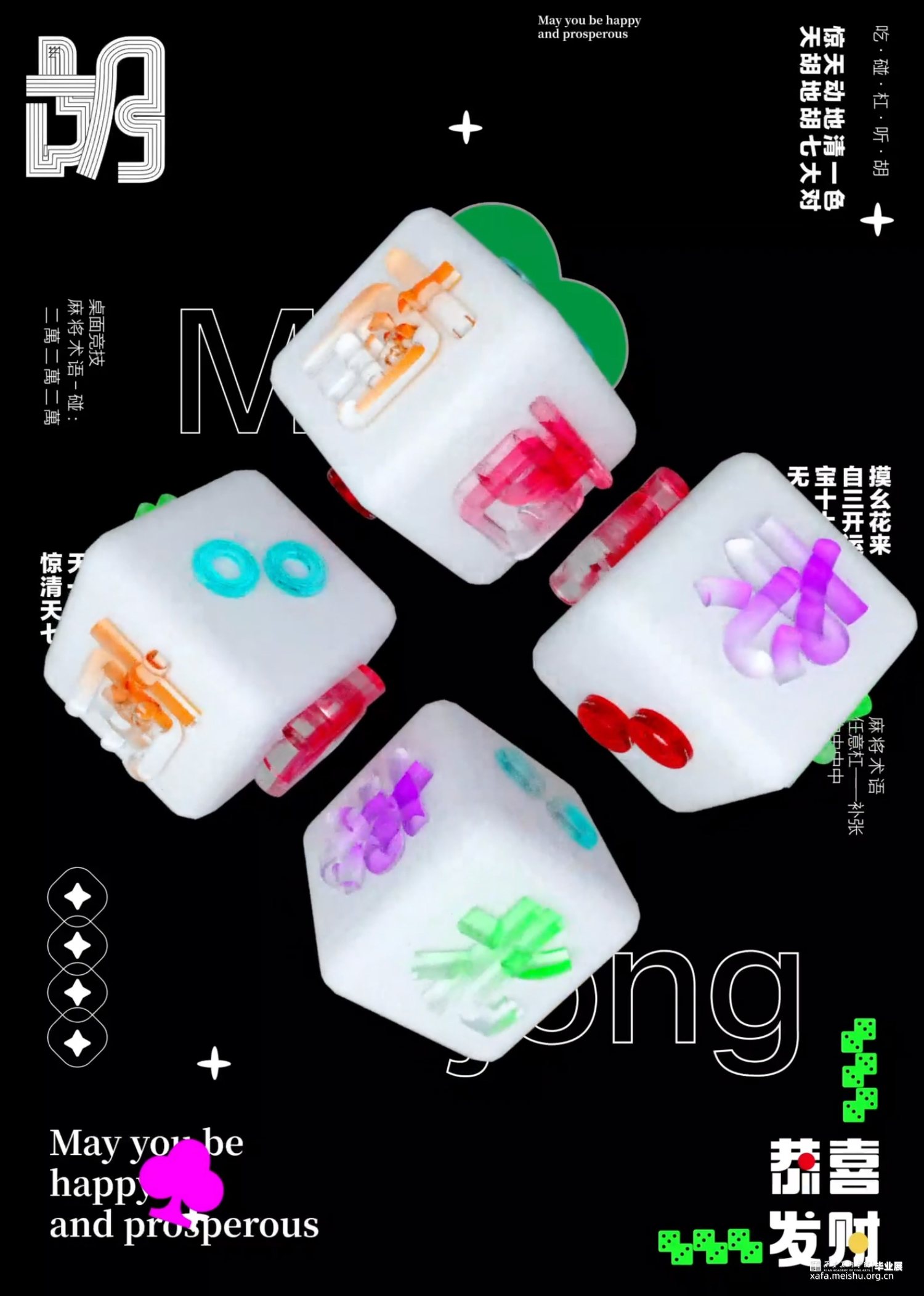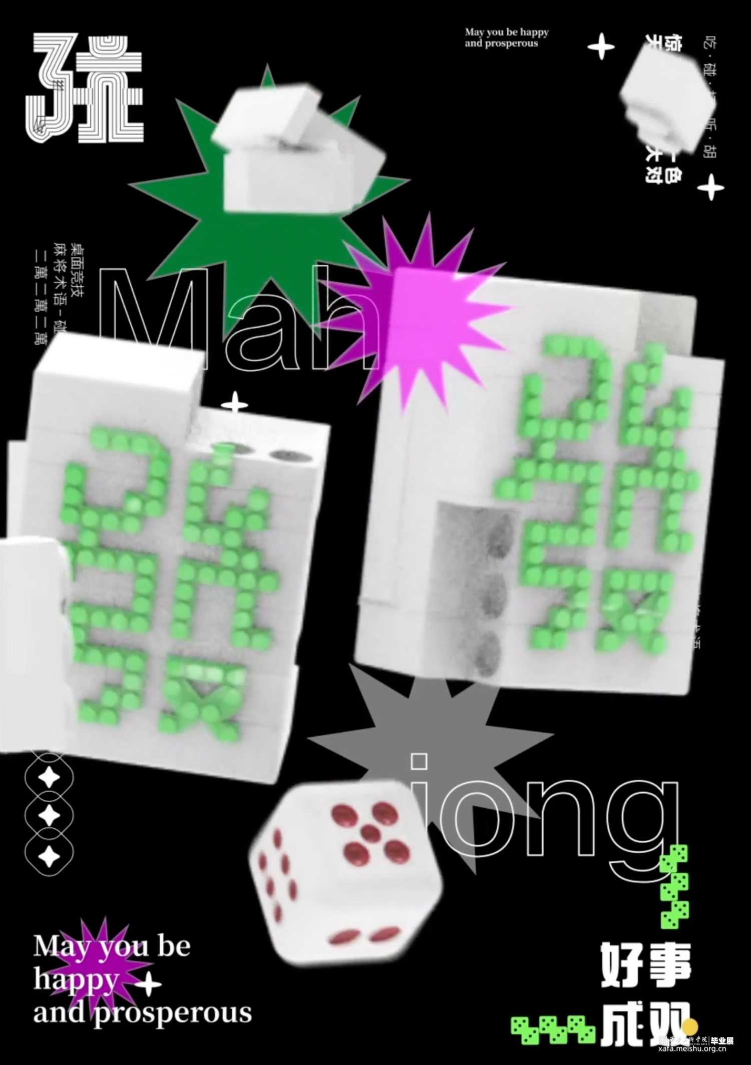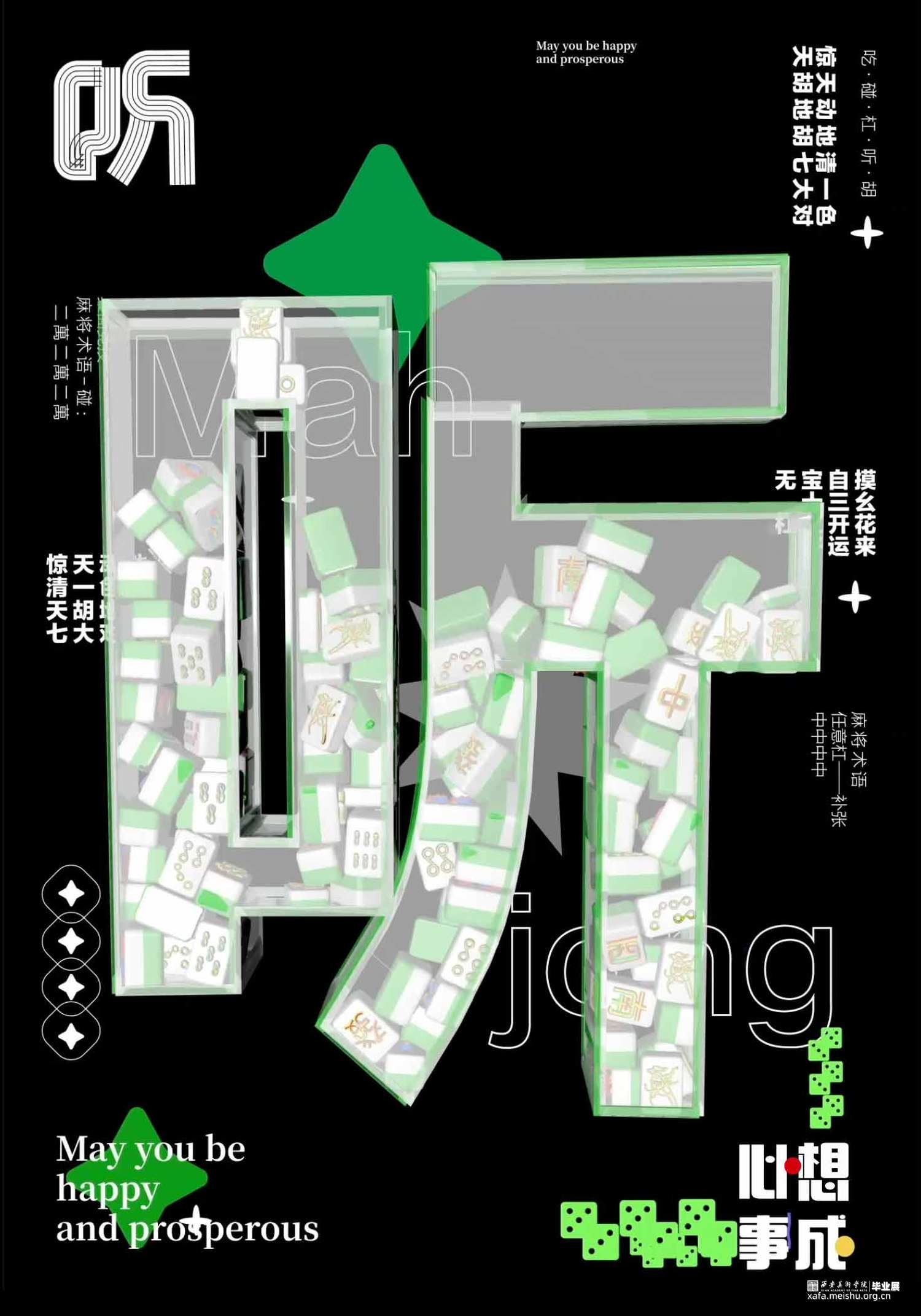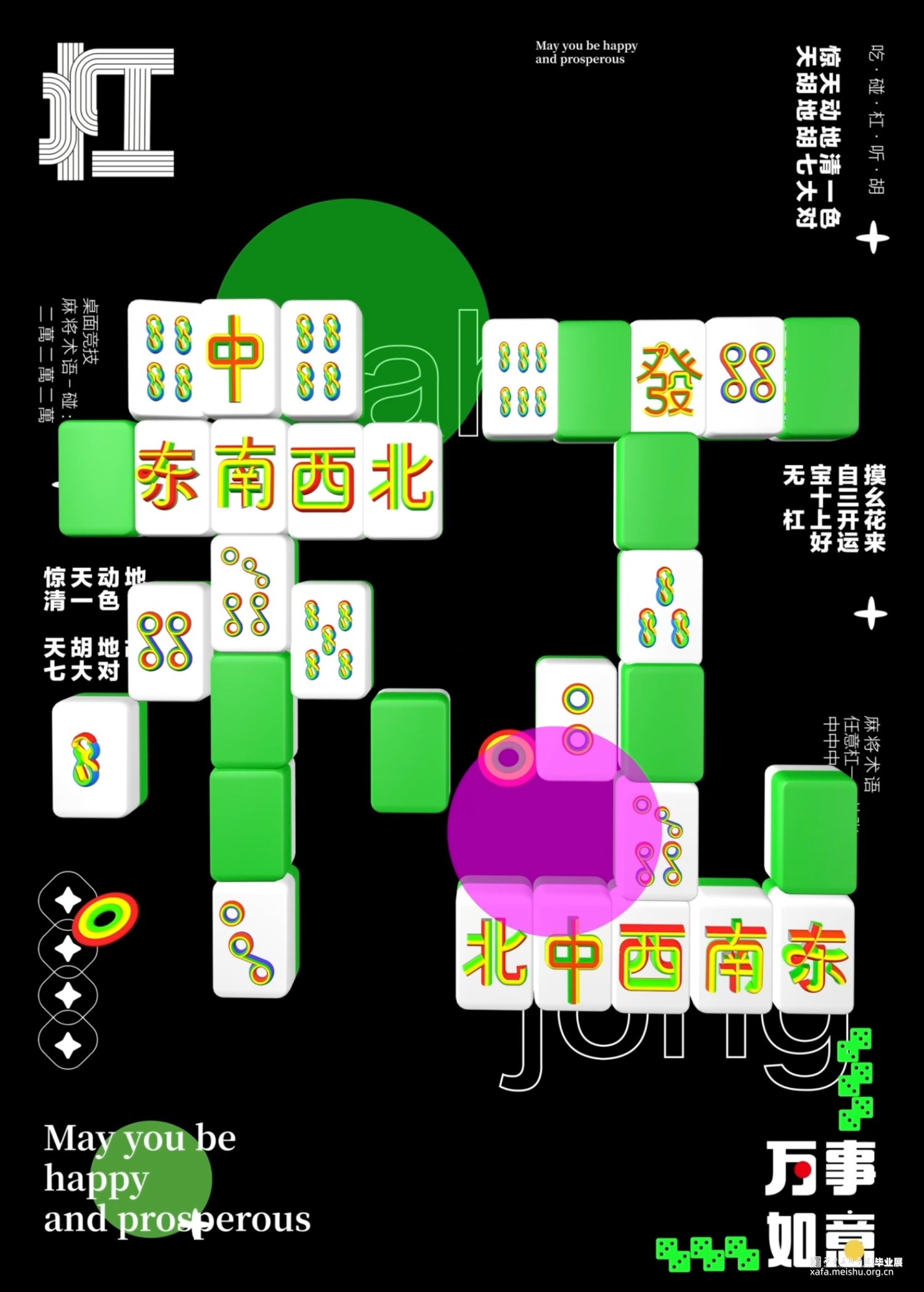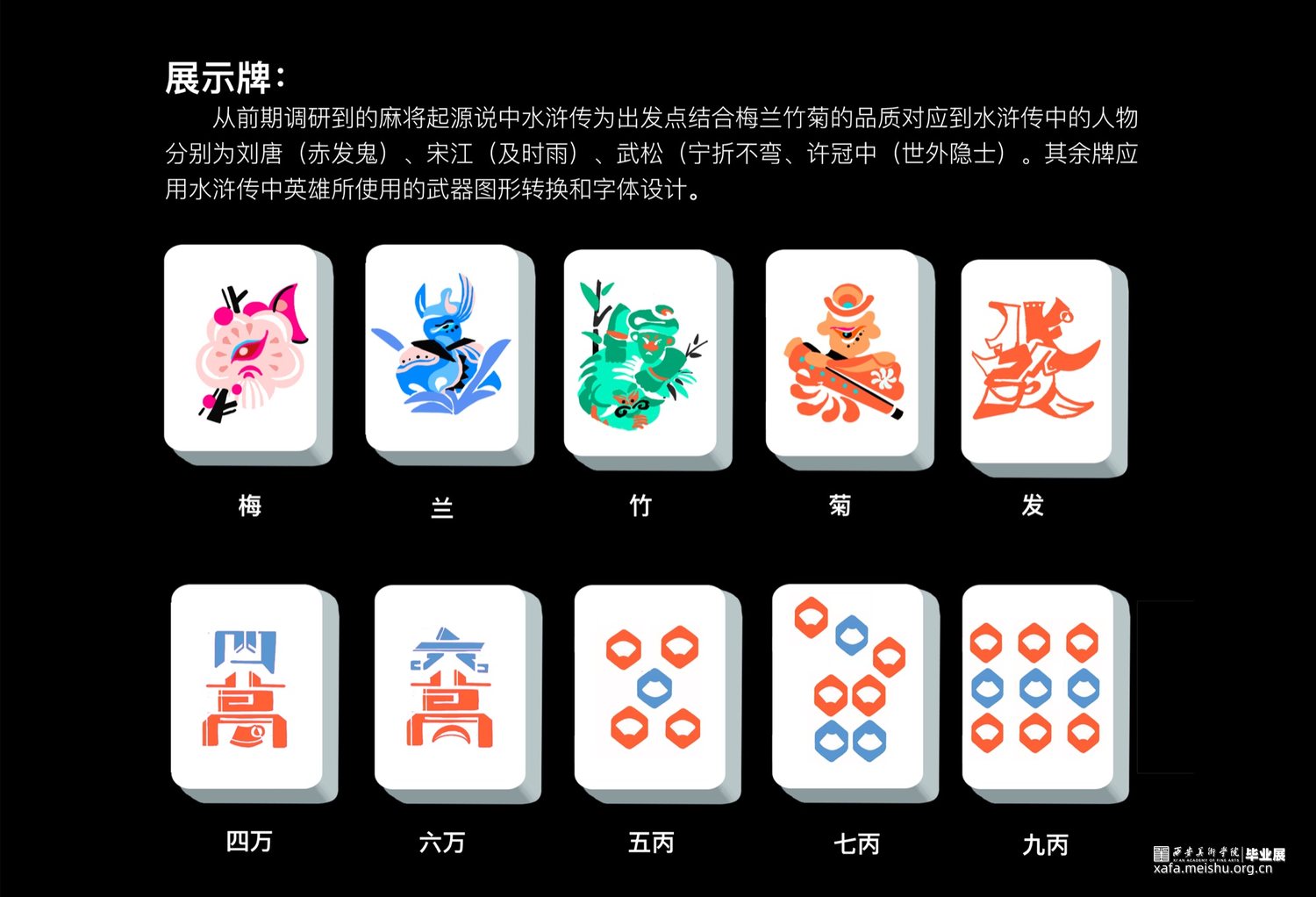 麻将是中华民族创造的古老牌类游戏之一,在中国人心中具有特殊地位。麻将是社会的产物,更是文化的缩影,但其深层的文化内涵却并不为当今世人所熟知。通过对麻将图形的视觉特征解析、文化内涵挖掘,从麻将起源说中,水浒传的人物转换为麻将牌图形的切入点,以原有的基础图形出发,将麻将图形与现代设计结合起来融合当下主流审美。使麻将能够得到更好的传承与发扬。在动态海报中,运用麻将术语碰杠听胡作为主要内容,结合碰杠听胡的麻将玩法含义以及单独的字面给人的第一感受,将文字意思用动态效果呈现出来,同时加入了当下流行小游戏的元素将麻将