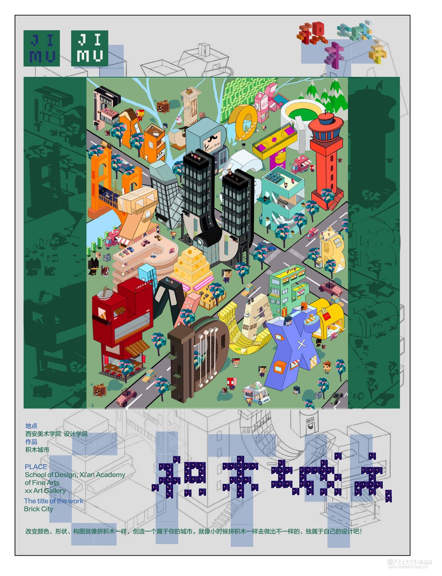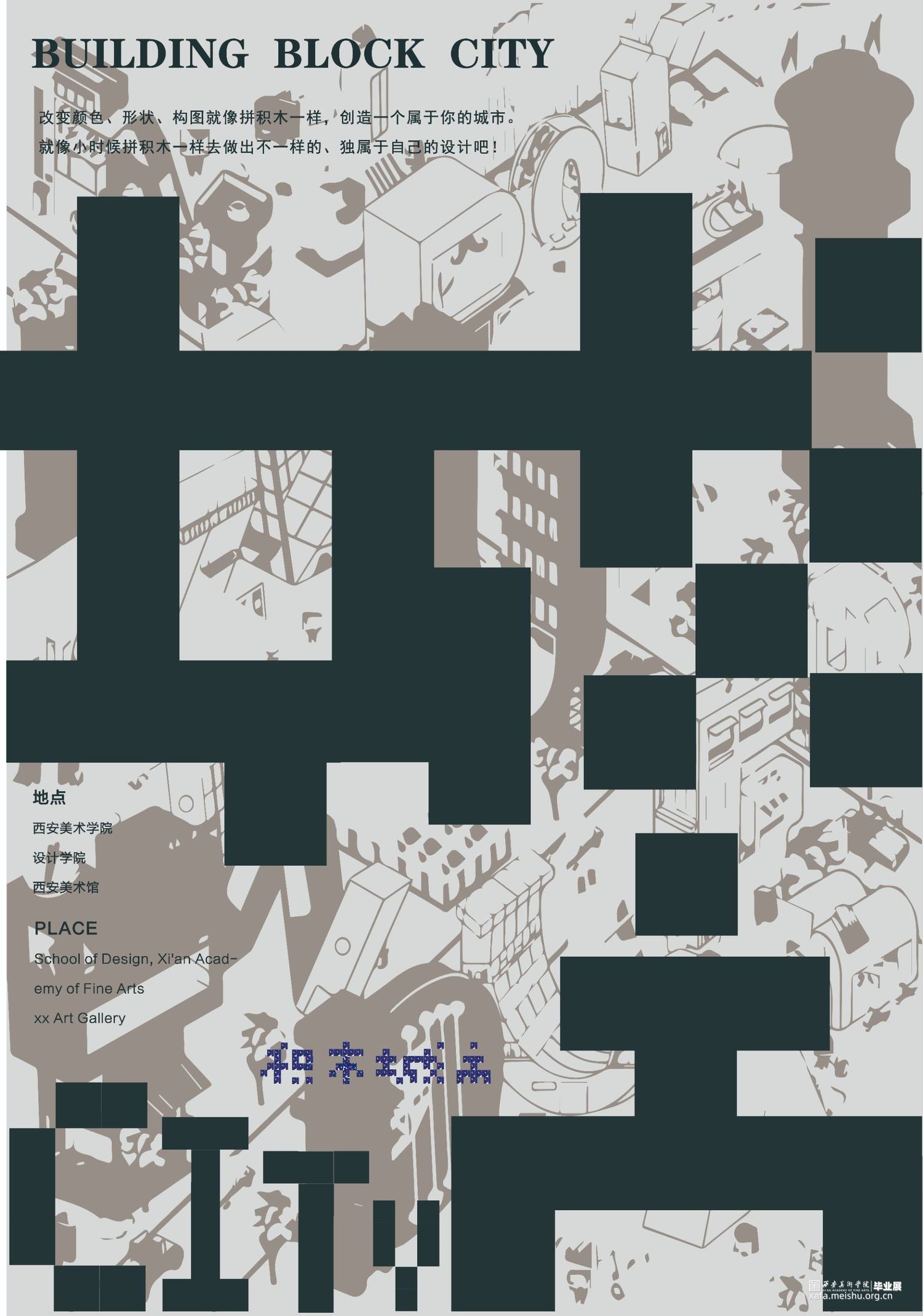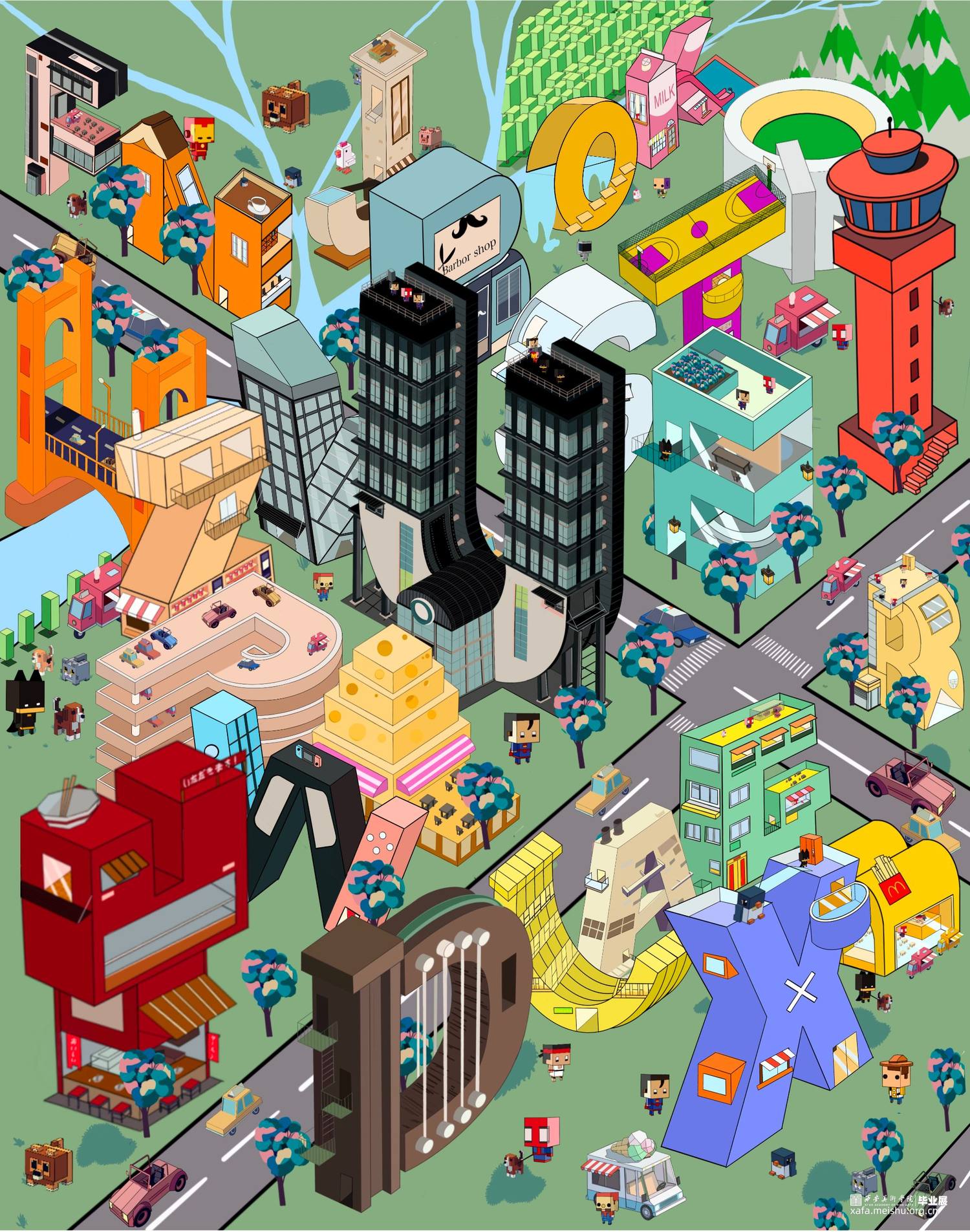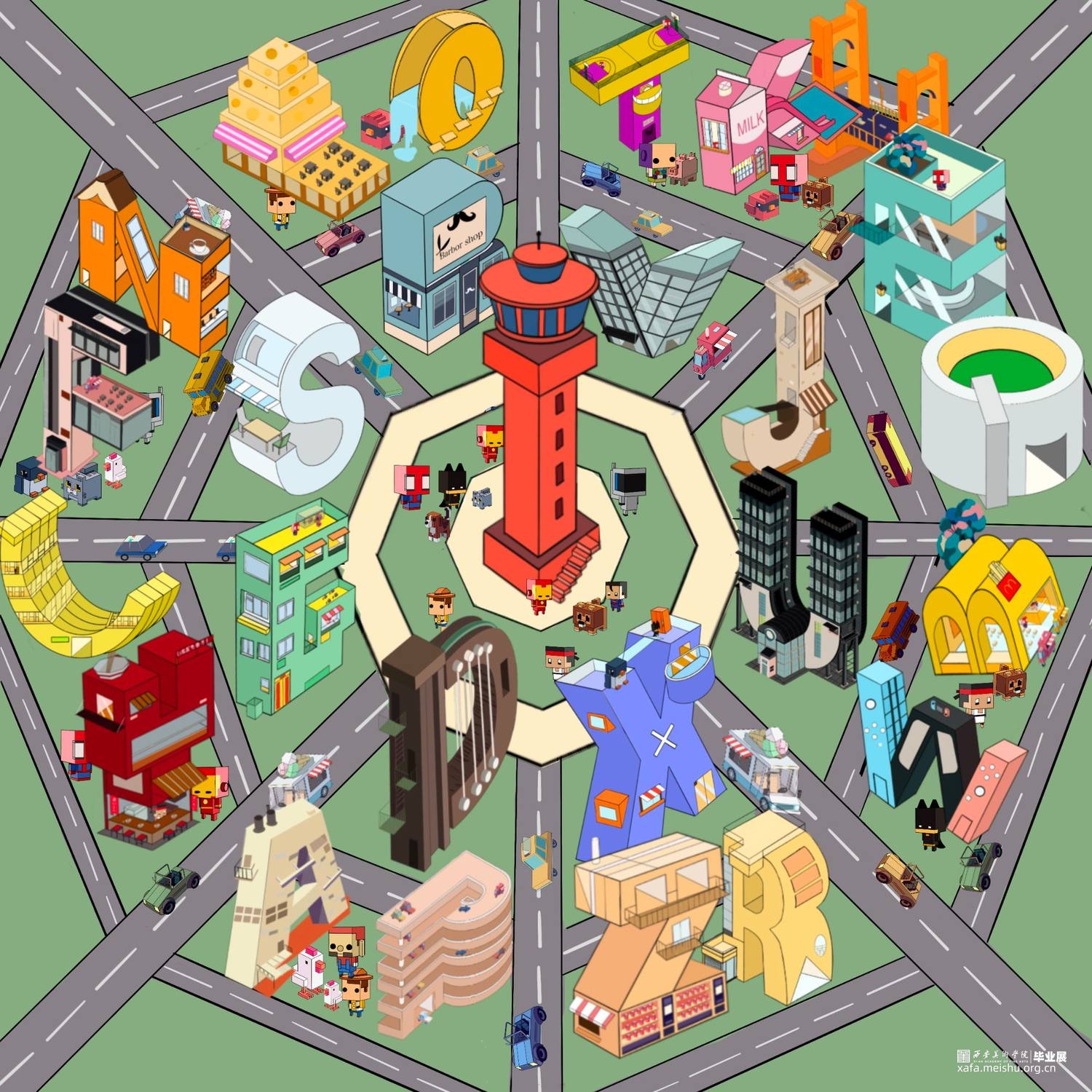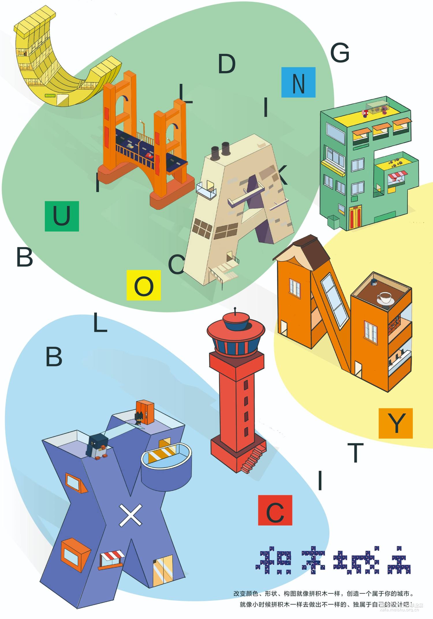 《积木城市》是对字体设计立体化、材料化的一次创意探索。选择这个主题的目的是想去激发想人们的想象力,不局限于形状与规则,打破束缚人们思想的种种枷锁。现在的人们经常被局限在一个角落之中,越长大越死板,被自己的认知所束缚,难以寻求突破与创新。所以我希望通过积木这种人们从小就接触过的小玩具积木去重新唤起人们孩童时的奇思妙想和无限的创造力。