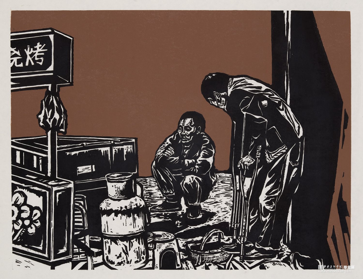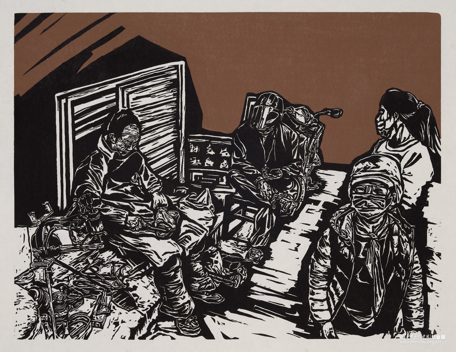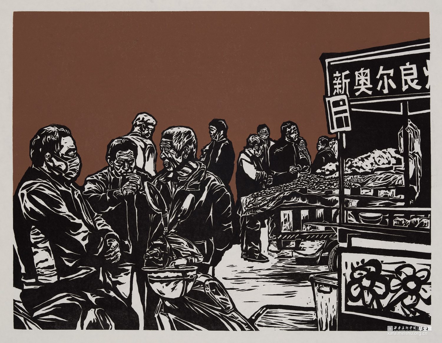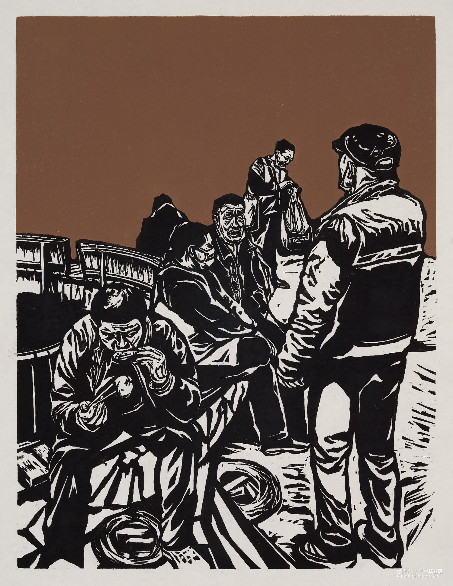 以当代人群生活现状、日常出行与作息等活动在木刻中的表现作为表现对象。通过聚焦当代城市人群的生活现状,重点刨析城市生活图式在木刻语言中的呈现,用作品描绘人们在各种生存压力下的不易和坚毅果敢的优秀品质,使作品所传达的意义拉近与人们的距离,从而引起观者的共鸣,并将当代生活中的人群与木刻艺术相结合,表达人民生活的方方面面,作品以套色木刻的表现方式刻画当代人群的生活面,用关怀与关爱的艺术情感使观者感受到作品中的一缕阳光与无线的希望。
