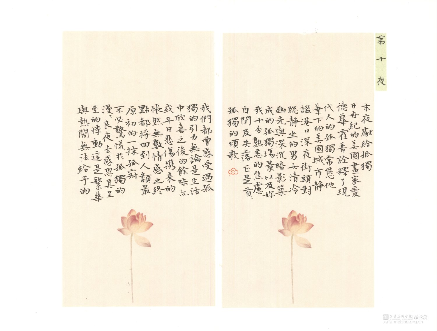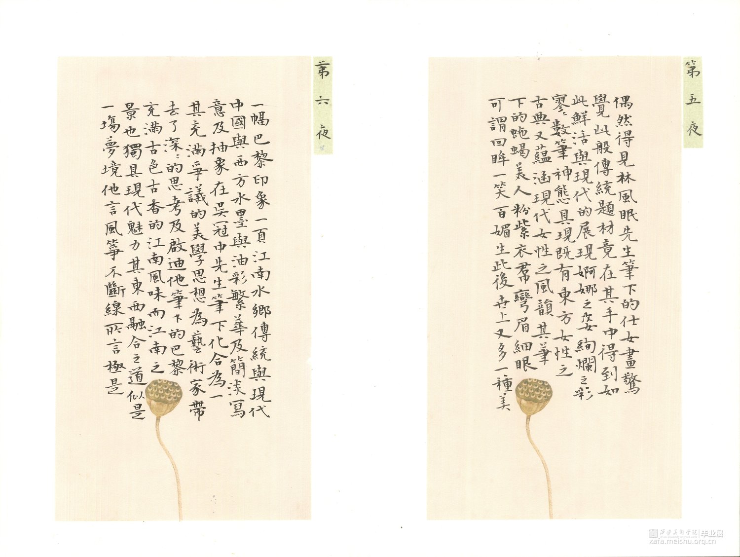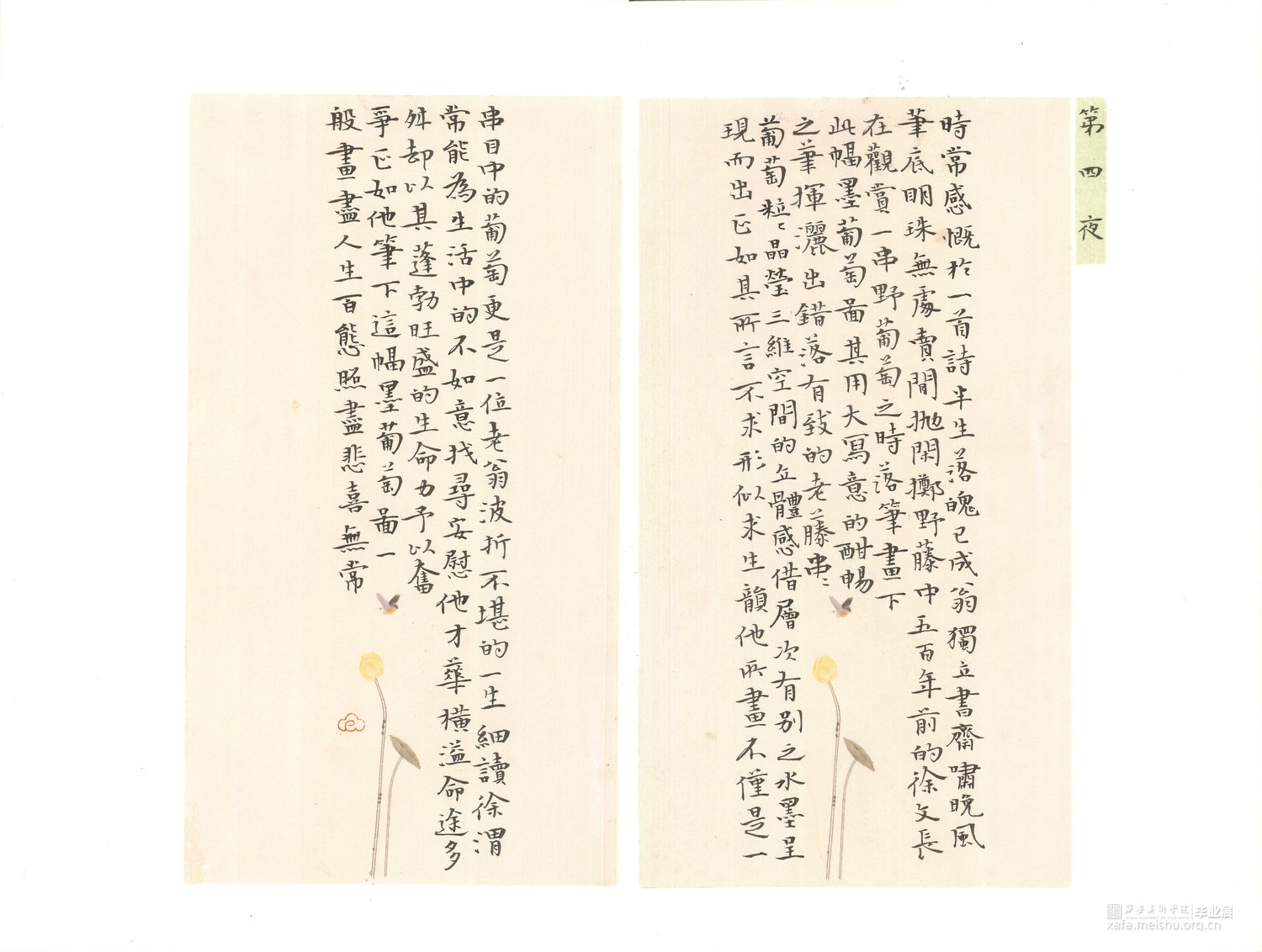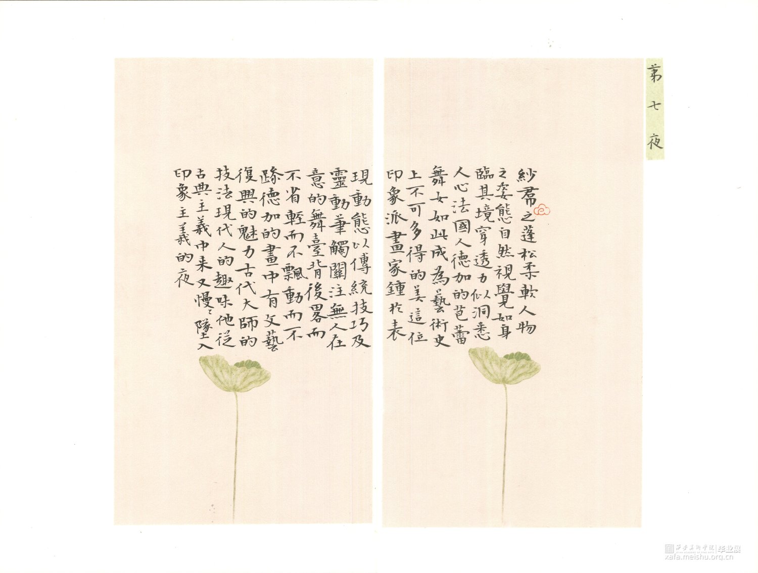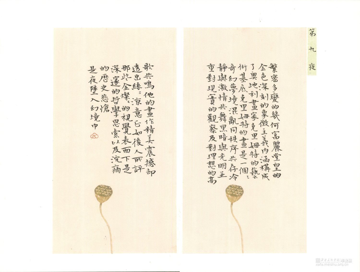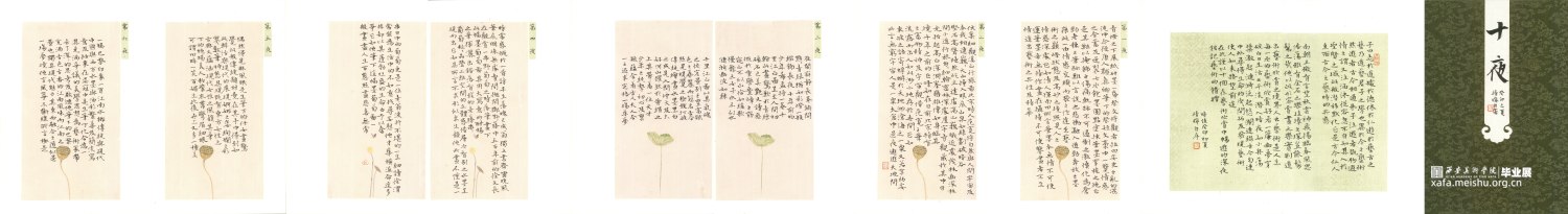 小楷册页全长484cm,共20页,以《十夜》为题,共录十篇赏艺小文,以晋人小楷为宗,又融明人笔意,尚得其味,浅尝其趣。小文以暗夜为题,将体味艺术之时刻喻作畅游的深夜,对十位艺术家及其作品进行艺术赏析,心得感想撰为拙文,感念艺术之无上创造,以此小结美院四载光景中数个深受艺术滋养的时刻。