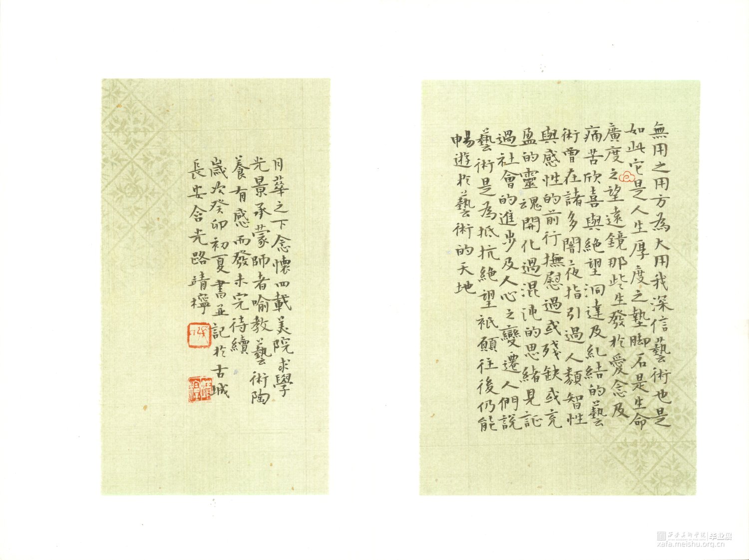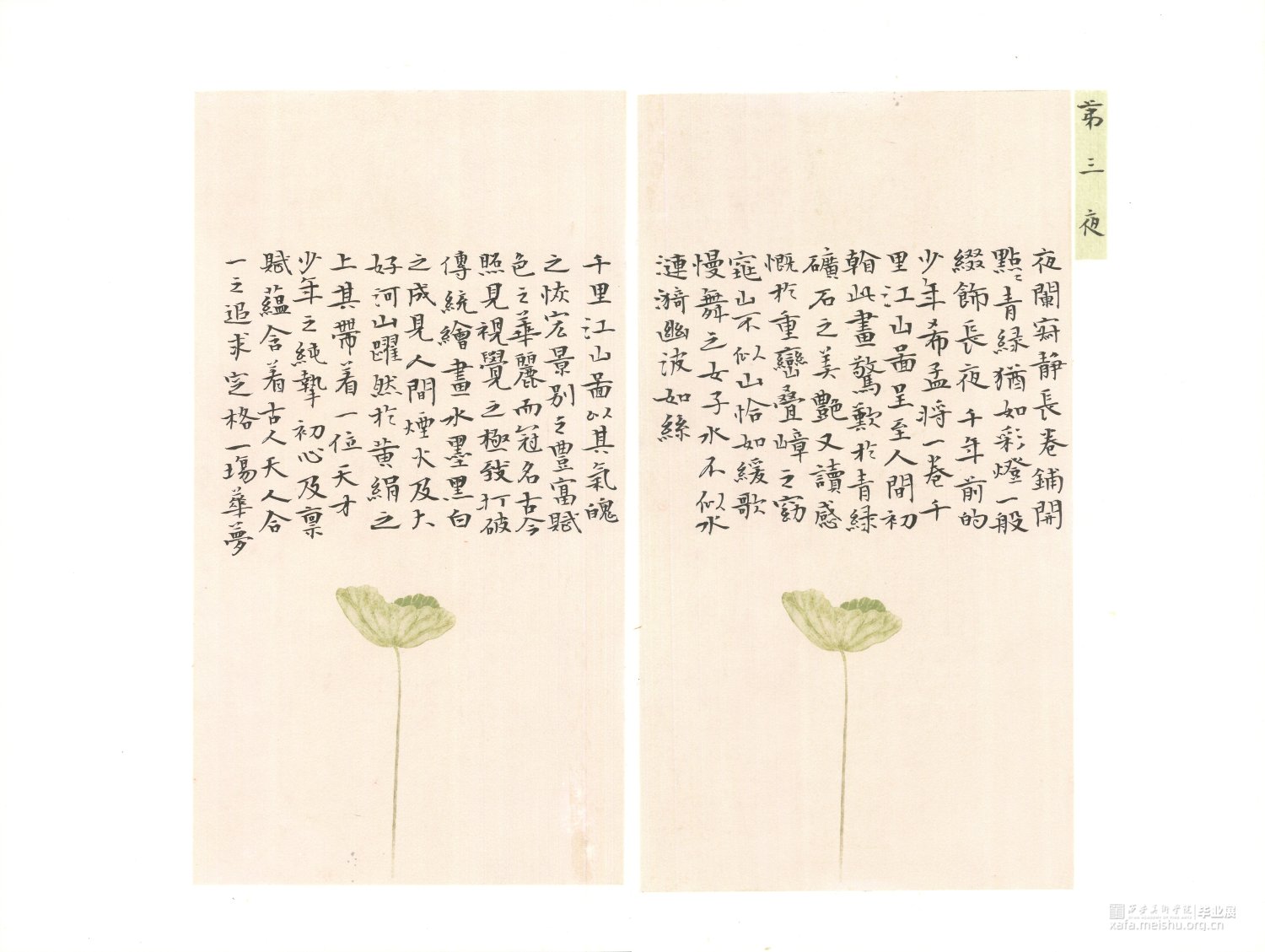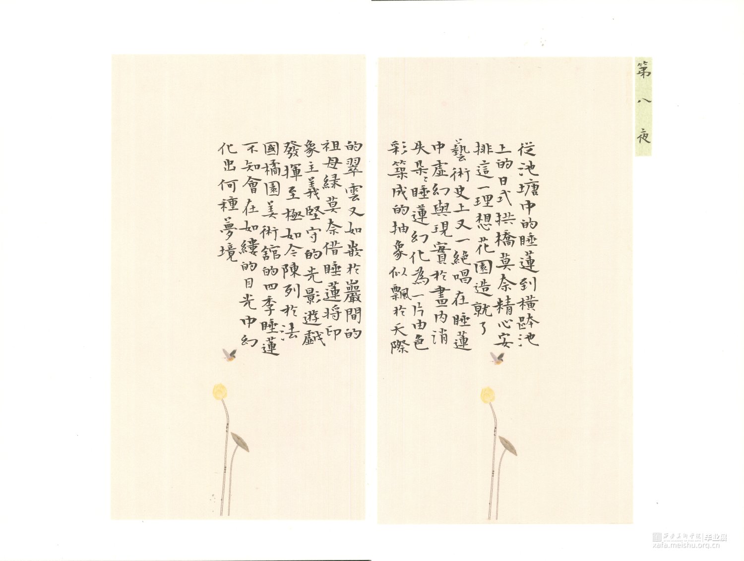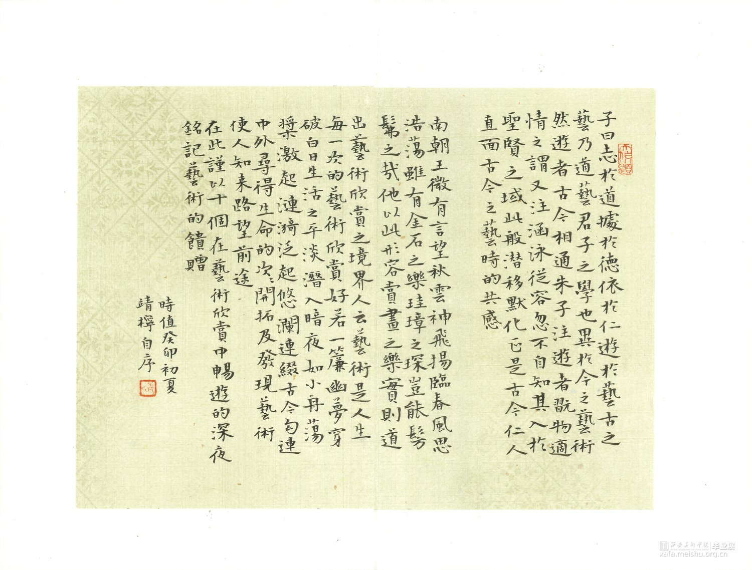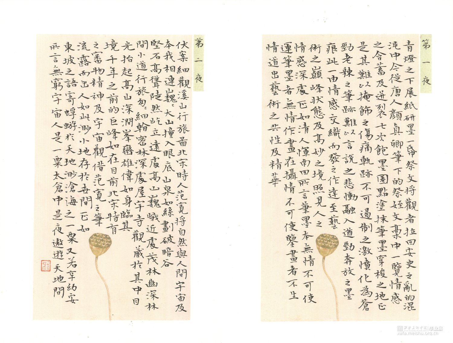小楷册页全长484cm,共20页,以《十夜》为题,共录十篇赏艺小文,以晋人小楷为宗,又融明人笔意,尚得其味,浅尝其趣。小文以暗夜为题,将体味艺术之时刻喻作畅游的深夜,对十位艺术家及其作品进行艺术赏析,心得感想撰为拙文,感念艺术之无上创造,以此小结美院四载光景中数个深受艺术滋养的时刻。