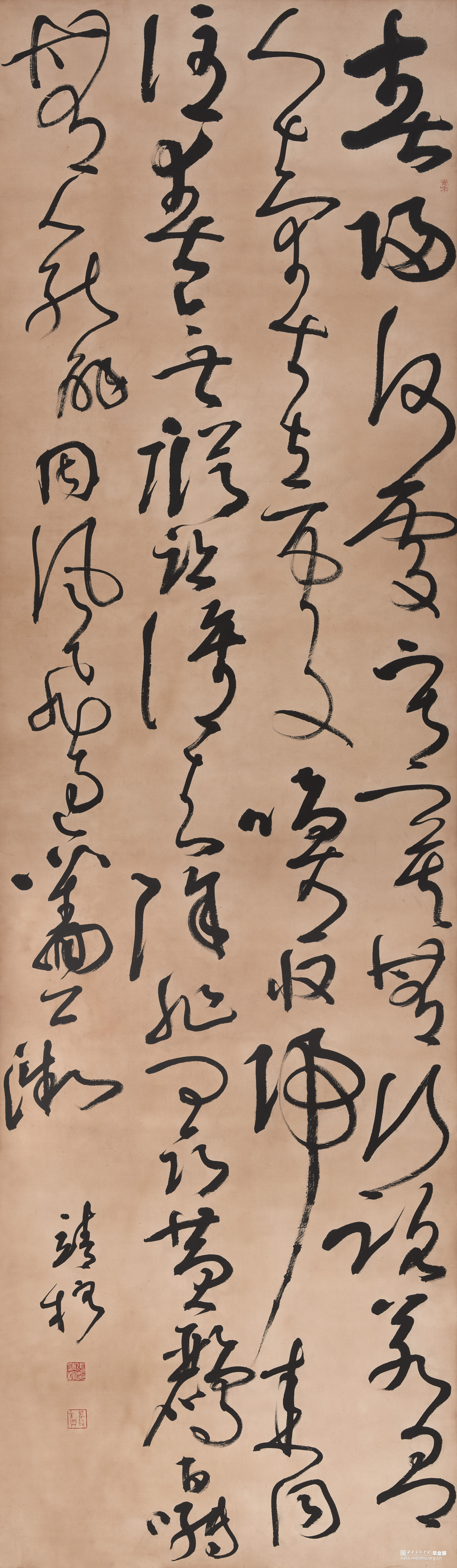 草书立轴长240cm,宽70cm,录宋人黄山谷《清平乐》一首,以张旭大草笔意写就。求学四载,蒙疫三秋。今春阴霾渐散,阳光和煦,颇有守得云开见月明之意,然春意正浓却稍纵即逝。此词以惜春为题,正合此时此地此景此情,故书之。