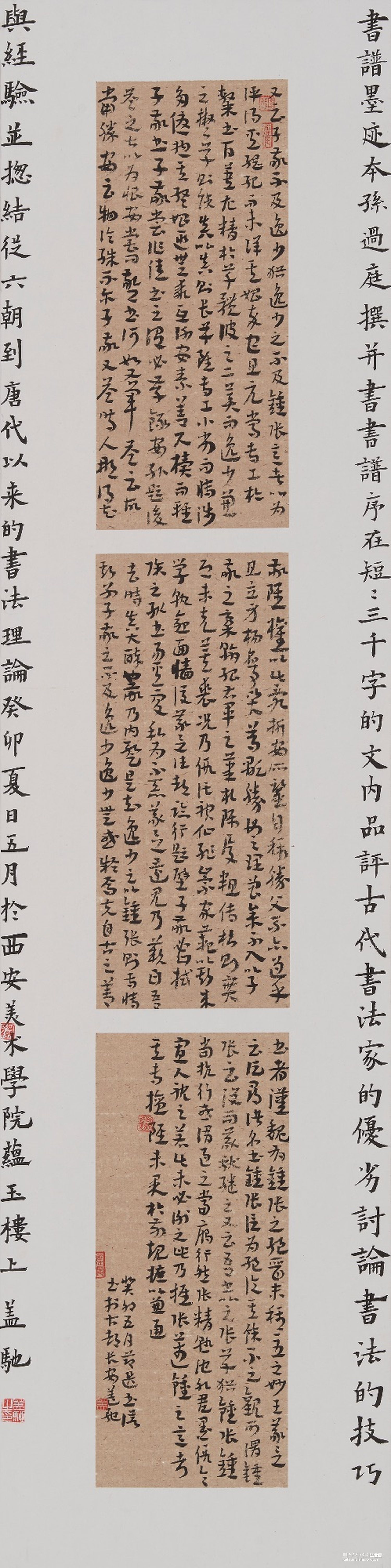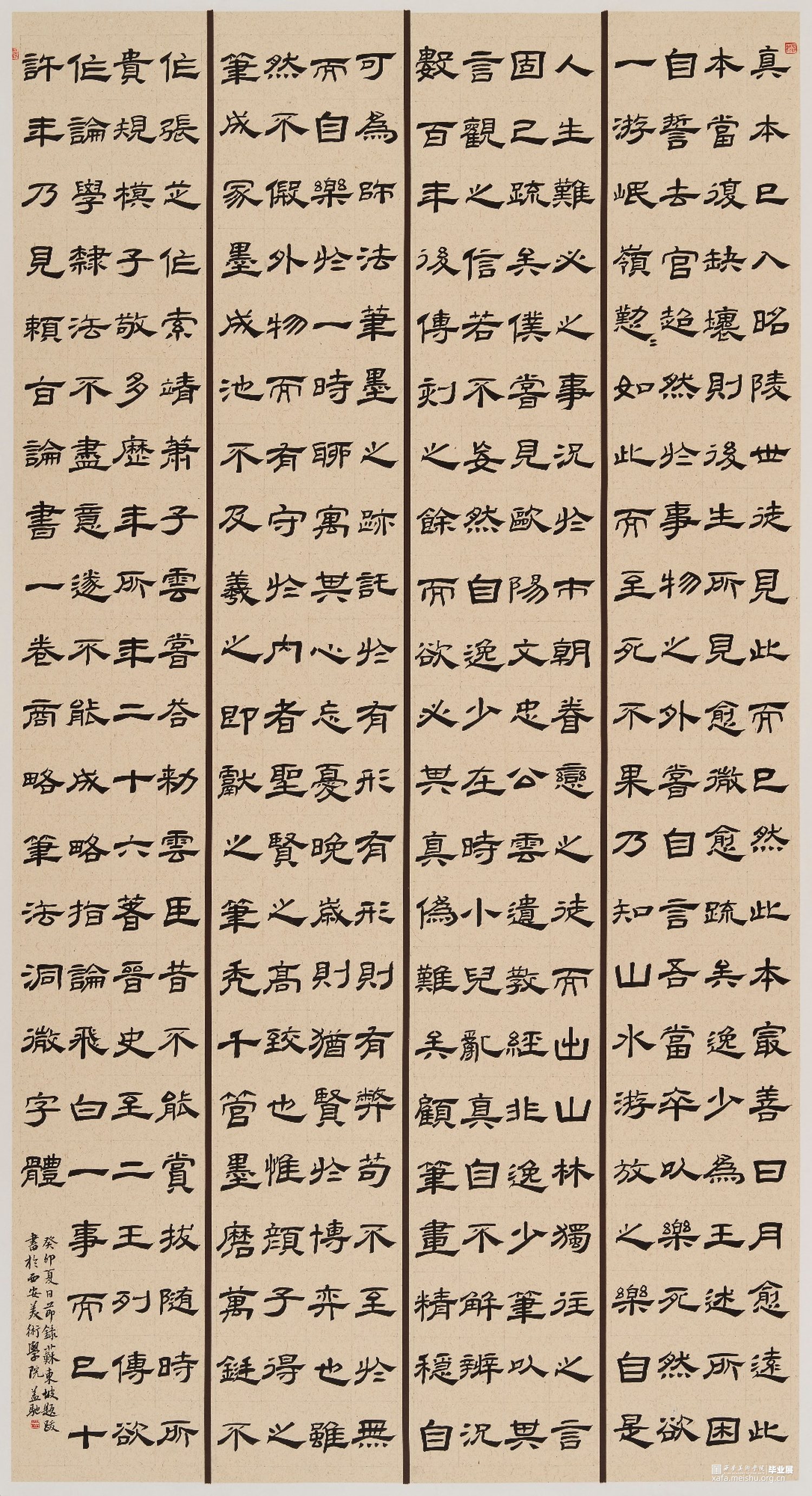 此作品采用四条屏拼接形式,所选内容为苏东坡题跋数则,参照乙瑛碑风格进行创作,追求文雅大方、平正秀逸的艺术表达效果。