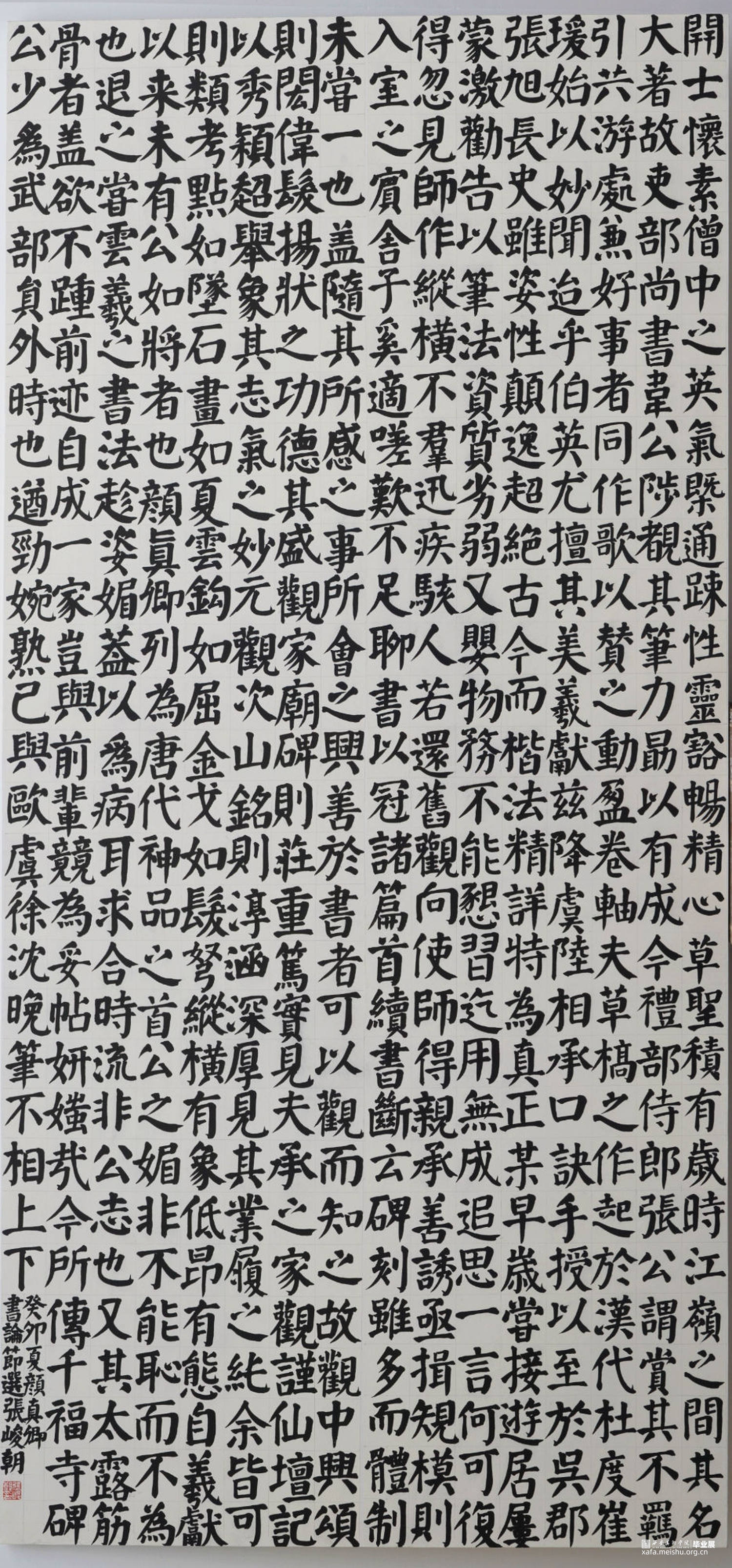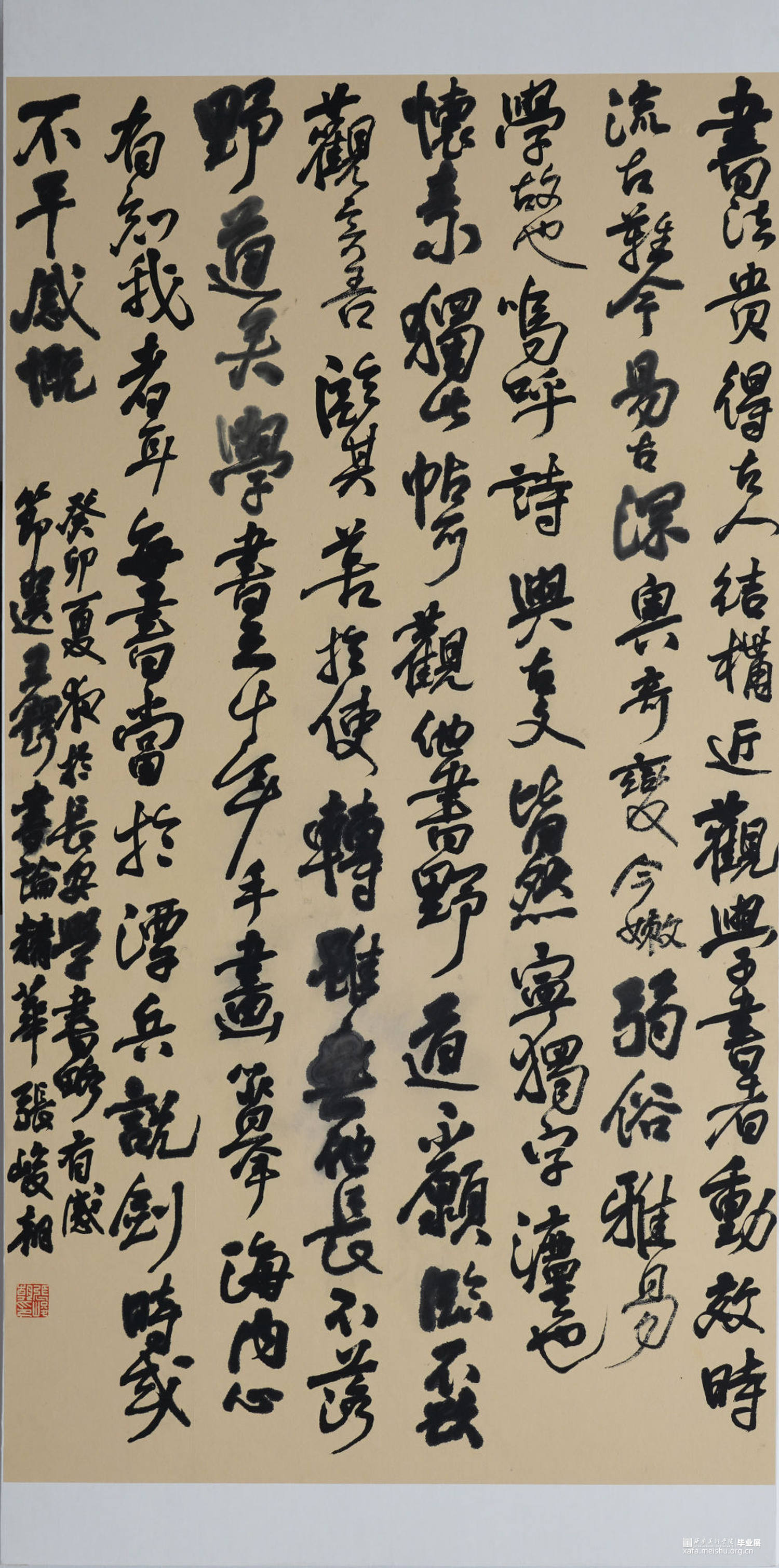 楷书以颜真卿书论怀素上人草书歌序节选与朱长文的续书断为创作内容,以颜氏家庙碑为主,加以勤礼碑,李玄靖碑等其他字体为辅进行创作,行书以王铎书论精选为主要创作内容,加以自我对学习王铎的理解,创作时多运用水墨相生,将王铎涨墨,淡墨大小穿插关系等于作品中进行体现