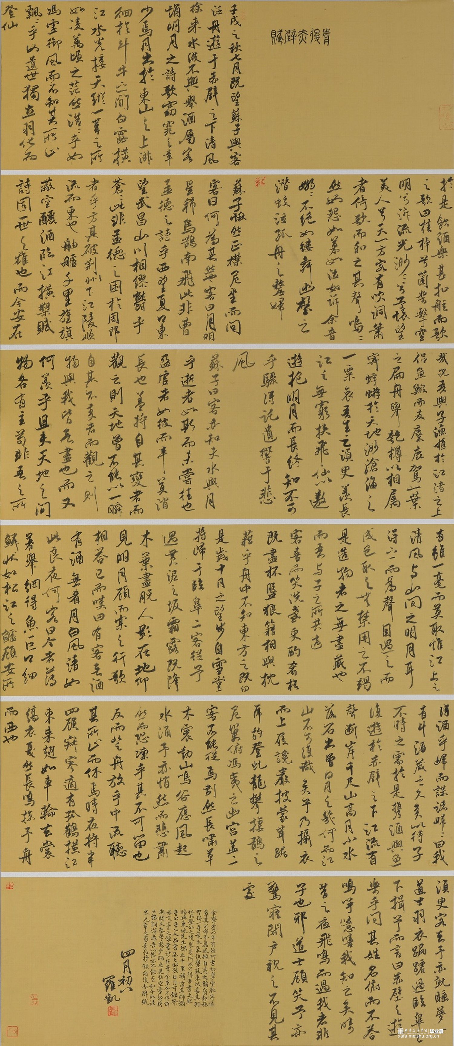 大作品以米元章行书笔意为基调,参以苏东坡体势,求晋唐元明诸家之韵致法度。小作品则主要以虞世南为宗,参以欧褚二家楷法。篆刻作品以画印融合的方式进行创作。