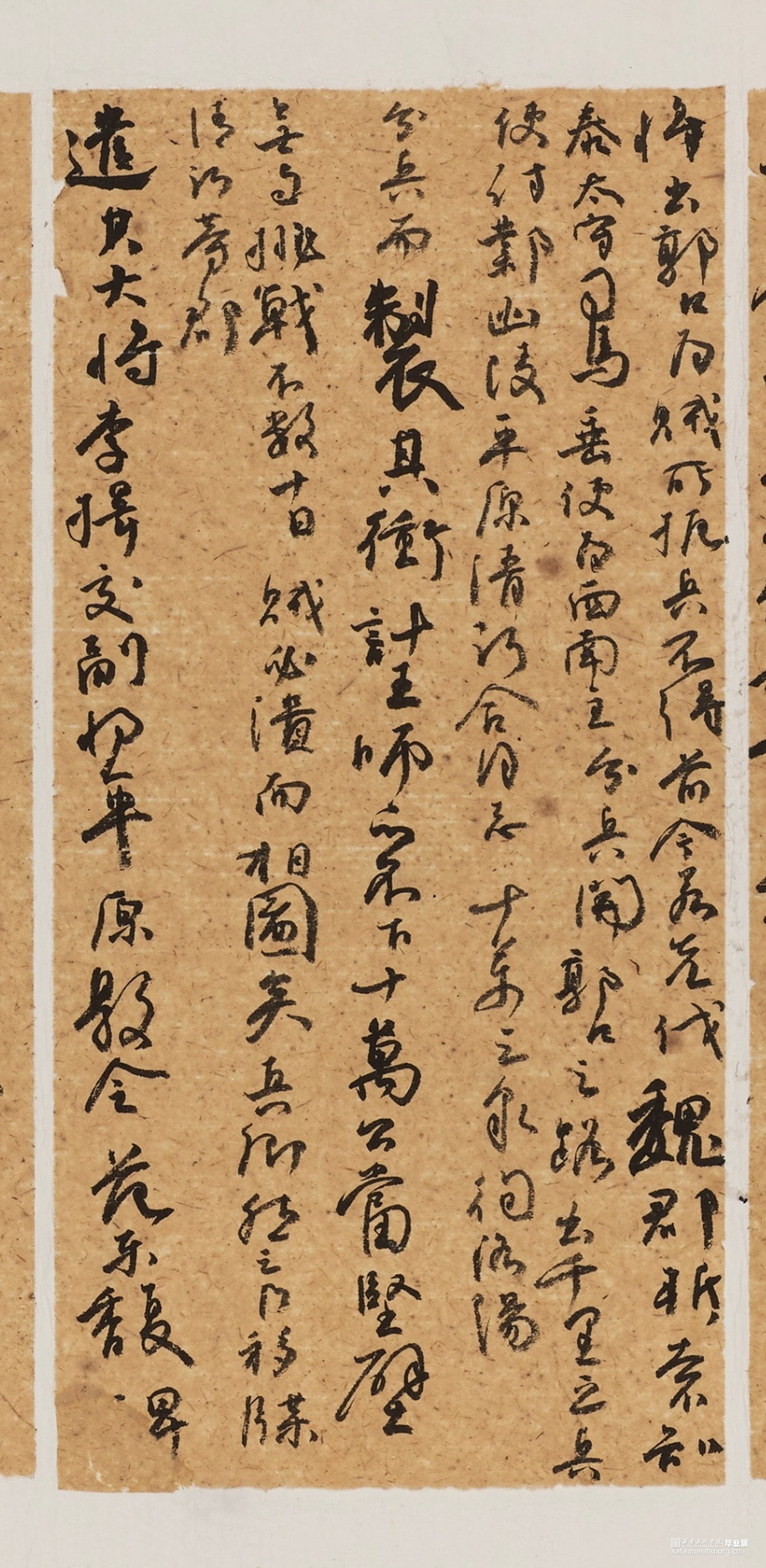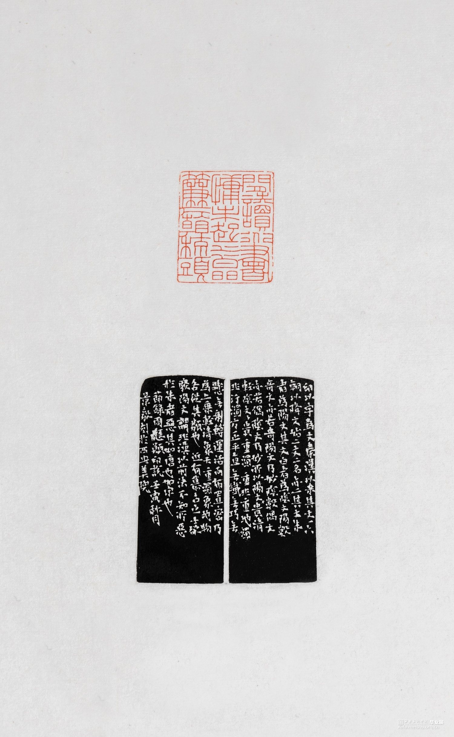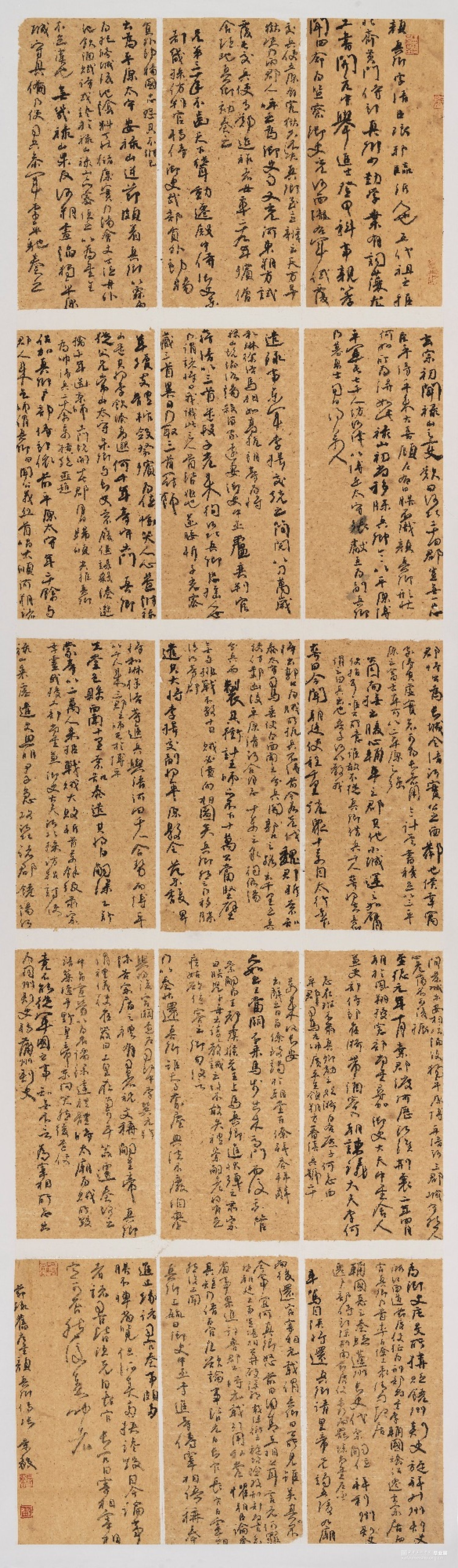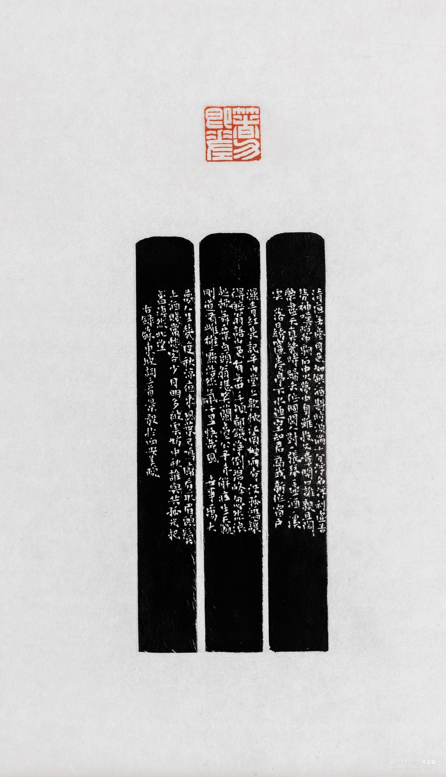 1、此件作品节录《旧唐书·颜真卿传》,参鲁公行书笔意书之,用笔追求鲁公“篆籀之气”,表现出线条的厚重滞涩,亦不失松动;章法上采用立轴拼接形式,借鉴鲁公《争座位帖》穿插挪让摆动,加强整体墨色对比,表现书写节奏与情绪的涨落。