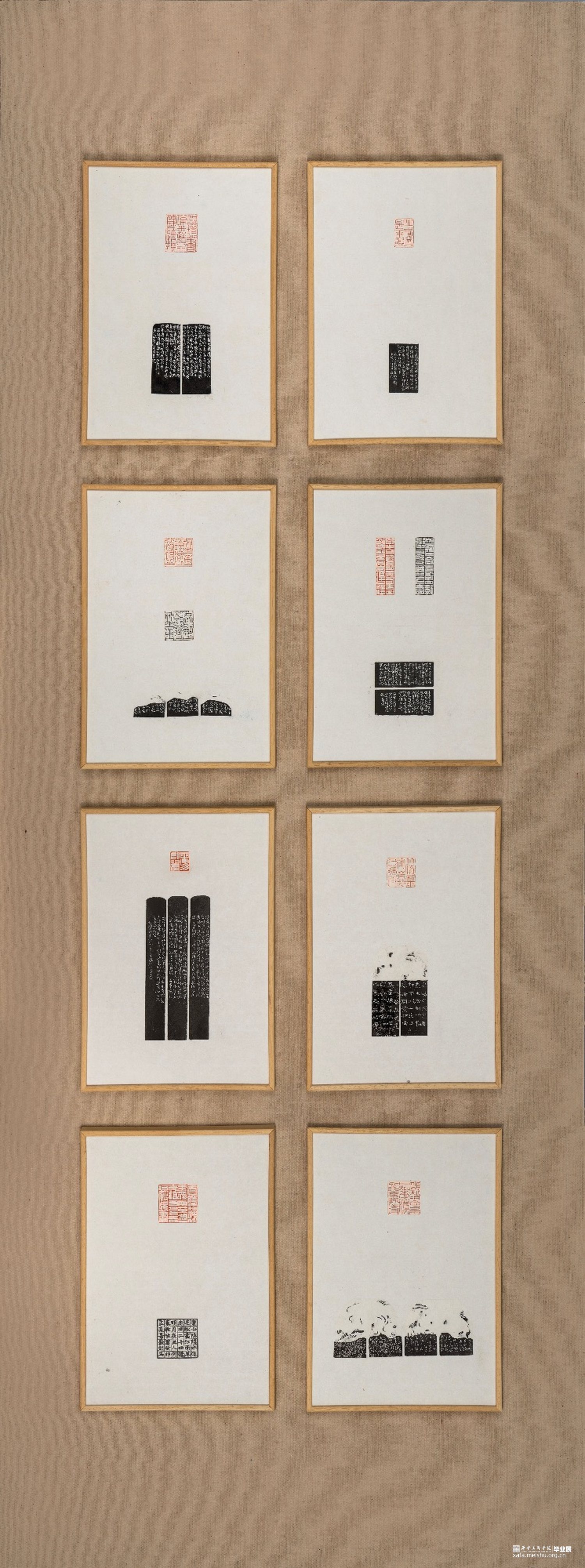 3、此件印屏八印八款,主要取法王福庵、陈巨来风格篆刻,内容多为古诗词句及周恩来语录,整体追求恬静淡雅的表达效果。